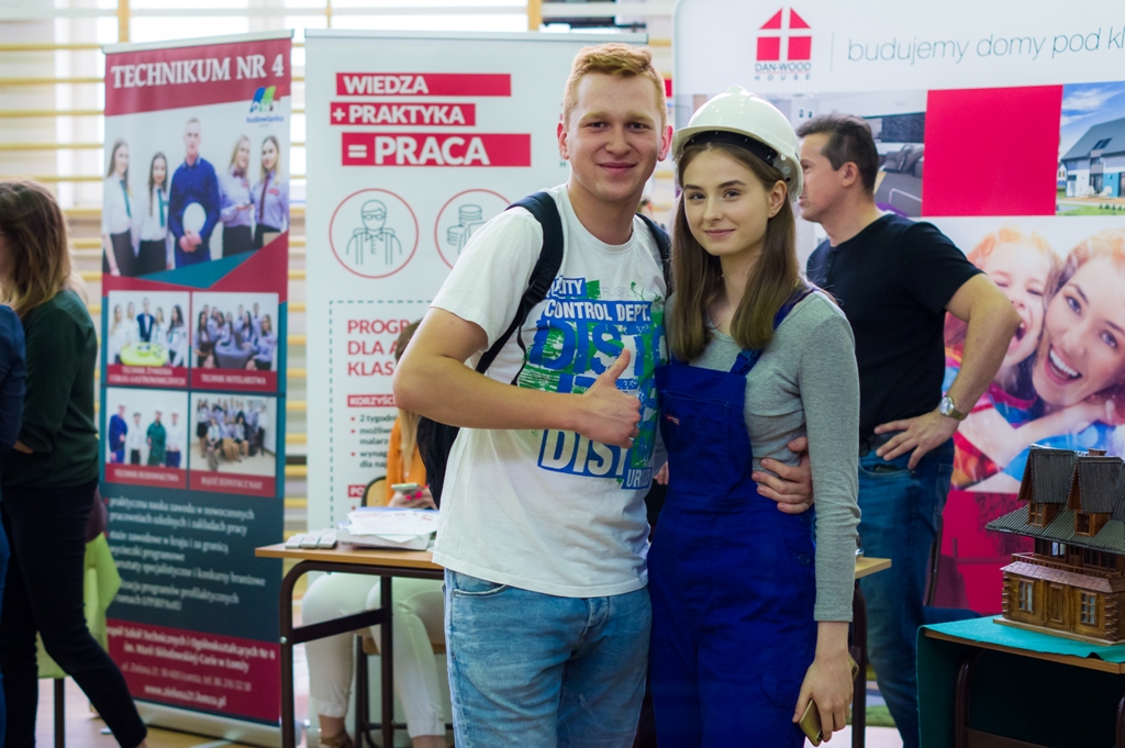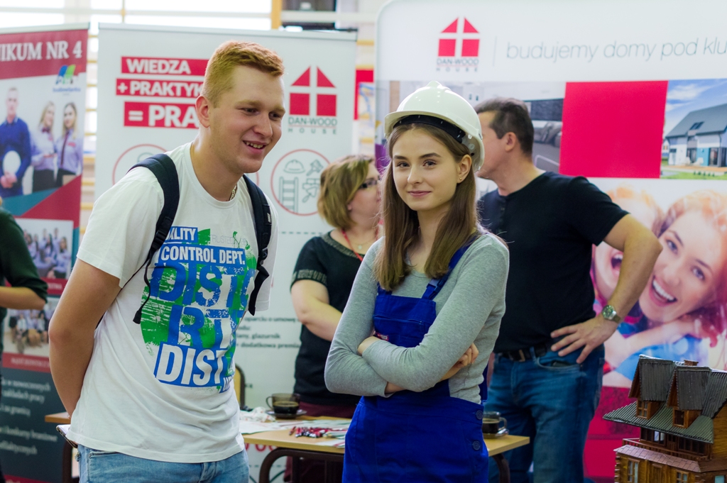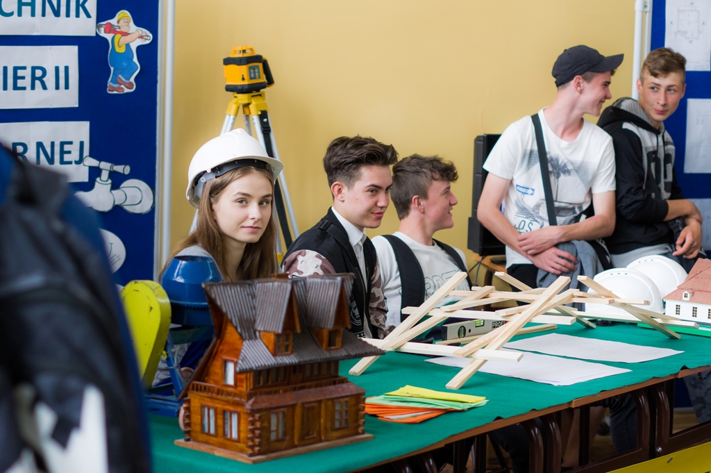Na stoisku branży budowlanej przygotowano makiety domów jednorodzinnych wykonane przez naszych uczniów, a także ekspozycje z betonu projektowego, niwelator basenowy, roboczy strój budowlańca oraz komputerowe projekty budynków. Przybyłe na spotkanie panie z firmy DAN - WOOD house współpracującej ze szkołą (p. Marzena Choińska, p. Karolina Klicka, p. Paulina Smarzewska) udostępniły ulotki zawierające program szkoleń dla absolwentów klas budowlanych oraz chętnie odpowiadały na pytania naszych gości o możliwości pracy w zawodzie technik budownictwa.