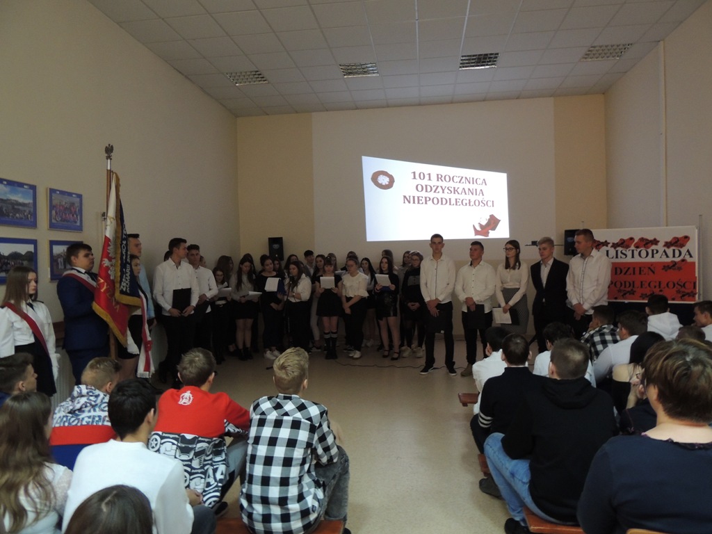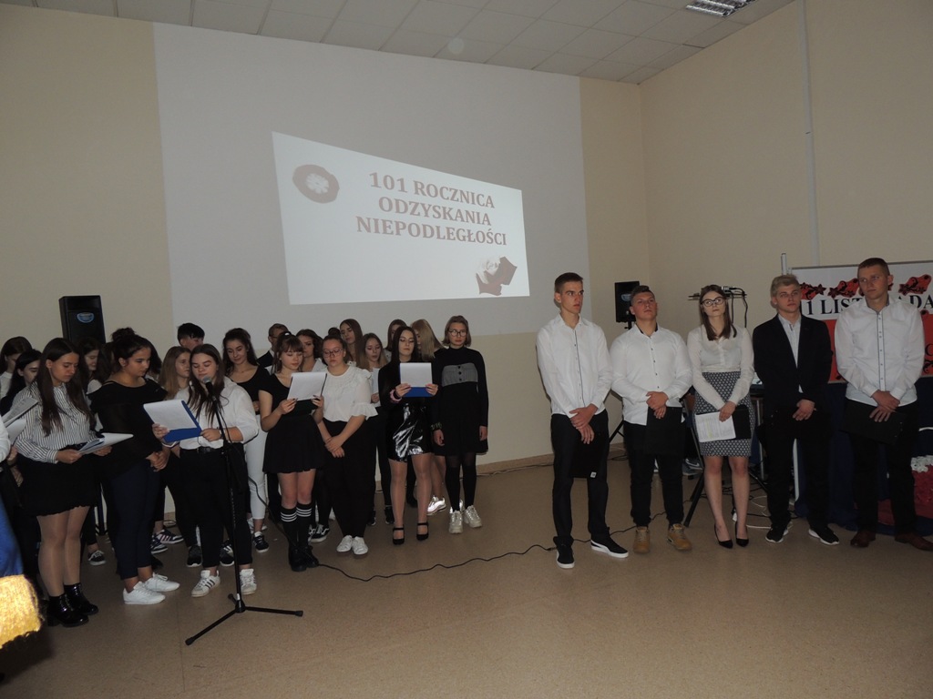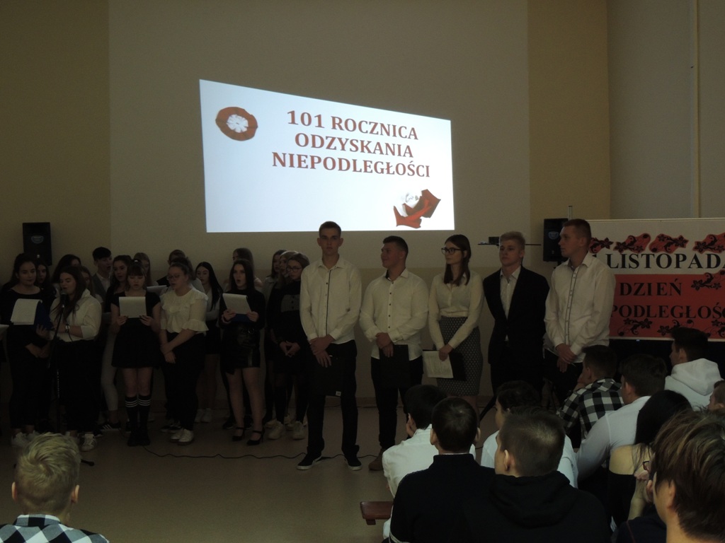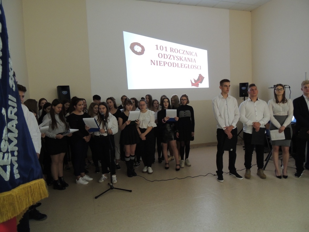 Pieśni patriotyczne wykonywane przez szkolny chór przywołały ważne wydarzenia historyczne związane z odzyskaniem przez Polskę niepodległości.