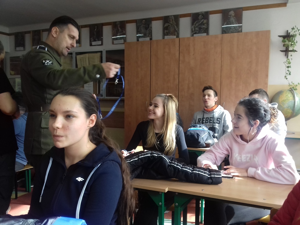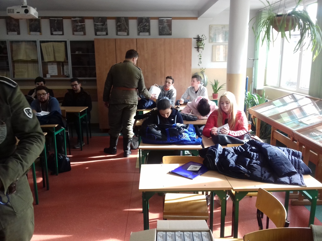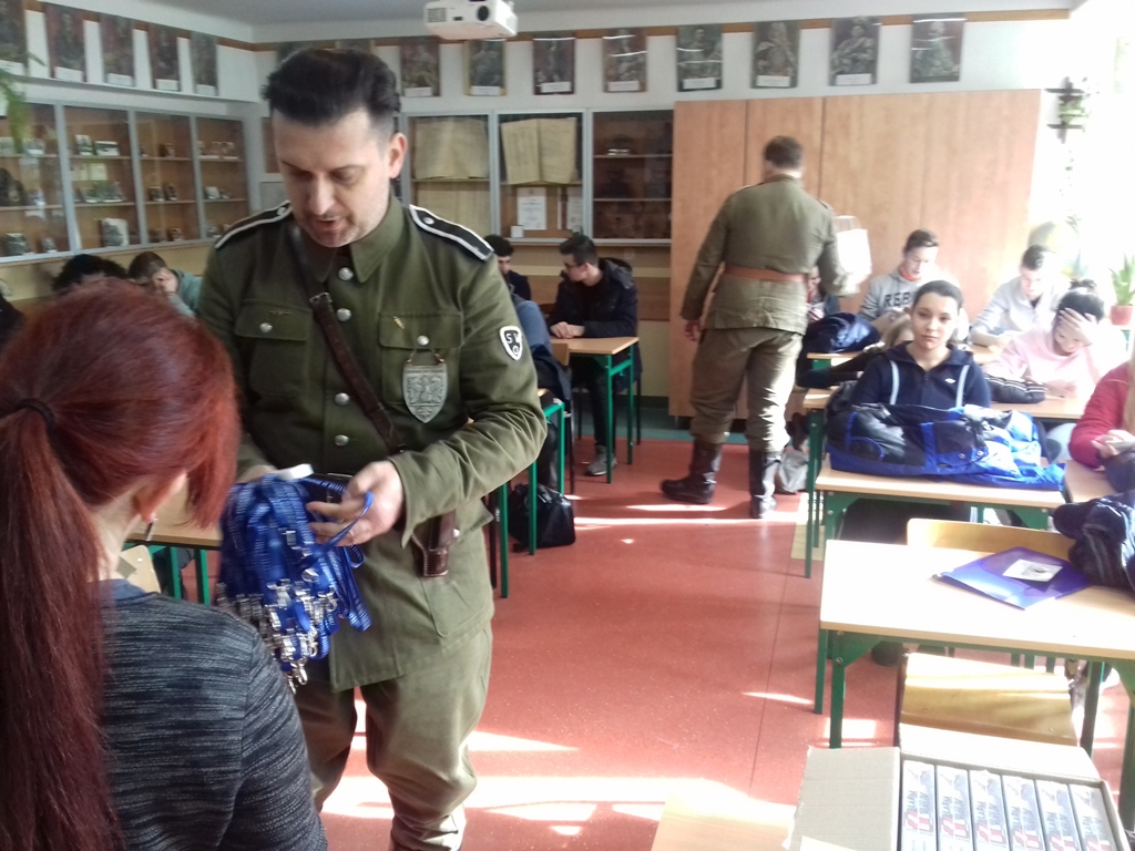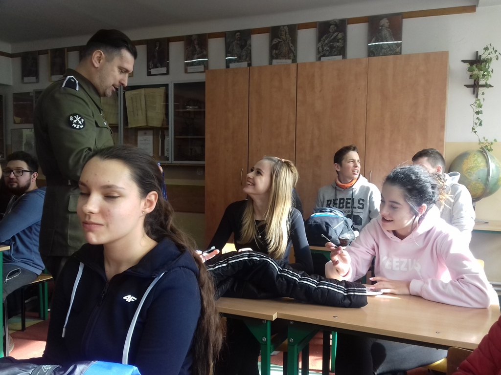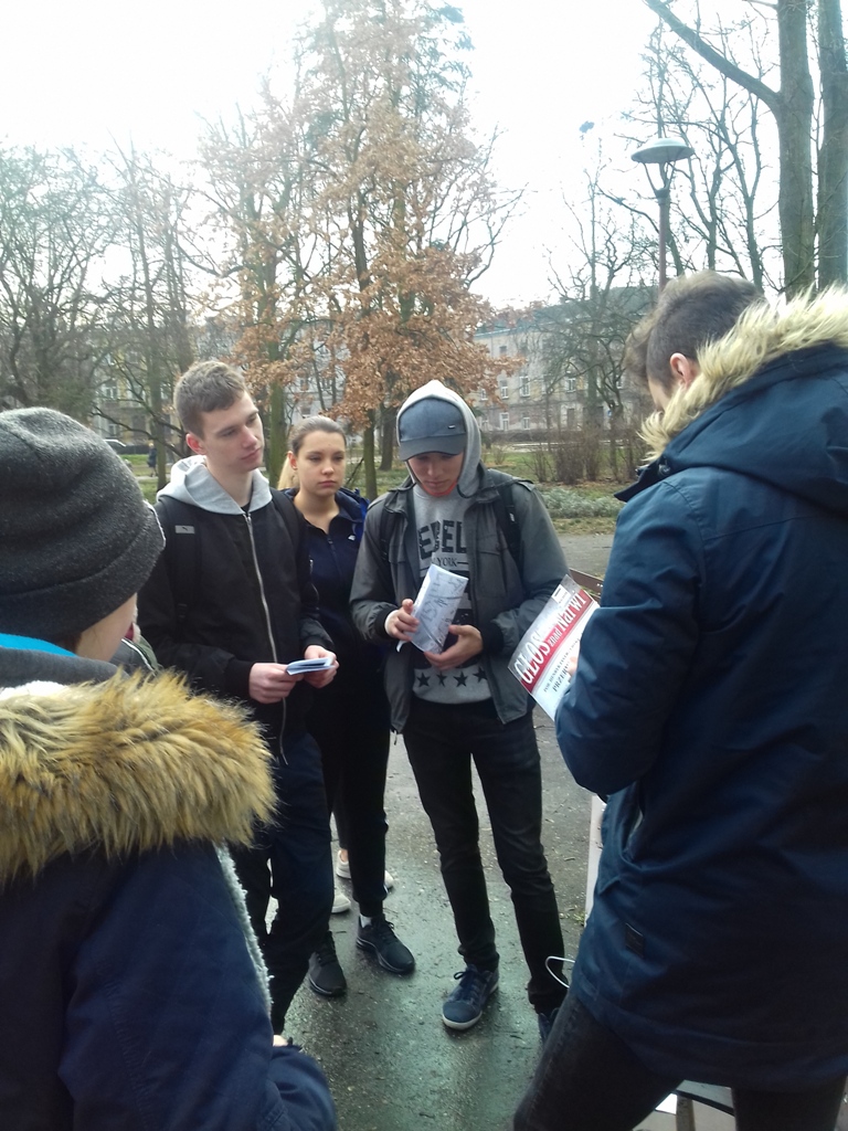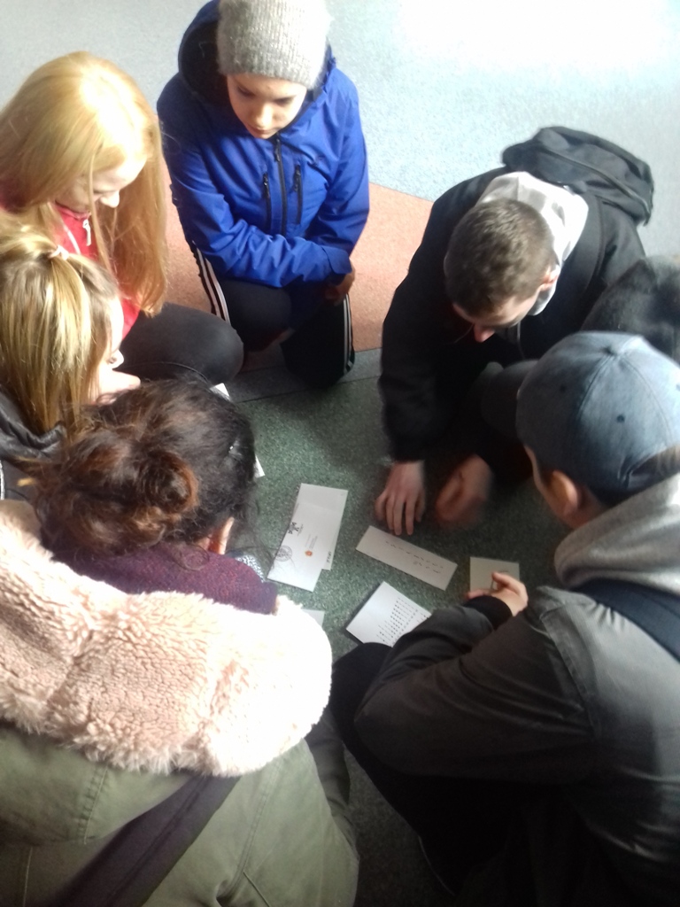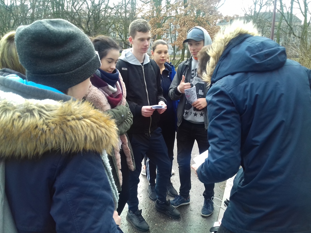 Bardzo miło mi poinformować, że grupa uczniów z naszej szkoły wygrała w dniu 03.03. Grę Miejską - „Łomża 1946”. Gra była zorganizowana przez IPN Białystok przy współudziale ZŻ NSZ Okręgu Łomżyńskiego oraz Stowarzyszenia Kulturalnego "A La Longue". Grupa była pod opieką p. Wiesława Czupryńskiego. Obok prezentujemy zdjęcia z tej ciekawej lekcji historii w terenie. Uczniowie otrzymywali rozkazy do wykonania. Często trzeba było odszyfrować wiadomość pisną alfabetem Morsa lub odcyfrować wiadomość z tablicy wmurowanej w budynek Szkoły Muzycznej (dawnego więzienia). W różnych punktach miasta czekali na naszą grupę tzw. łącznicy. Trzeba było podać im hasło i uzyskać odzew, a znakiem rozpoznawczym była gazeta trzymana przez łącznika. Łącznik przekazywał kolejne rozkazy do wykonania na kartce. Np. trzeba było odnaleźć grób jednego z żołnierzy niezłomnych po odcyfrowaniu kodu z nazwiskiem . Oprócz łączników na mieście pojawili się tzw. dezinformatorzy, którzy podawali fałszywe hasła i pełnili rolę agentów dawnego UB w Łomży. W budynku przy ul. Nowogrodzkiej nr 5 (dawny budynek UB w Łomży) otrzymaliśmy kopie spisów osób zatrzymanych po wojnie i przetrzymywanych na UB i trzeba było policzyć zatrzymanych z rocznika 1928 i młodszych. Zadania były ciekawe i wzbudziły dużo emocji. Poza tym presja czasu i kilometry przechodzone przyczyniły się do poszerzenia wiedzy i wzmocnienia sprawności fizycznej uczestników. Ostatnim punktem było odczytanie hasła, którego litery otrzymywaliśmy wraz z kolejnymi zadaniami. Oczywiście po skończonej grze udaliśmy się na pyszną kawę z opiekunem p. Wiesławem Czupryńskim.