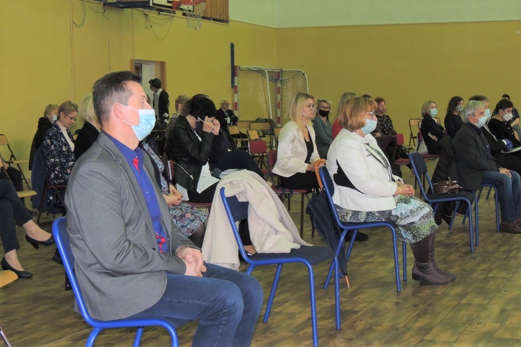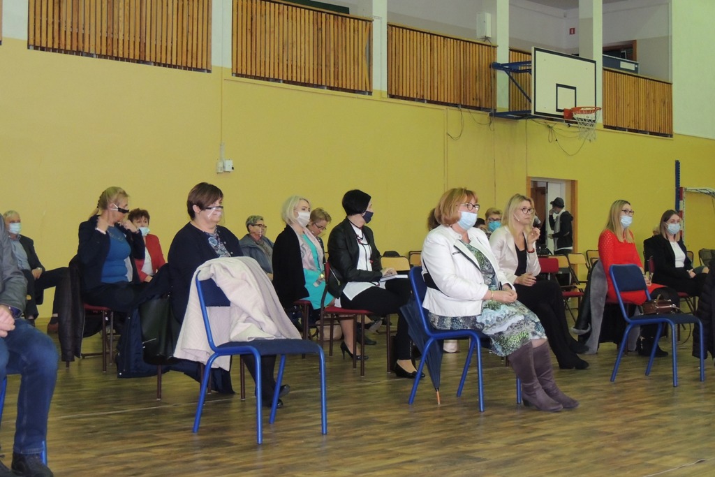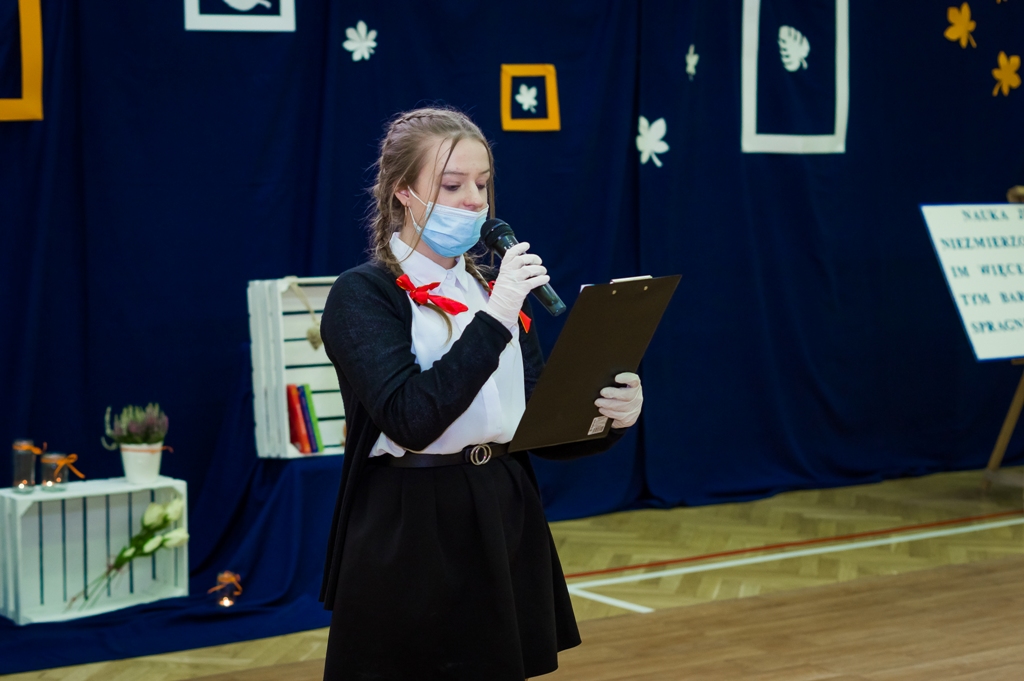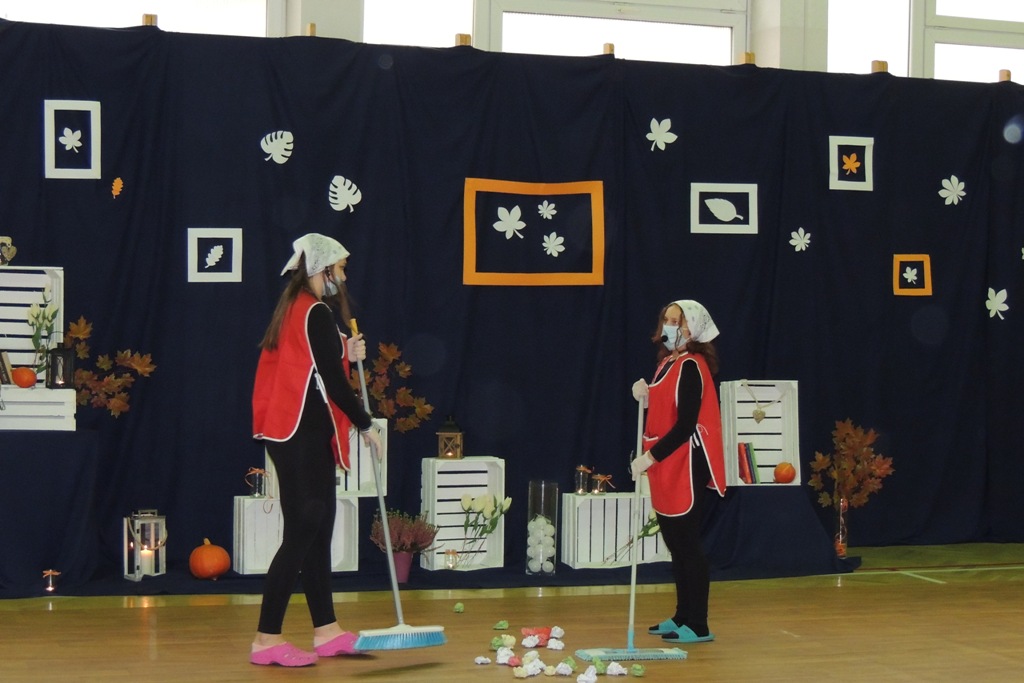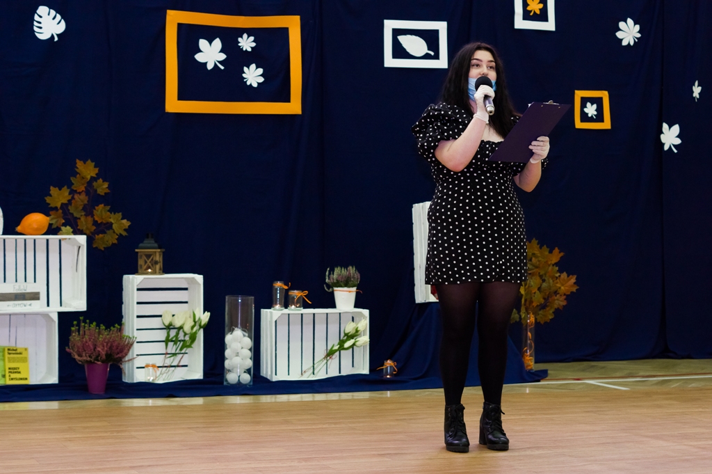 Uroczyste spotkanie na sali gimnastycznej z okazji Dnia Edukacji Narodowej w nastrojowej jesiennej scenografii otworzyła wicedyrektor pani Maria Gawryś, podkreślając znaczenie wychowania i nauki oraz przypominając znane przysłowie „Aby wychować dziecko, potrzebna jest cała wioska”.