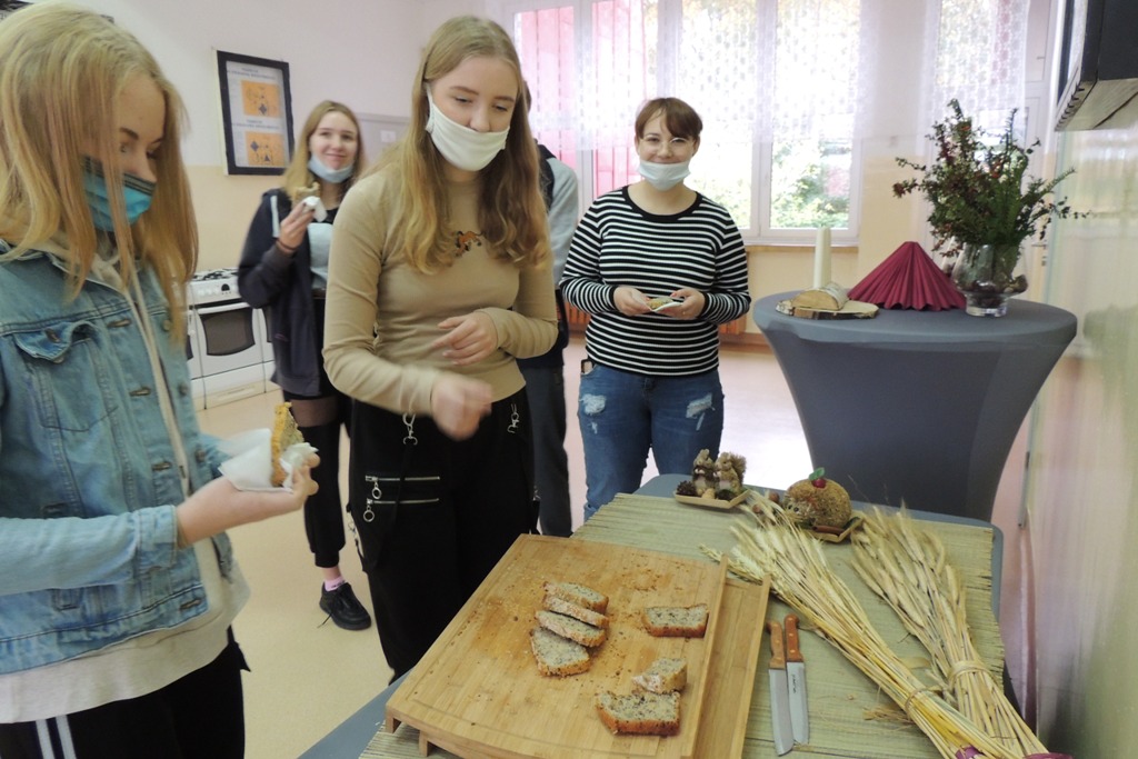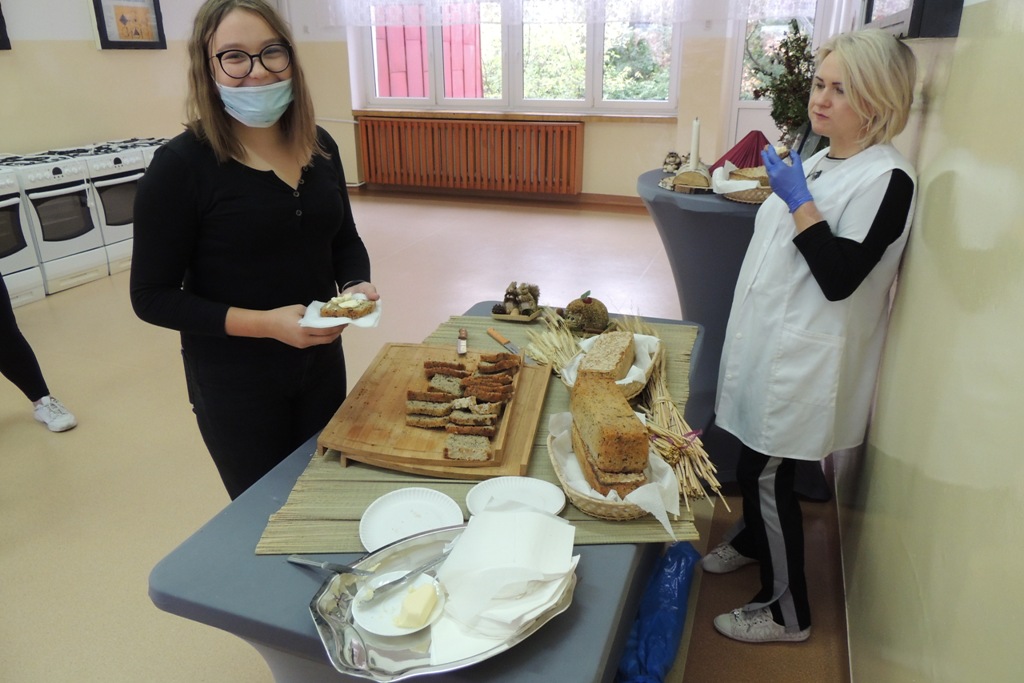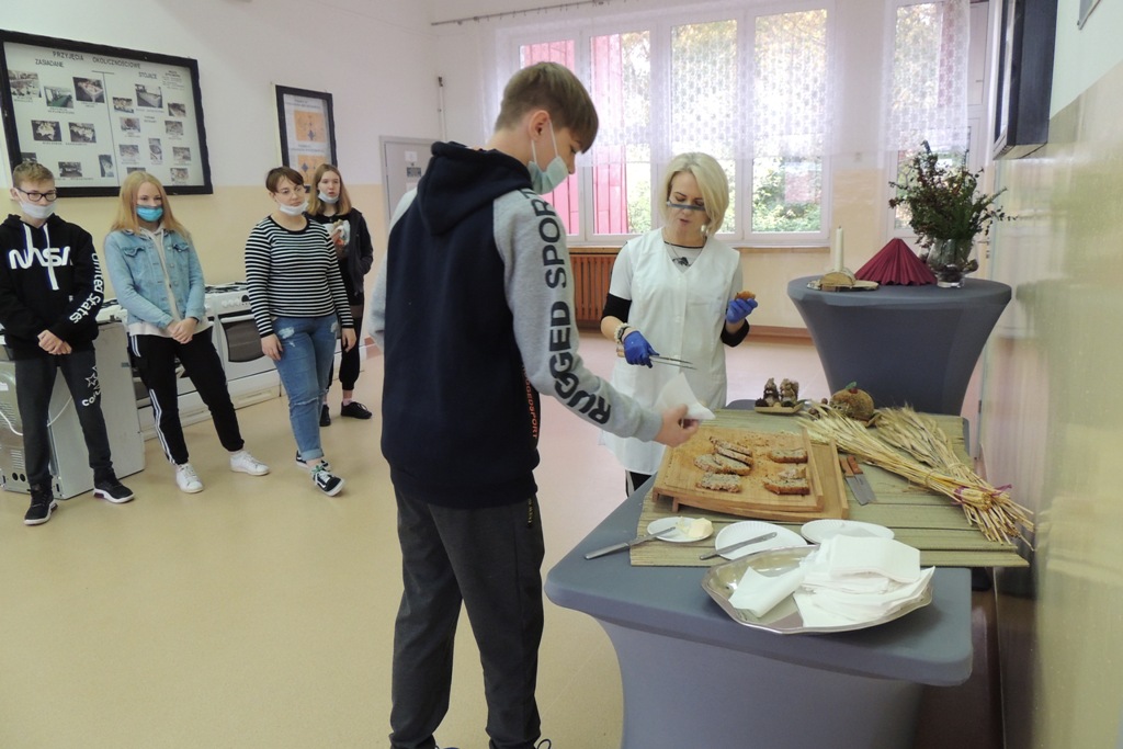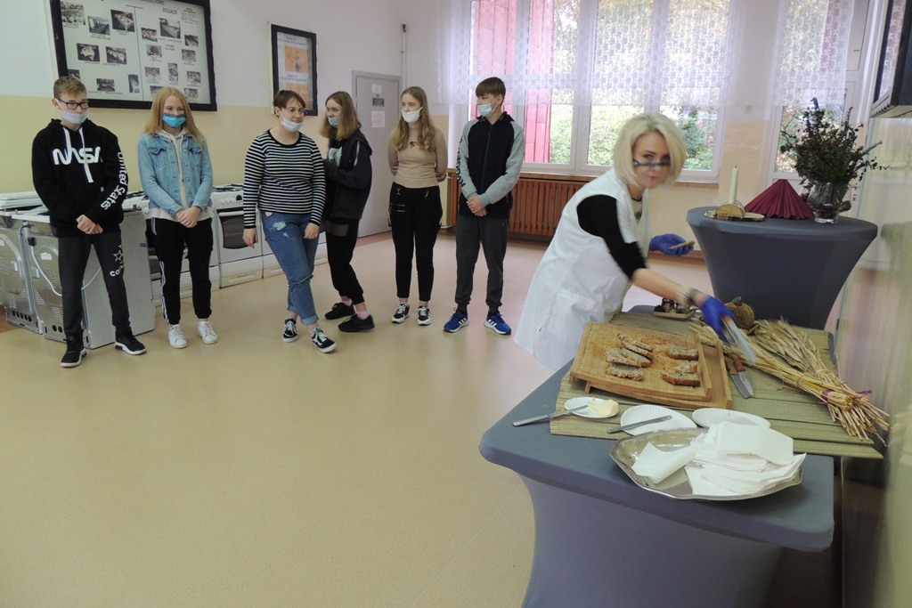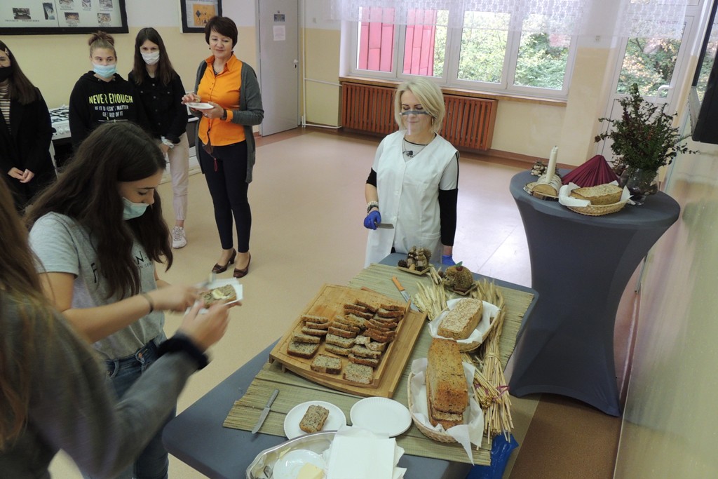 16 października 2020 r. obchodzimy Światowy Dzień Chleba, ustanowiony przez Międzynarodowy Związek Piekarzy i Cukierników. Z tej okazji Panie: Edyta Trzaska i Ewa Bogulas z klasą 2 TŻp zorganizowały warsztaty pt. „Tydzień dobrego chleba i zdrowego stylu życia - szkoła 2020”. Uczniowie branży gastronomicznej poznali proces wyrabiania chleba począwszy od przesiewania mąki, wykonania zaczynu, wygniatania i wyrastania ciasta, dekoracji aż po jego wyjęcie z pieca. Warsztaty pieczenia chleba połączono z jego degustacją, na którą zaproszono społeczność szkolną.