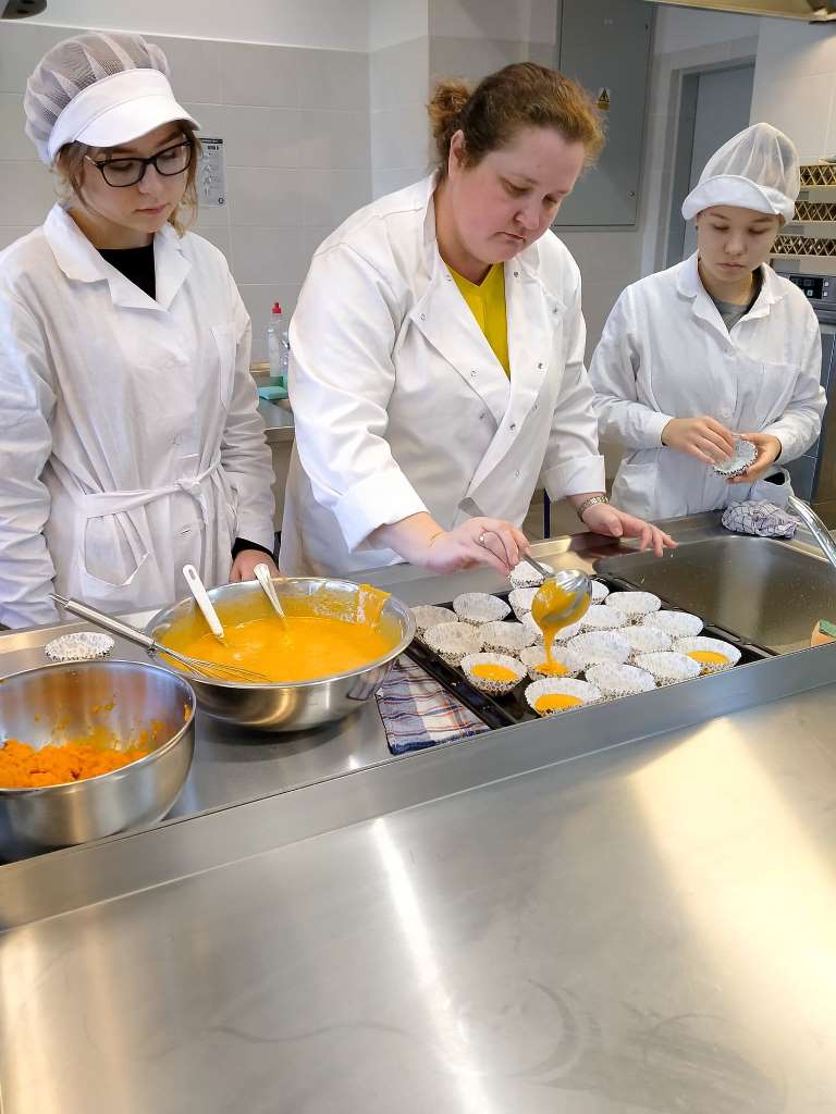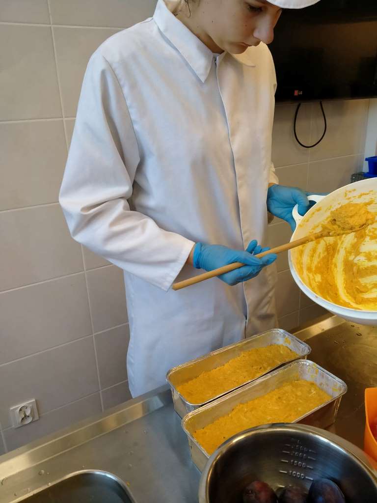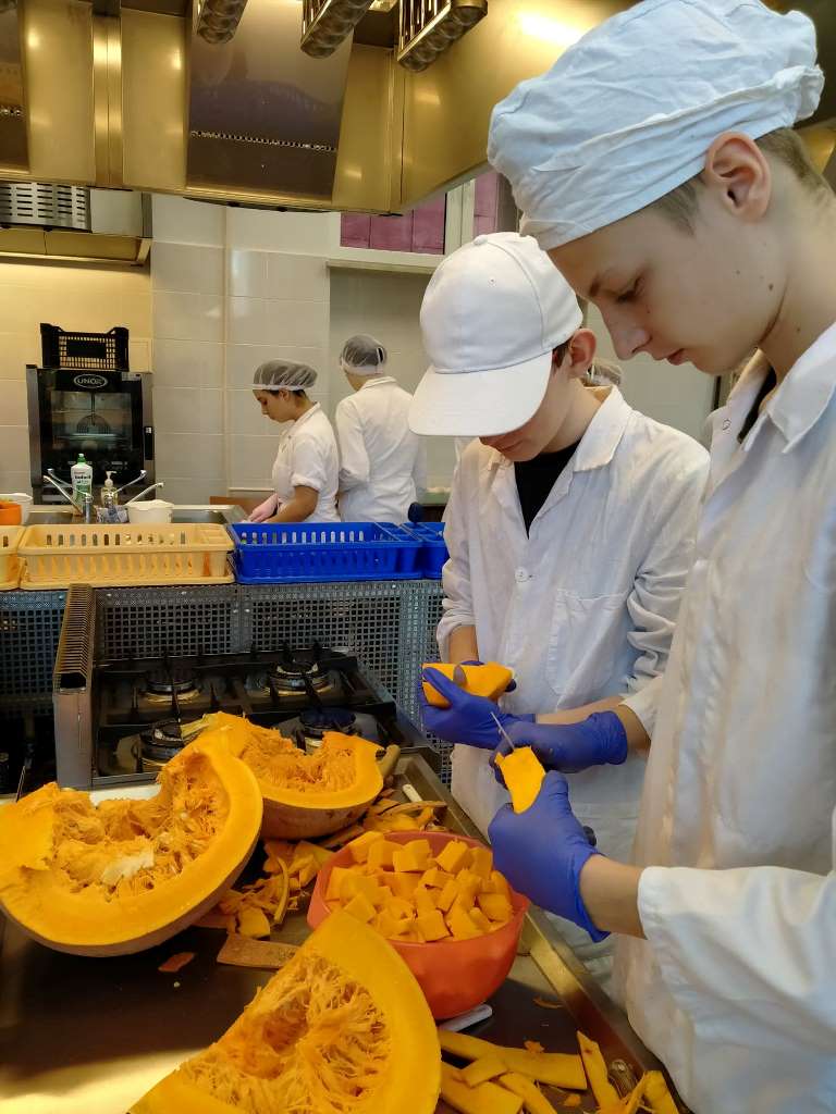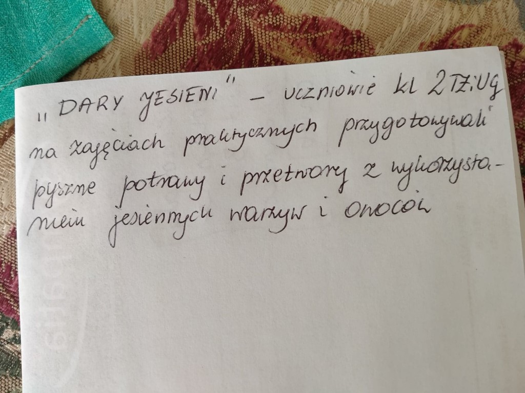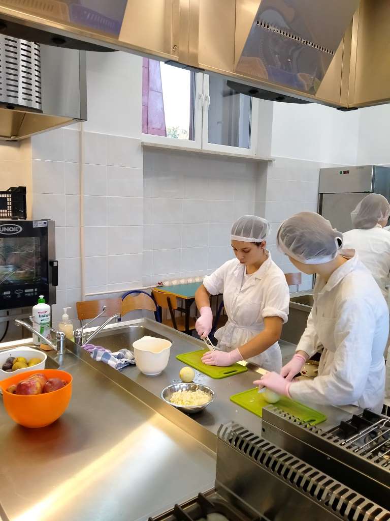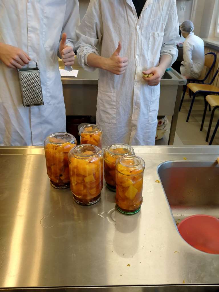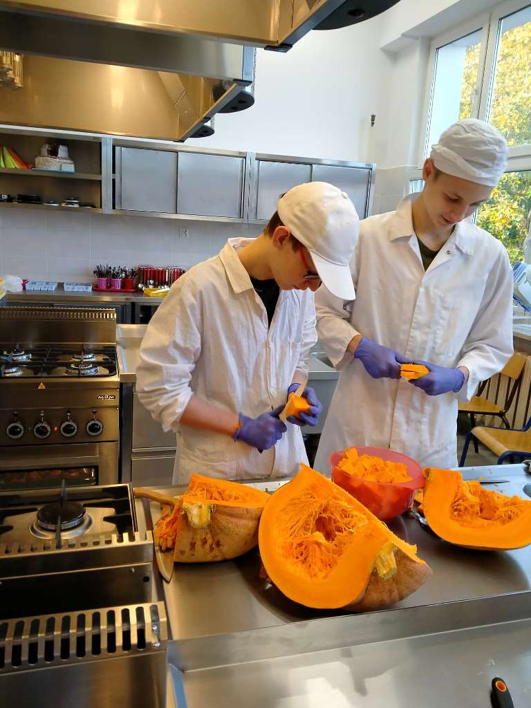 Zanim przeszliśmy na nauczanie zdalne, uczniowie klasy 2TŻiUG pod kierunkiem p. Edyty Trzaska i p. Ewy Bogulas, na zajęciach praktycznych - „przygotowanie i wydawanie dań”- w pracowni gastronomicznej, przygotowywali pyszne potrawy, desery i przetwory na zimę z wykorzystaniem darów jesieni: warzyw i owoców.