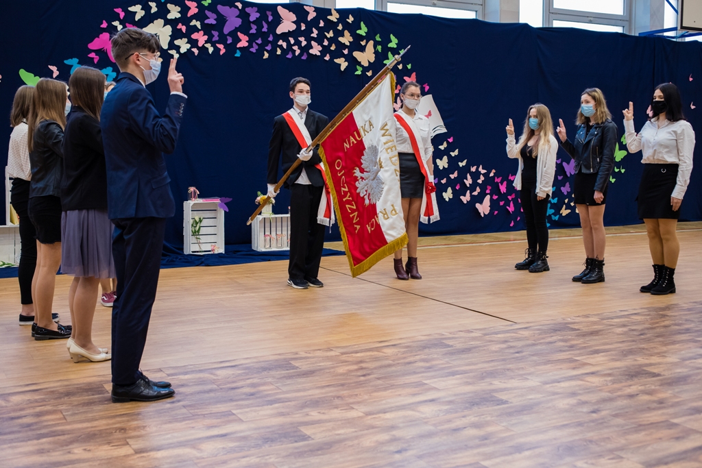 Uczniowie klas pierwszych złożyli uroczyste ślubowanie na sztandar szkoły 13 października 2021r. podczas uroczystości, którą poprowadziła pani wicedyrektor Maria Gawryś. Ze względu na zagrożenie epidemiczne, uroczystość została podzielona na dwie tury i odbyła się z zachowaniem reżimu sanitarnego.
