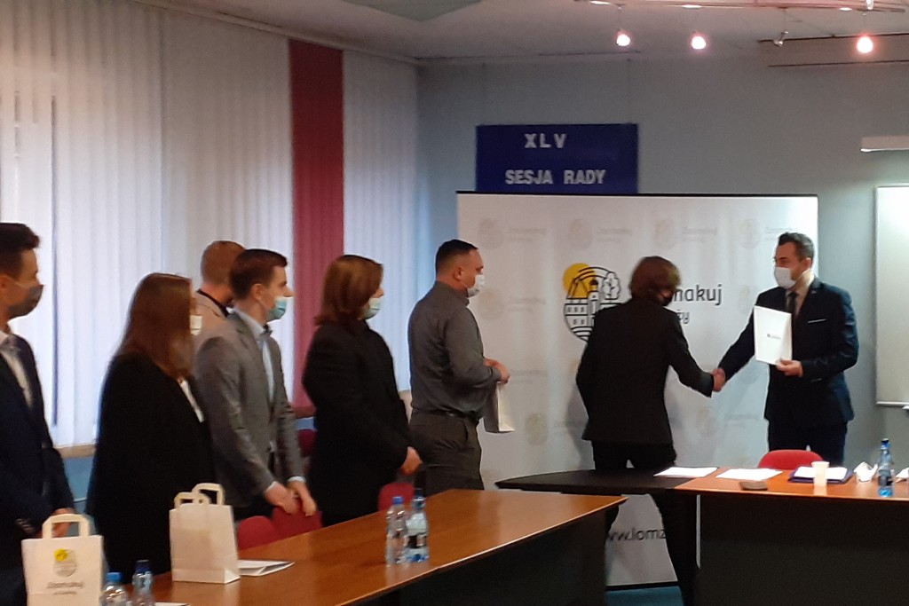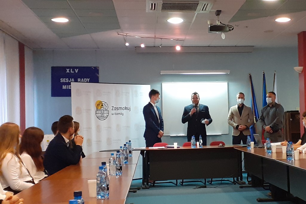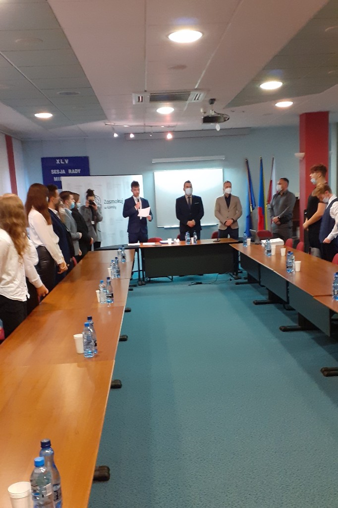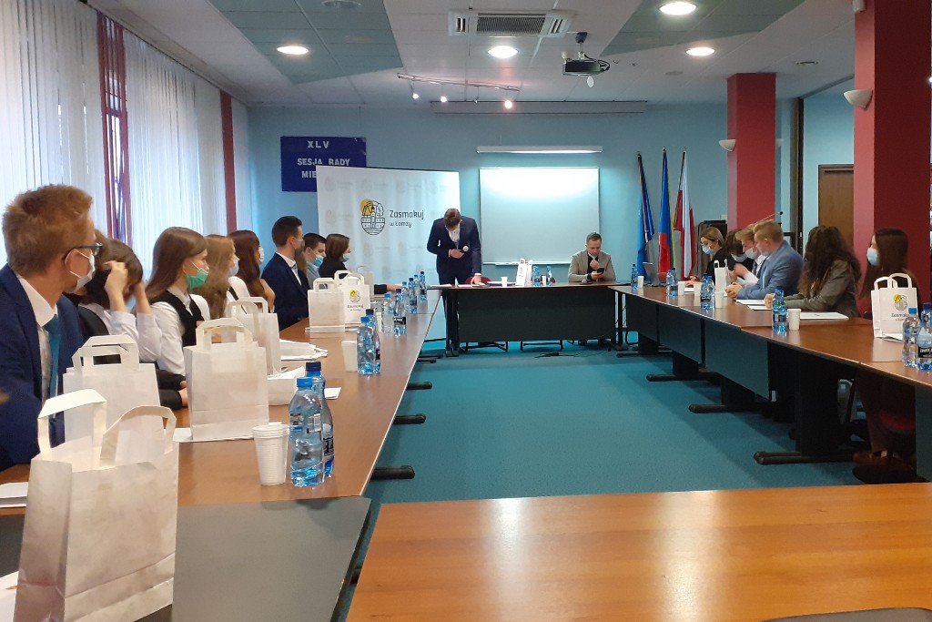 W dniu 08.11 w ratuszu łomżyńskim odbyło się inauguracyjne posiedzenie Młodzieżowej Rady Miasta Łomży, w którym wzięli udział (pod opieką p. W. Czupryńskiego) nasi uczniowie. Młodzi radni złożyli ślubowanie i odebrali dokumenty potwierdzające wybór do Rady. Naszymi radnymi są obecnie: Natalia Grzymała z kl. 2TŻ oraz Wiktor Jórzak z kl.3APp. Akty nominacji wręczył radnym Prezydent Łomży p. M. Chrzanowski. Obok publikujemy zdjęcia z tego wydarzenia.
