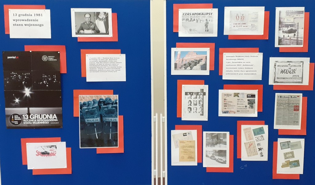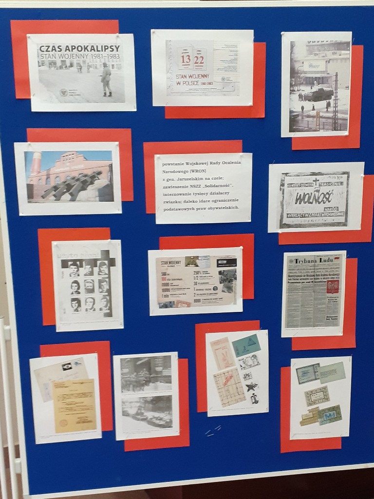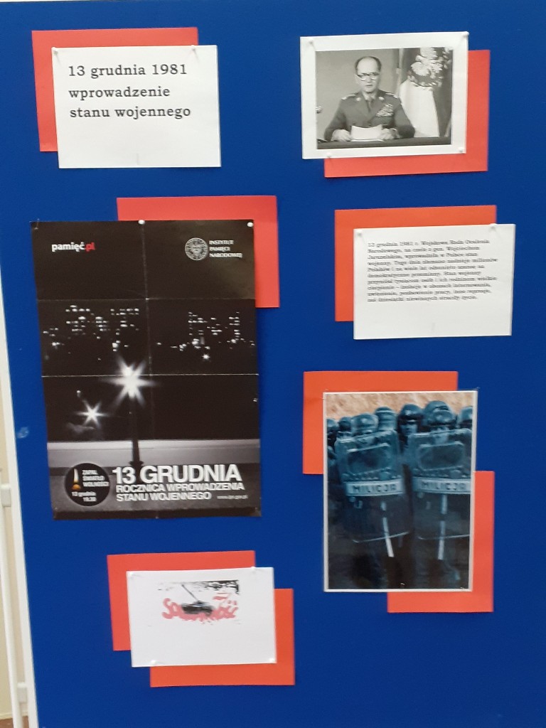 Przypomnieniu i utrwaleniu pamięci tych tragicznych wydarzeń w naszej szkole służy ekspozycja dotycząca stanu wojennego, przygotowana przez uczniów pod kierunkiem pani Elżbiety Wiśniewskiej, na podstawie materiałów Instytutu Pamięci Narodowej . Zamieszczone tam zdjęcia, dokumenty i wypowiedzi historyków z IPN przybliżają młodzieży okoliczności wprowadzenia oraz realia życia codziennego stanu wojennego . Prezentują represje władz wobec społeczeństwa oraz formy oporu społecznego. Na wystawie nie zabrakło też apelu IPN o zapalenie światełka wolności 13 grudnia o godzinie 19.30 dla symbolicznego uczczenia pamięci 100 ofiar stanu wojennego. Kampania społeczna „Zapal Światło Wolności” nawiązuje do gestu solidarności, jaki wobec Polaków żyjących w stanie wojennym w Wigilię Bożego Narodzenia 1981 roku wykonały rzesze mieszkańców ówczesnego wolnego świata. Na znak jedności z rodakami świecę w oknie Pałacu Apostolskiego w Watykanie zapalił także papież Jan Paweł II. Przeprowadzone w dniu 13 grudnia lekcje historii w oparciu o ekspozycję pozwoliły uczniom lepiej zrozumieć rzeczywistość stanu wojennego i klimat tamtego „ czasu apokalipsy”, który wstrząsnął głęboko całym społeczeństwem.