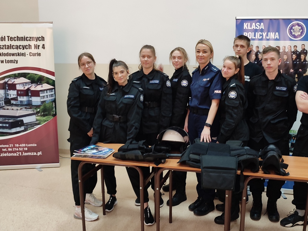 Młodszy aspirant Karolina Borawska z Wydziału Prewencji Komendy Miejskiej Policji w Łomży spotkała się w auli szkolnej z uczniami klas o profilu służba w policji we wtorek 29 marca. Podczas spotkania uczniowie dowiedzieli się jak wygląda proces rekrutacji do policji oraz specyfika pracy policjanta.