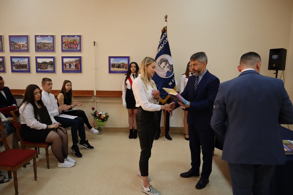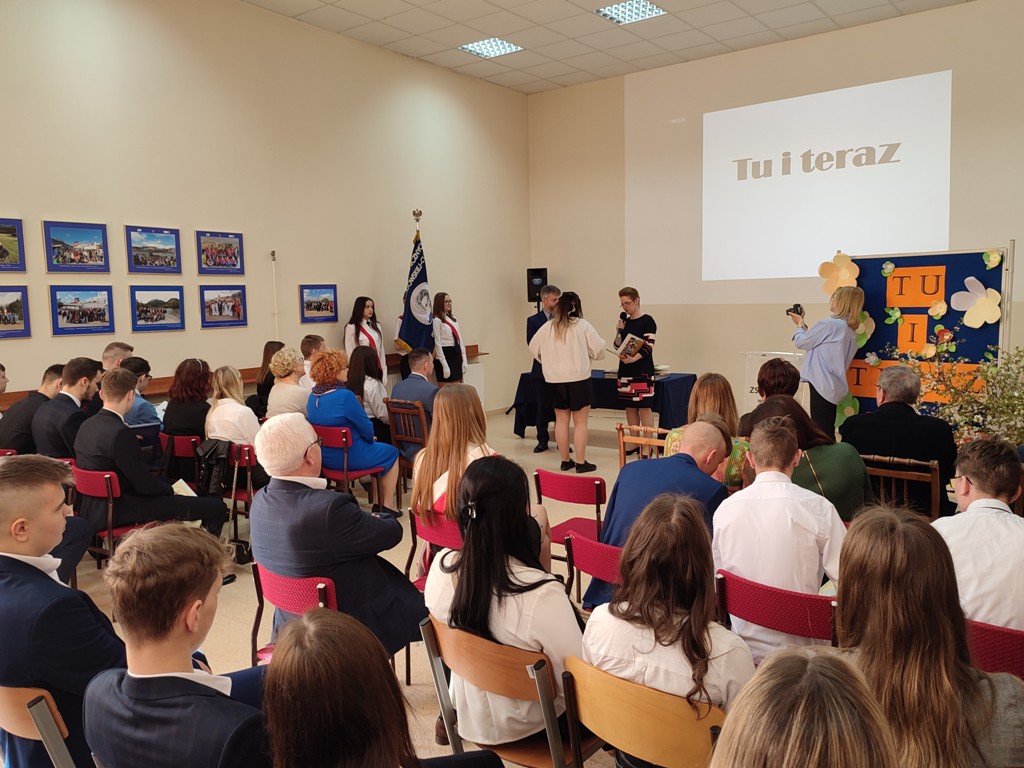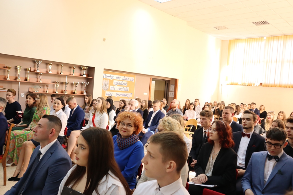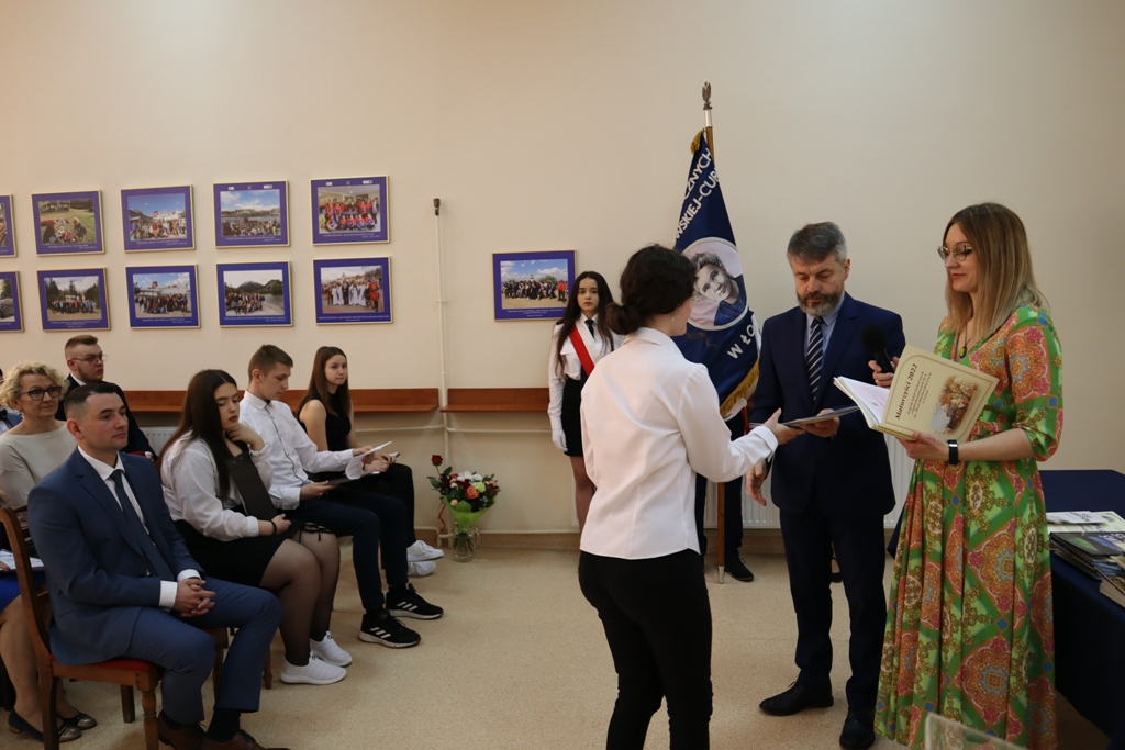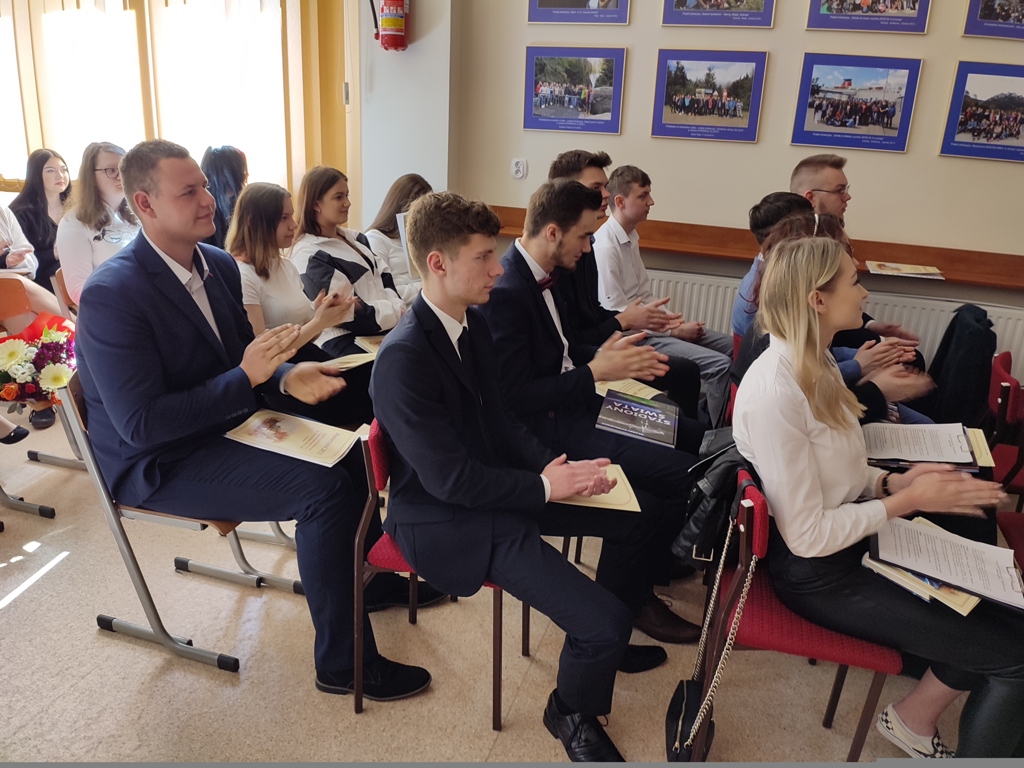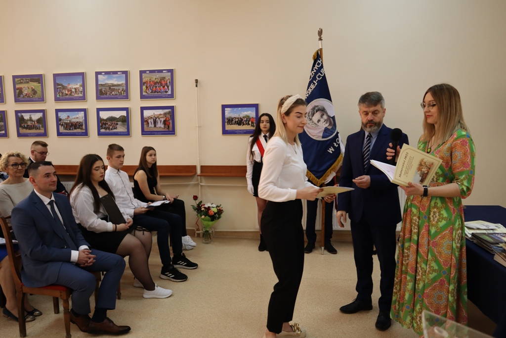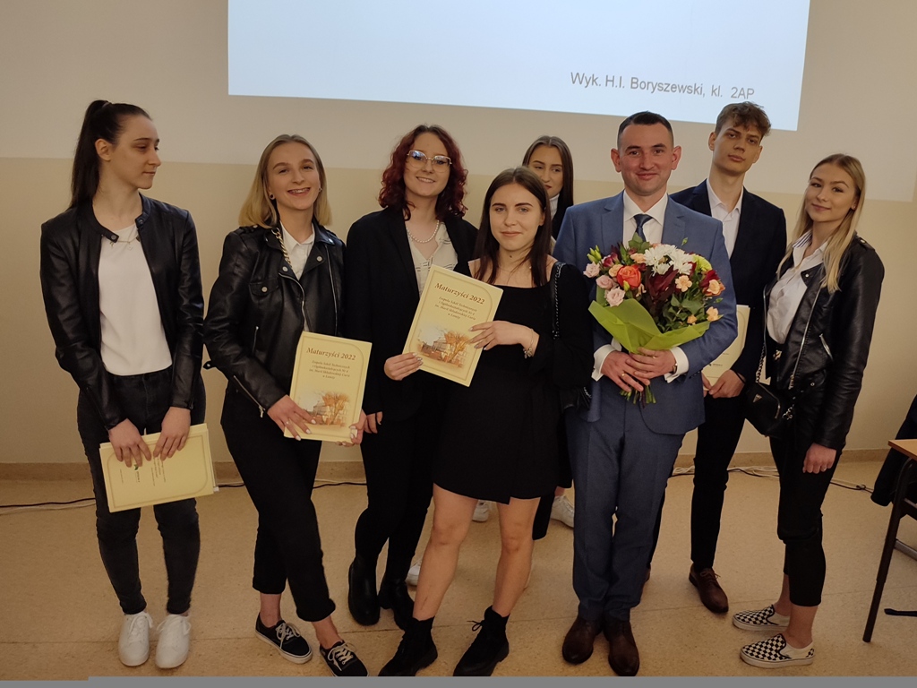 Uroczystość zakończenia roku szkolnego dla klas maturalnych odbyła się w piątek 29 kwietnia. Uroczystość poprowadziła pani wicedyrektor Maria Gawryś. Dyrektor szkoły Artur Ciborowski wraz z wychowawcami klas p. Sylwią Kołakowską, p. Alicją Wirtel, p. Małgorzatą Demczuk-Gutowską oraz p. Kamilem Galankiem wręczył świadectwa i wyróżnienia tegorocznym absolwentom. W imieniu Samorządu Uczniowskiego uczennice Marta Gronostajska oraz Alicja Jabłecka złożyły maturzystom życzenia pomyślności oraz odwagi w realizacji planów i marzeń. Przedstawicielki klas maturalnych Ewelina Stankiewicz oraz Zuzanna Nicewicz podziękowały gronu pedagogicznemu za trud włożony w przekazywanie wiedzy. Wzruszającą część artystyczną przygotowała klasa 2 AP pod opieką pani Beaty Kamińskiej-Szmitko.