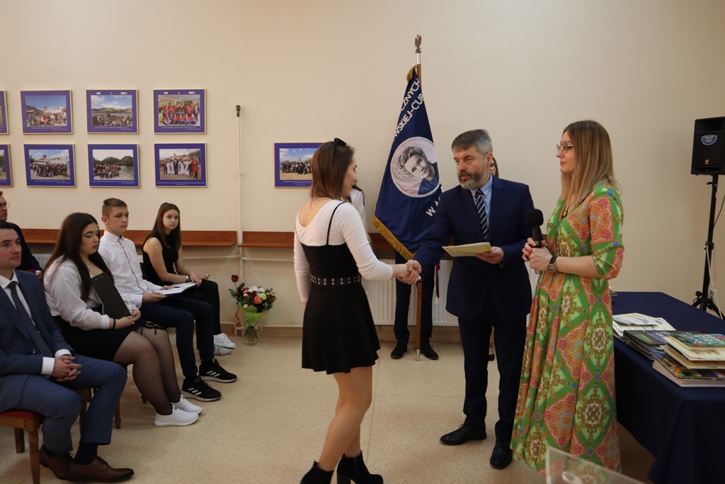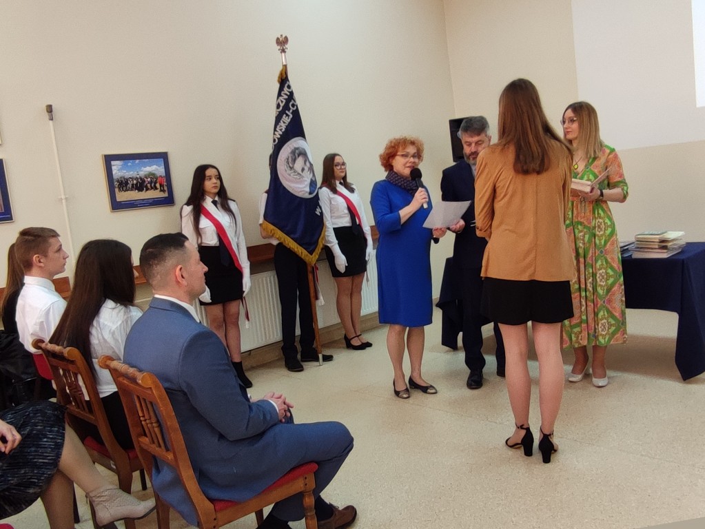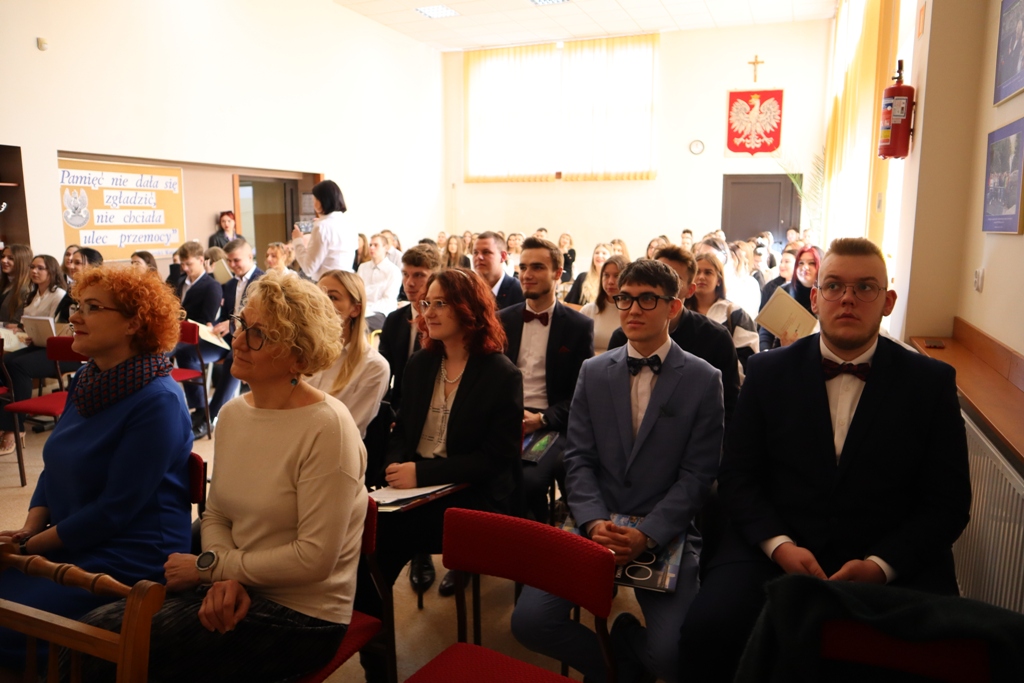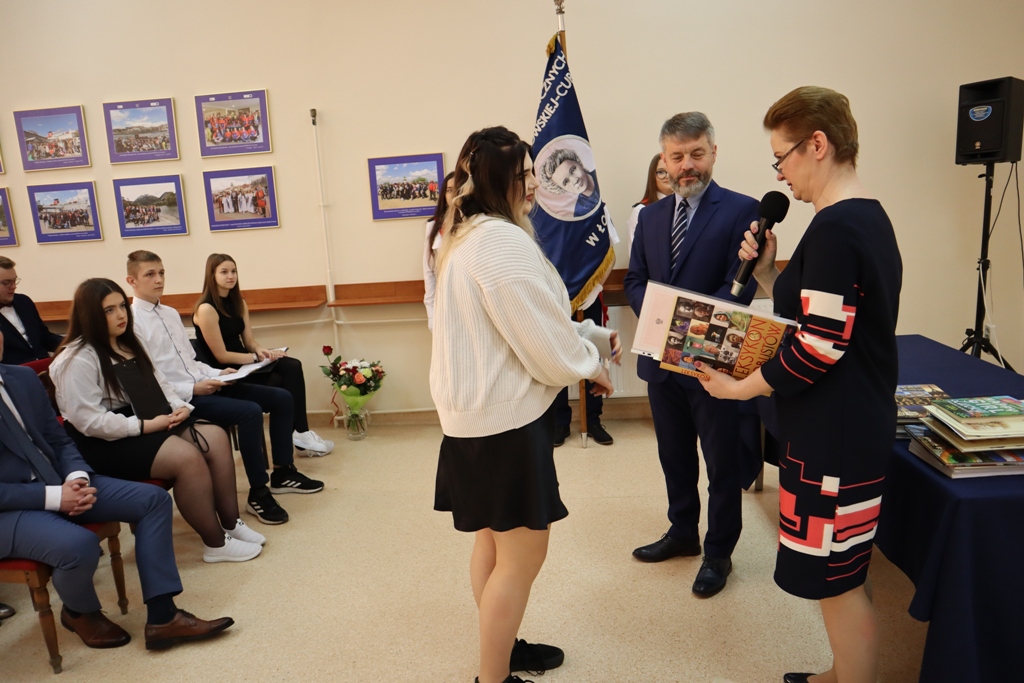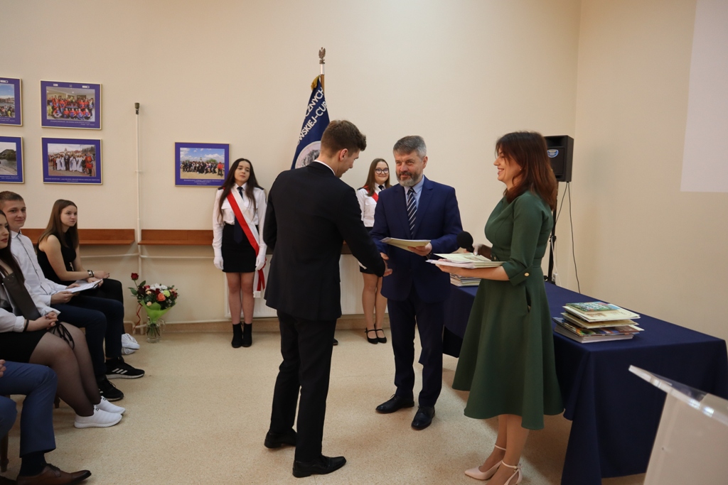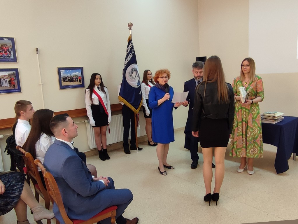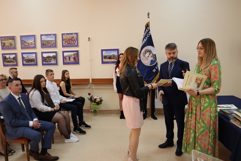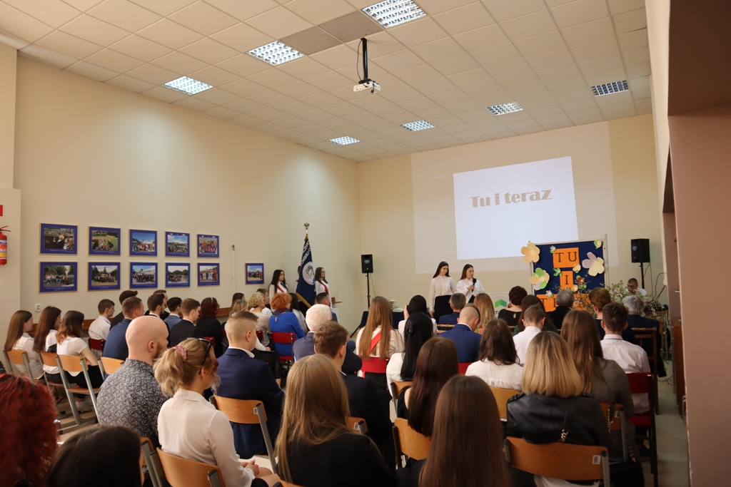 Uroczystość zakończenia roku szkolnego dla klas maturalnych odbyła się w piątek 29 kwietnia. Uroczystość poprowadziła pani wicedyrektor Maria Gawryś. Dyrektor szkoły Artur Ciborowski wraz z wychowawcami klas p. Sylwią Kołakowską, p. Alicją Wirtel, p. Małgorzatą Demczuk-Gutowską oraz p. Kamilem Galankiem wręczył świadectwa i wyróżnienia tegorocznym absolwentom. W imieniu Samorządu Uczniowskiego uczennice Marta Gronostajska oraz Alicja Jabłecka złożyły maturzystom życzenia pomyślności oraz odwagi w realizacji planów i marzeń. Przedstawicielki klas maturalnych Ewelina Stankiewicz oraz Zuzanna Nicewicz podziękowały gronu pedagogicznemu za trud włożony w przekazywanie wiedzy. Wzruszającą część artystyczną przygotowała klasa 2 AP pod opieką pani Beaty Kamińskiej-Szmitko.
