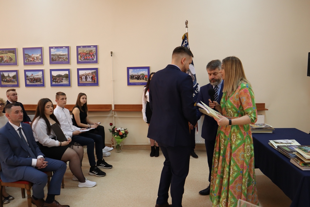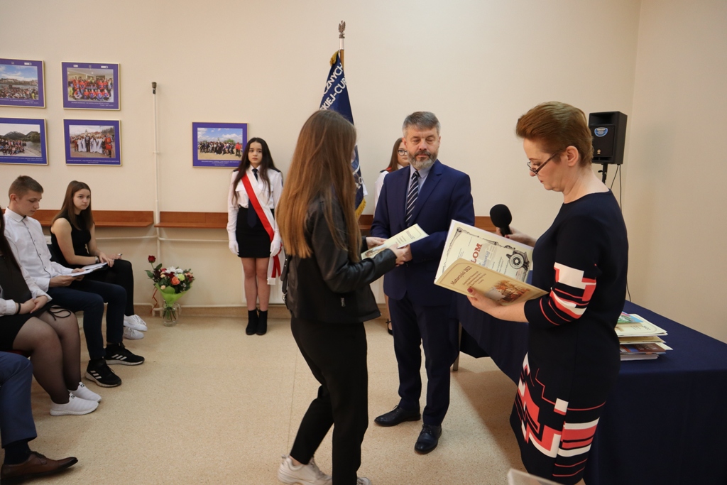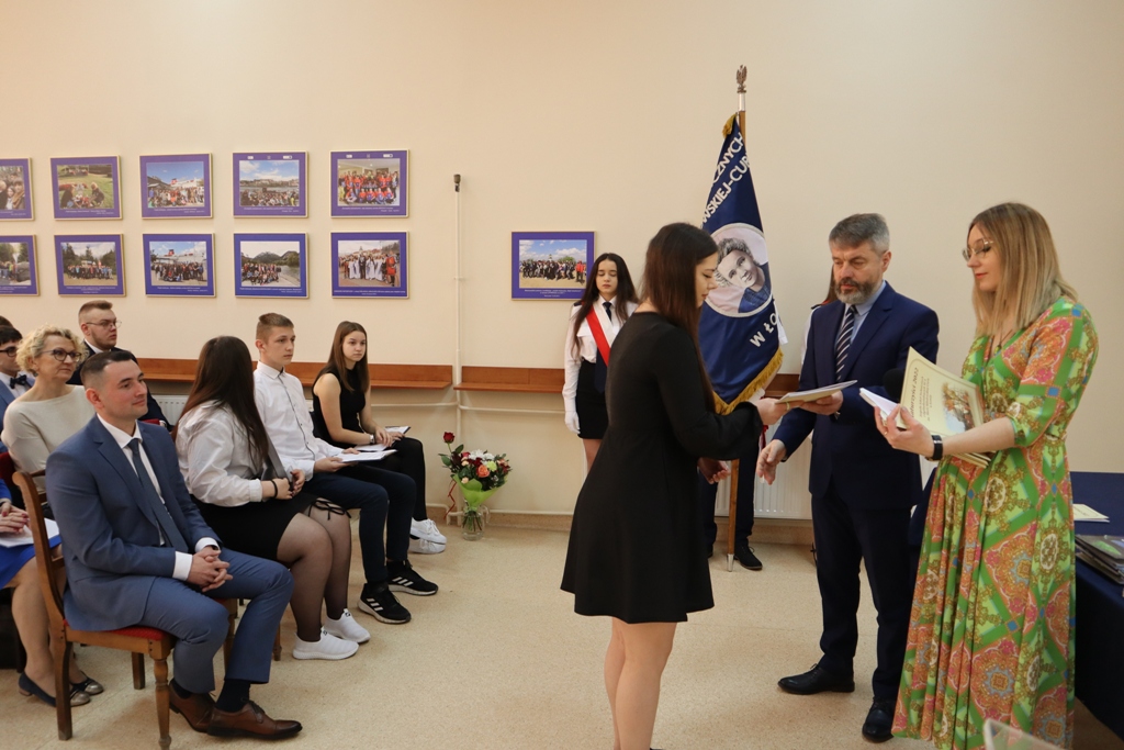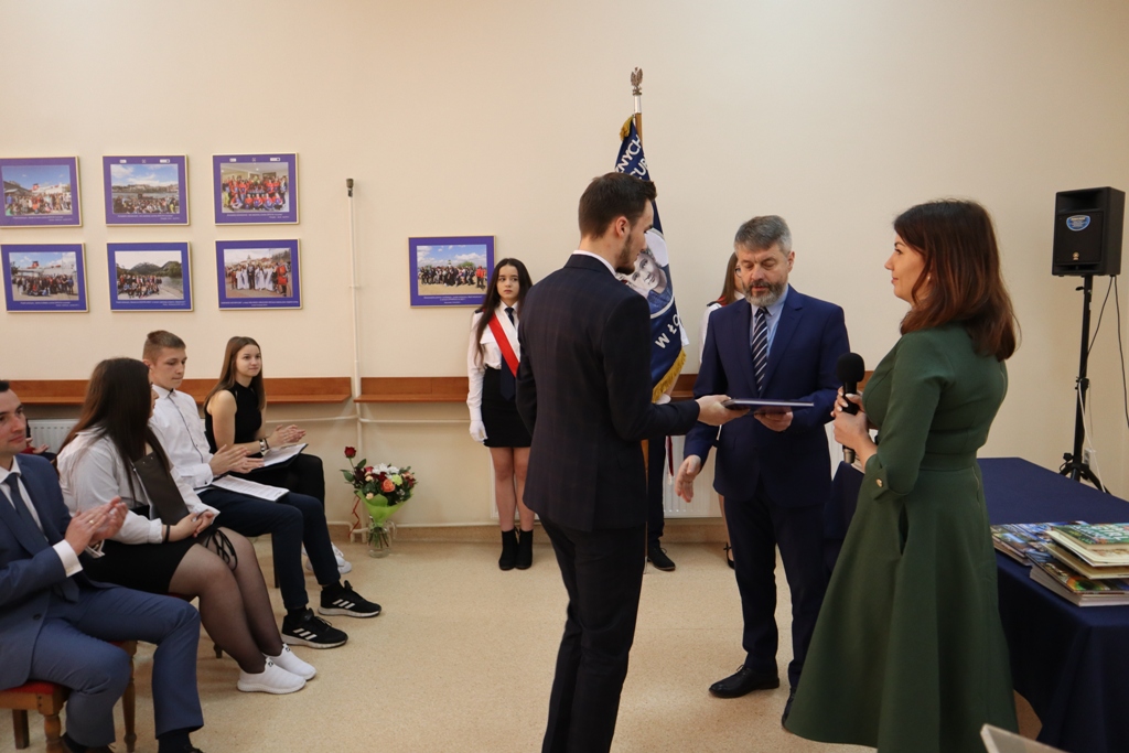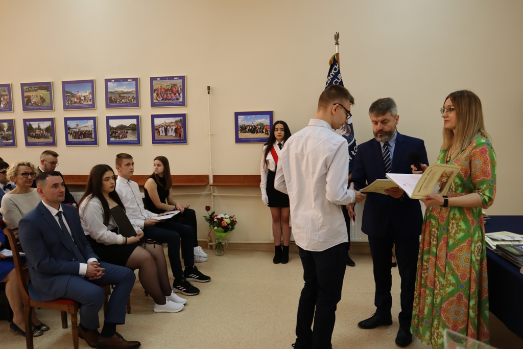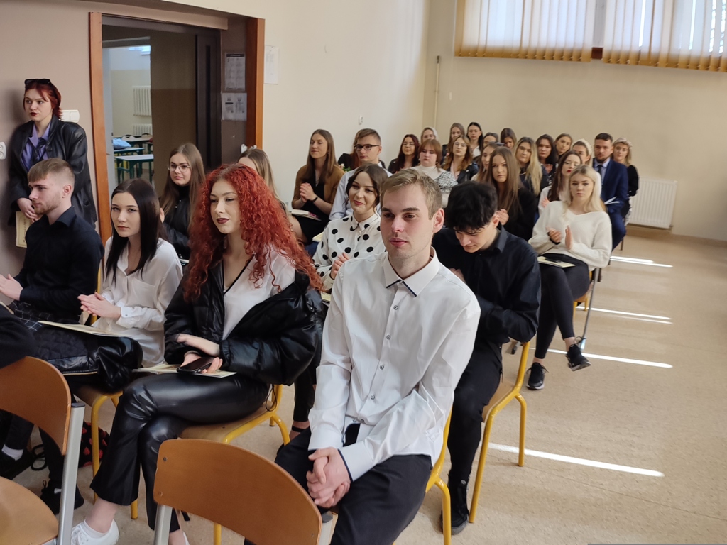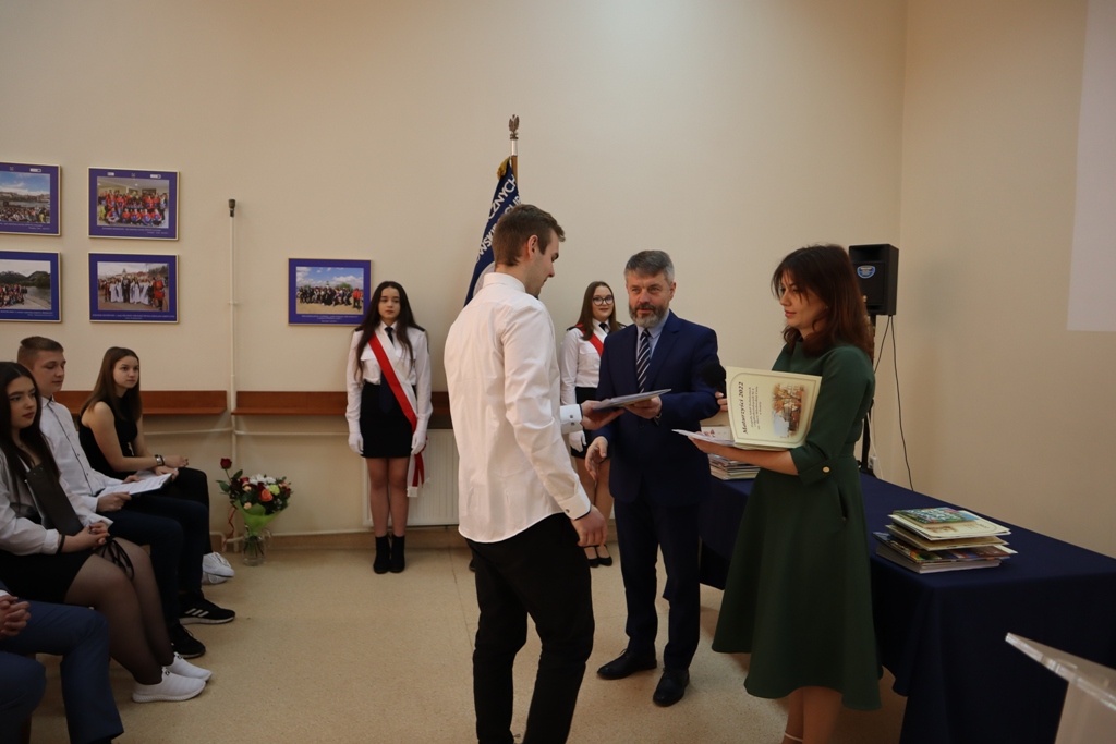 Uroczystość zakończenia roku szkolnego dla klas maturalnych odbyła się w piątek 29 kwietnia. Uroczystość poprowadziła pani wicedyrektor Maria Gawryś. Dyrektor szkoły Artur Ciborowski wraz z wychowawcami klas p. Sylwią Kołakowską, p. Alicją Wirtel, p. Małgorzatą Demczuk-Gutowską oraz p. Kamilem Galankiem wręczył świadectwa i wyróżnienia tegorocznym absolwentom. W imieniu Samorządu Uczniowskiego uczennice Marta Gronostajska oraz Alicja Jabłecka złożyły maturzystom życzenia pomyślności oraz odwagi w realizacji planów i marzeń. Przedstawicielki klas maturalnych Ewelina Stankiewicz oraz Zuzanna Nicewicz podziękowały gronu pedagogicznemu za trud włożony w przekazywanie wiedzy. Wzruszającą część artystyczną przygotowała klasa 2 AP pod opieką pani Beaty Kamińskiej-Szmitko.