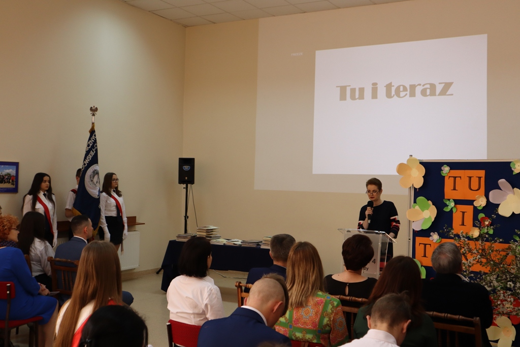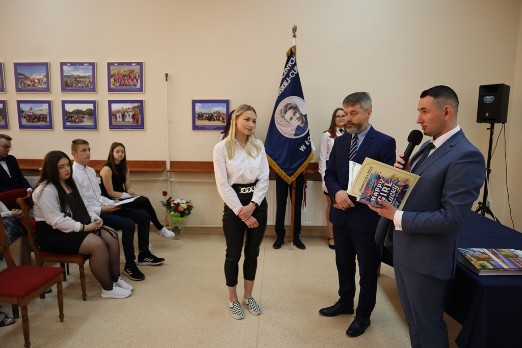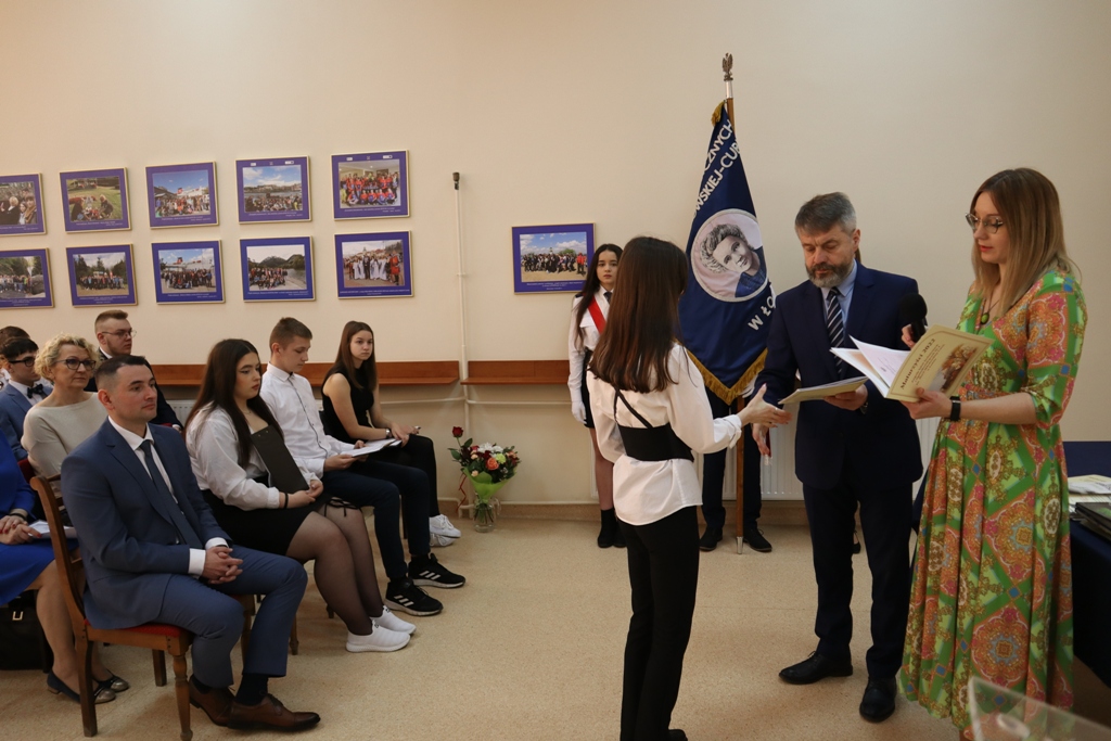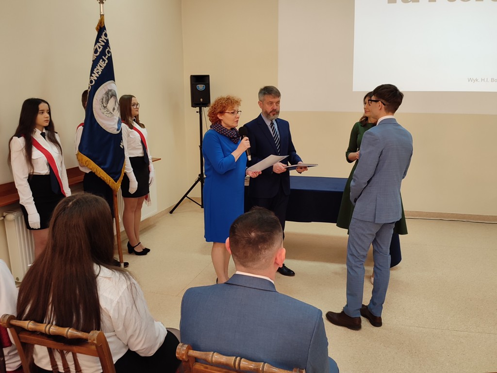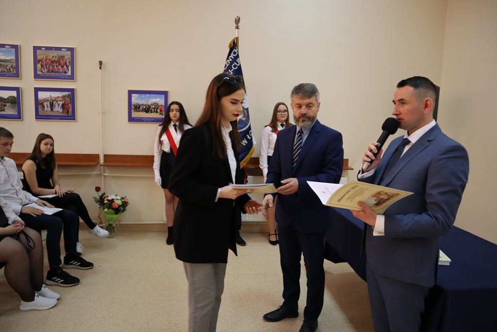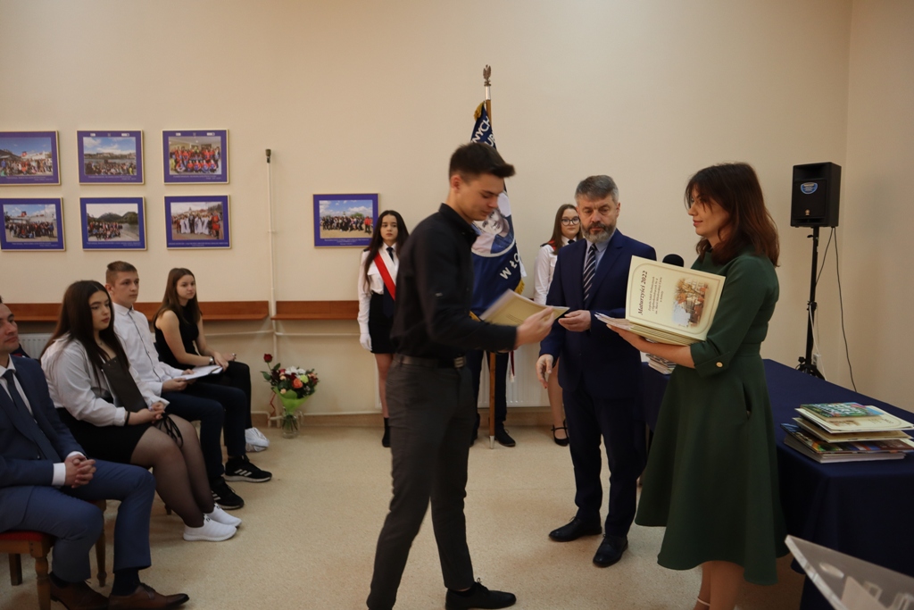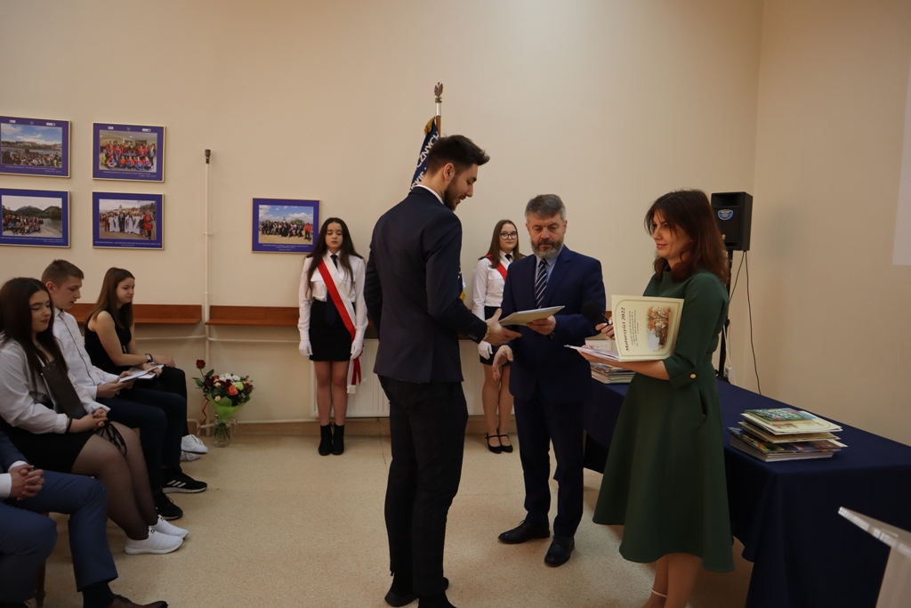 Uroczystość zakończenia roku szkolnego dla klas maturalnych odbyła się w piątek 29 kwietnia. Uroczystość poprowadziła pani wicedyrektor Maria Gawryś. Dyrektor szkoły Artur Ciborowski wraz z wychowawcami klas p. Sylwią Kołakowską, p. Alicją Wirtel, p. Małgorzatą Demczuk-Gutowską oraz p. Kamilem Galankiem wręczył świadectwa i wyróżnienia tegorocznym absolwentom. W imieniu Samorządu Uczniowskiego uczennice Marta Gronostajska oraz Alicja Jabłecka złożyły maturzystom życzenia pomyślności oraz odwagi w realizacji planów i marzeń. Przedstawicielki klas maturalnych Ewelina Stankiewicz oraz Zuzanna Nicewicz podziękowały gronu pedagogicznemu za trud włożony w przekazywanie wiedzy. Wzruszającą część artystyczną przygotowała klasa 2 AP pod opieką pani Beaty Kamińskiej-Szmitko.