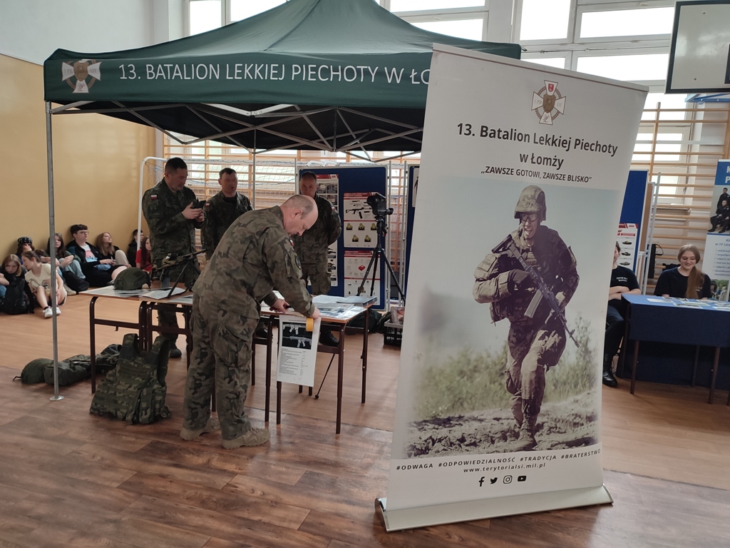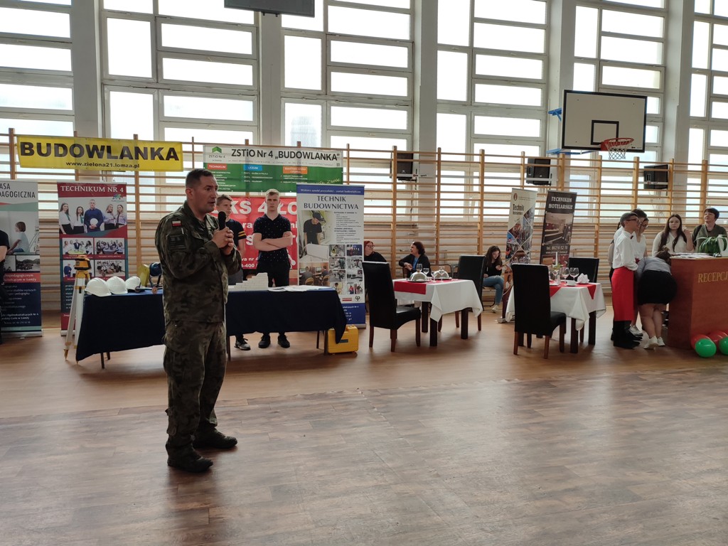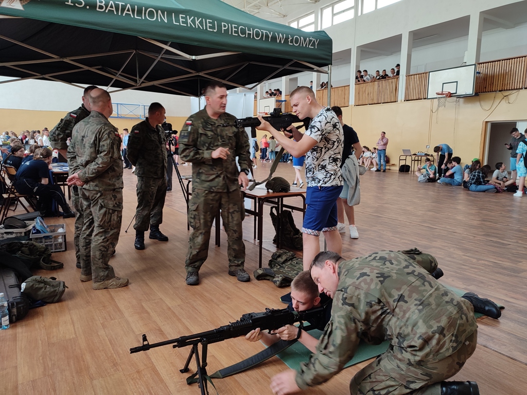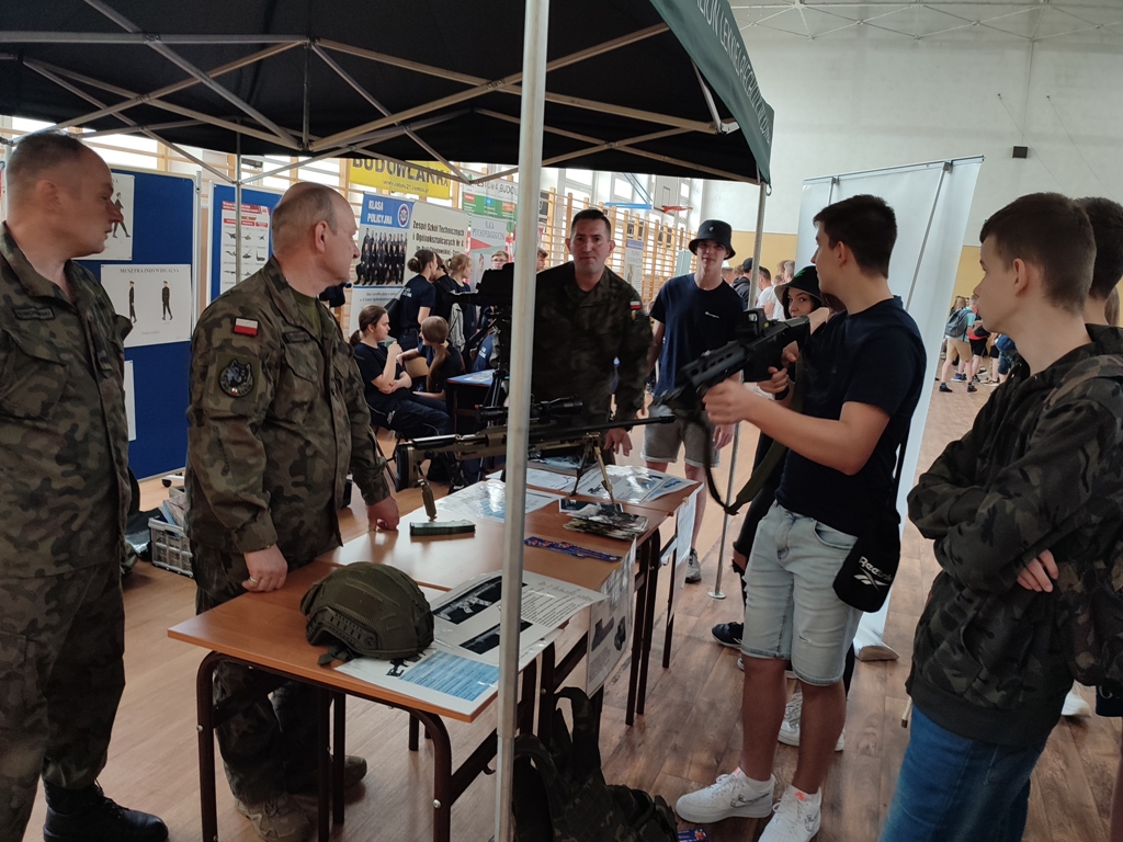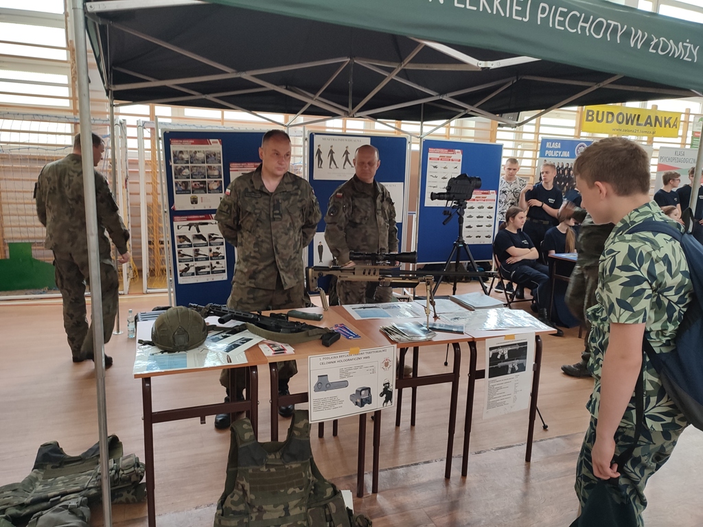 Gościliśmy w naszej szkole 13. Batalion Lekkiej Piechoty z Łomży, który zaprezentował swoje uzbrojenie i umundurowanie uczniom klas podstawowych zainteresowanym kształceniem w powstającej certyfikowanej klasie wojskowej. Była to też okazja, aby zaproszeni ósmoklasiści mogli po raz kolejny zapoznać się z wszystkimi kierunkami kształcenia w naszej szkole.
