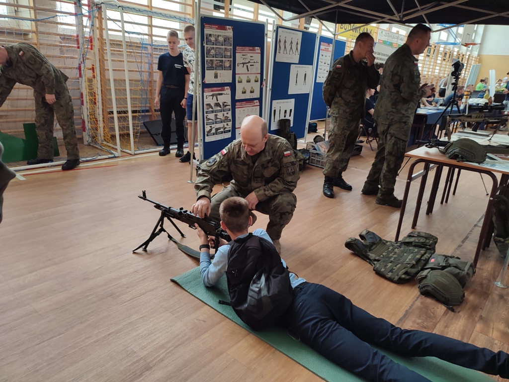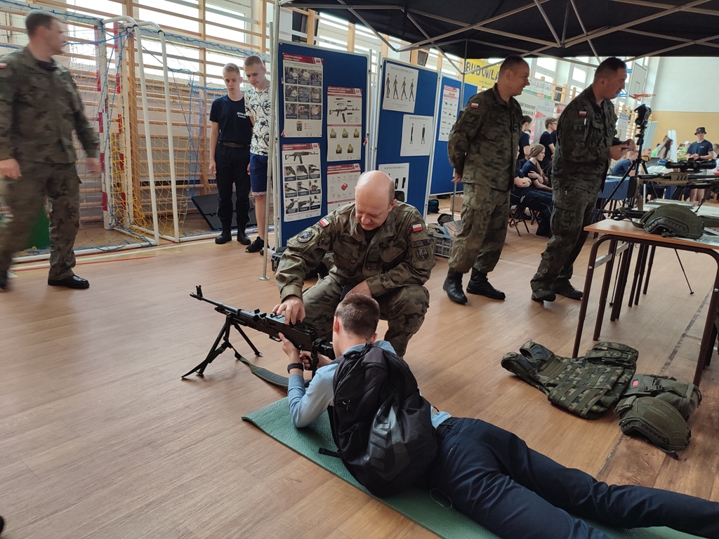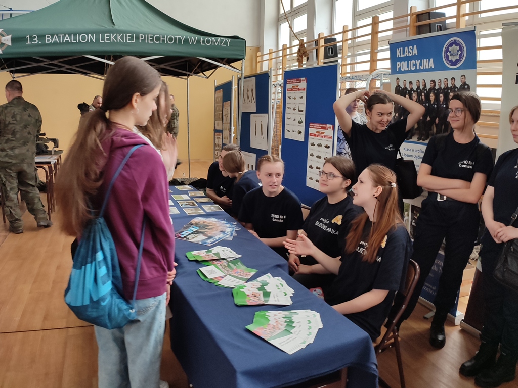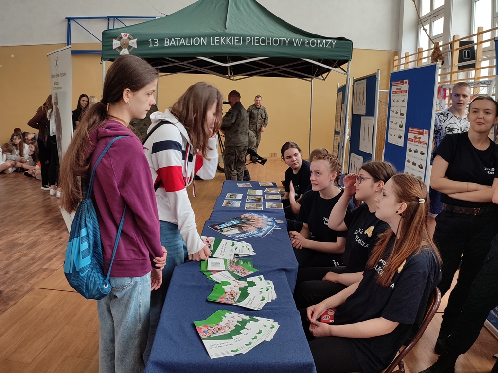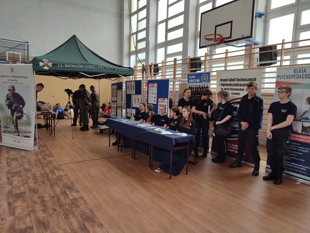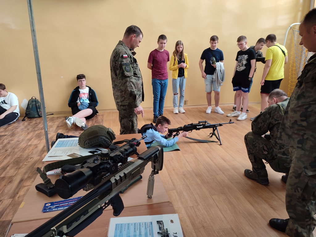 Gościliśmy w naszej szkole 13. Batalion Lekkiej Piechoty z Łomży, który zaprezentował swoje uzbrojenie i umundurowanie uczniom klas podstawowych zainteresowanym kształceniem w powstającej certyfikowanej klasie wojskowej. Była to też okazja, aby zaproszeni ósmoklasiści mogli po raz kolejny zapoznać się z wszystkimi kierunkami kształcenia w naszej szkole.