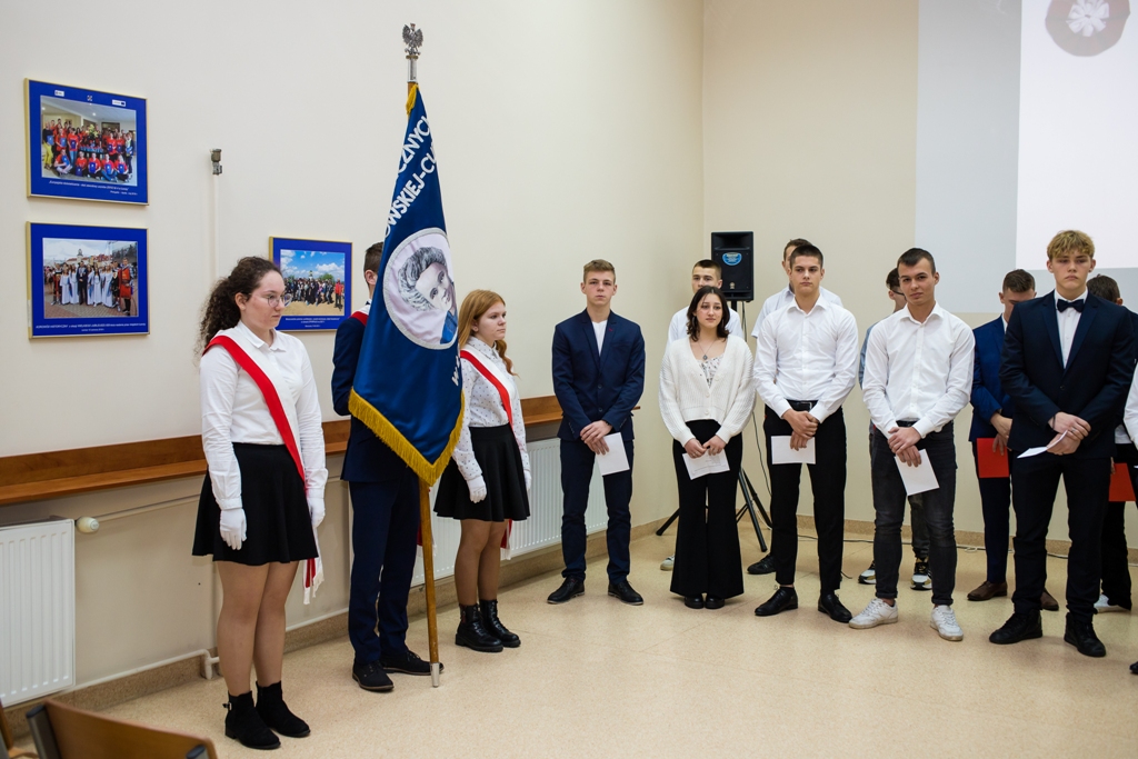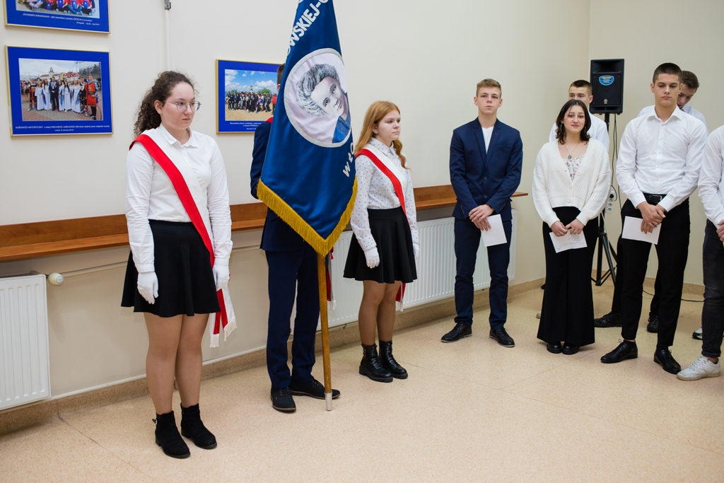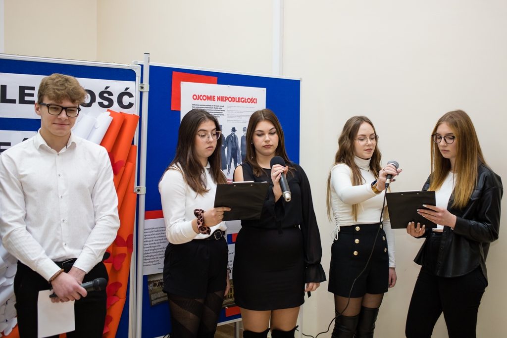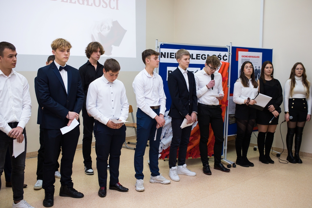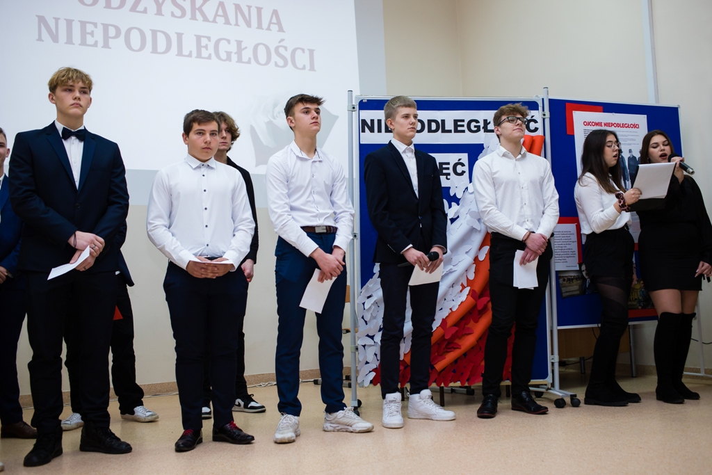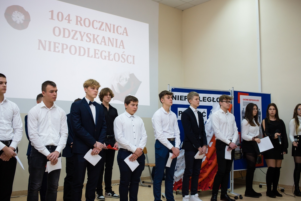 104 Rocznicę Odzyskania Niepodległości uświetniła uroczystość przygotowana przez klasę 2a TB pod opieką pani Alicji Modzelewskiej, Beaty Bednarczyk i Beaty Szymanowskiej. W montażu słowno-muzycznym gościnnie wystąpiły uczennice z klasy 3PP/BP, które pieśniami patriotycznymi podkreśliły ważne wydarzenia historyczne związane z odzyskaniem przez Polskę niepodległości.