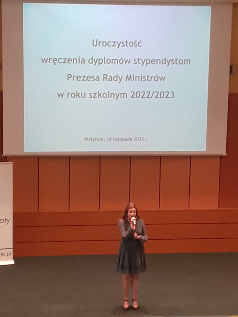 W dn. 18.11 br. w Białymstoku miała miejsce uroczystość wręczenia dyplomów stypendysty Prezesa Rady Ministrów, które wręczał p. Dariusz Piontkowski (wiceminister MEiN). Dyplomy otrzymały 3 nasze uczennice - Kinga Gawrych z kl. 3TB, Aleksandra Skorupa z kl. 4AP oraz Marta Gronostajska z kl. 4AHg. Opiekunem uczennic w Białymstoku był p.Wiesław Czupryński. Gratulujemy.