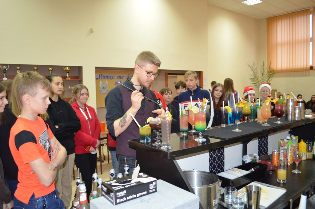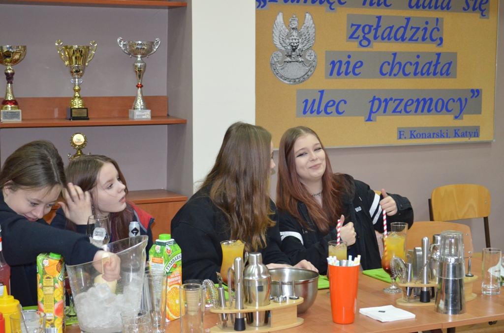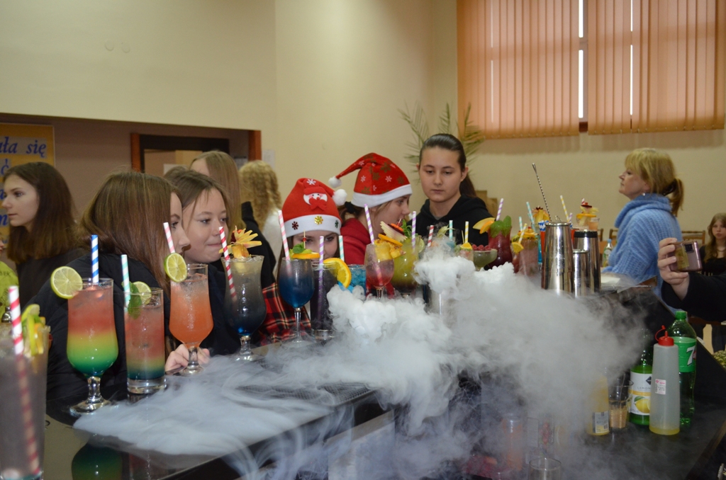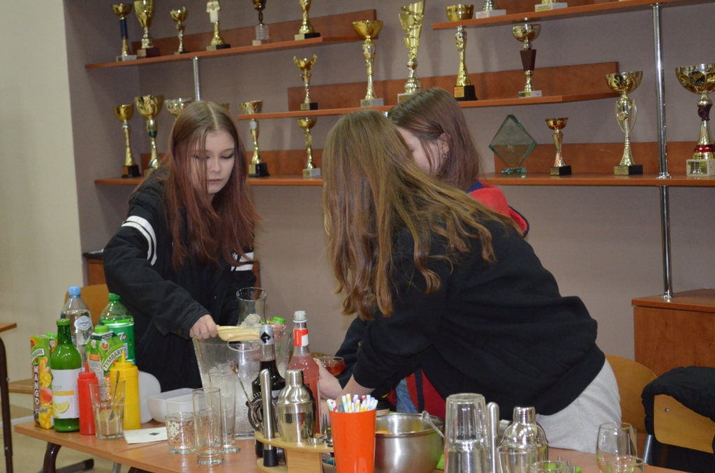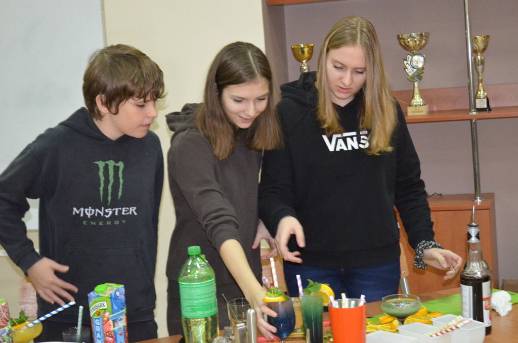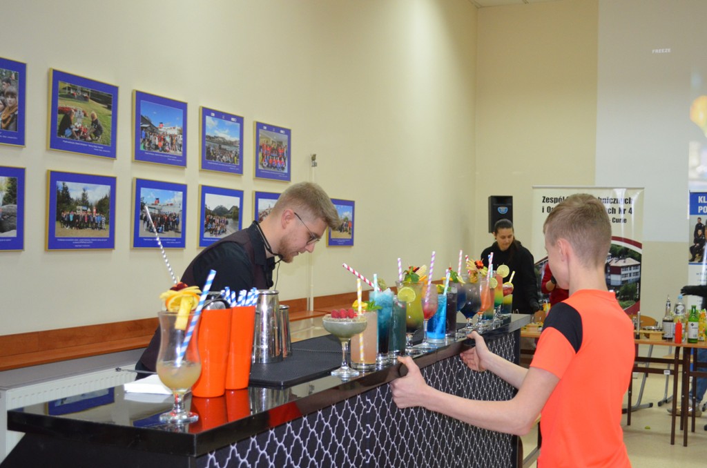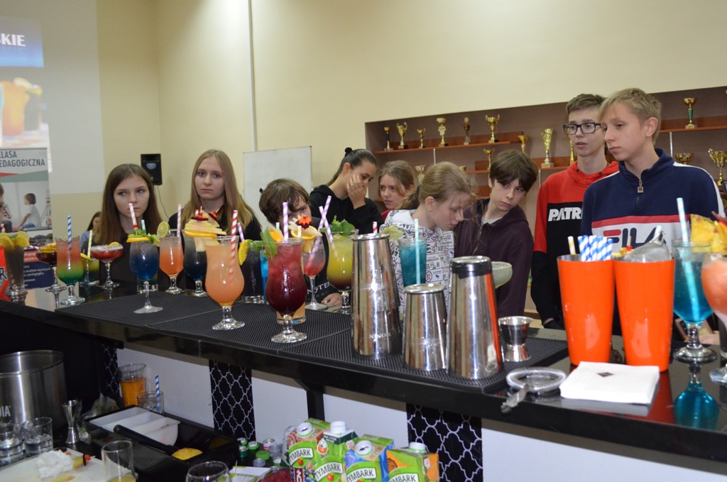Podczas szkolenia uczniowie wzięli udział w warsztatach barmańskich, w trakcie, których zapoznali się z pracą barmana, oraz technikami przygotowywania owocowych koktajli.