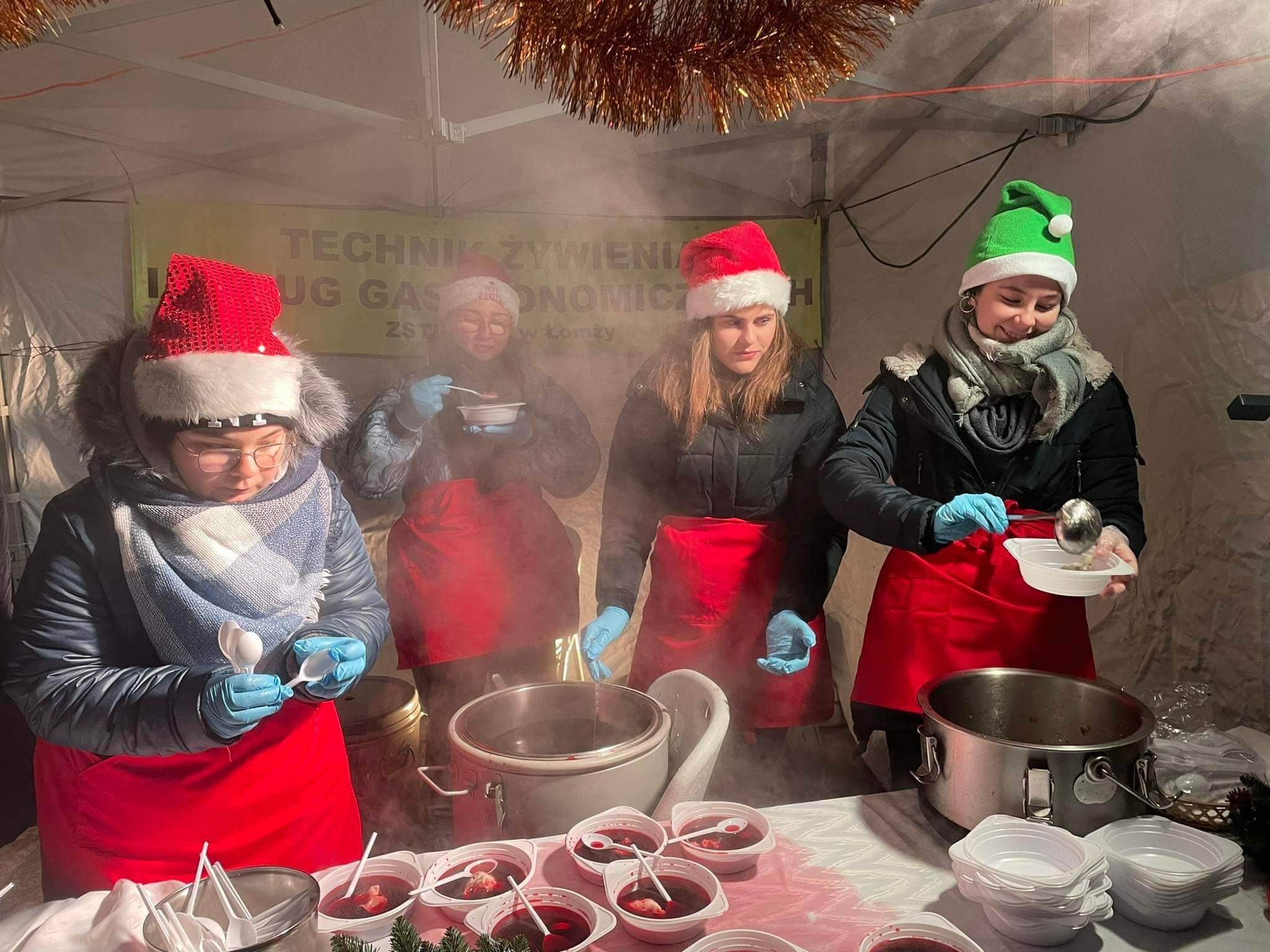 Uczniowie naszej szkoły z Technikum Żywienia i Usług Gastronomicznych wraz z opiekunami brali udział w przygotowaniu i wydawaniu potraw mieszkańcom Łomży. Pierogi z kapustą i grzybami oraz barszczyk z uszkami cieszyły się dużym powodzeniem. Chociaż wokół śnieg i mróz frekwencja dopisała.