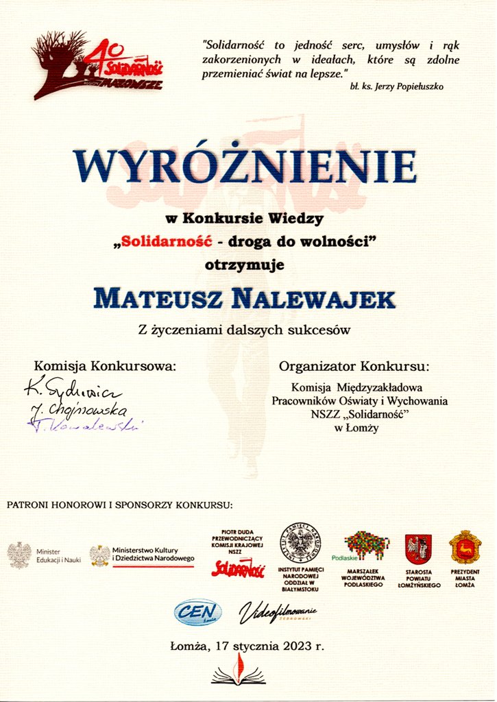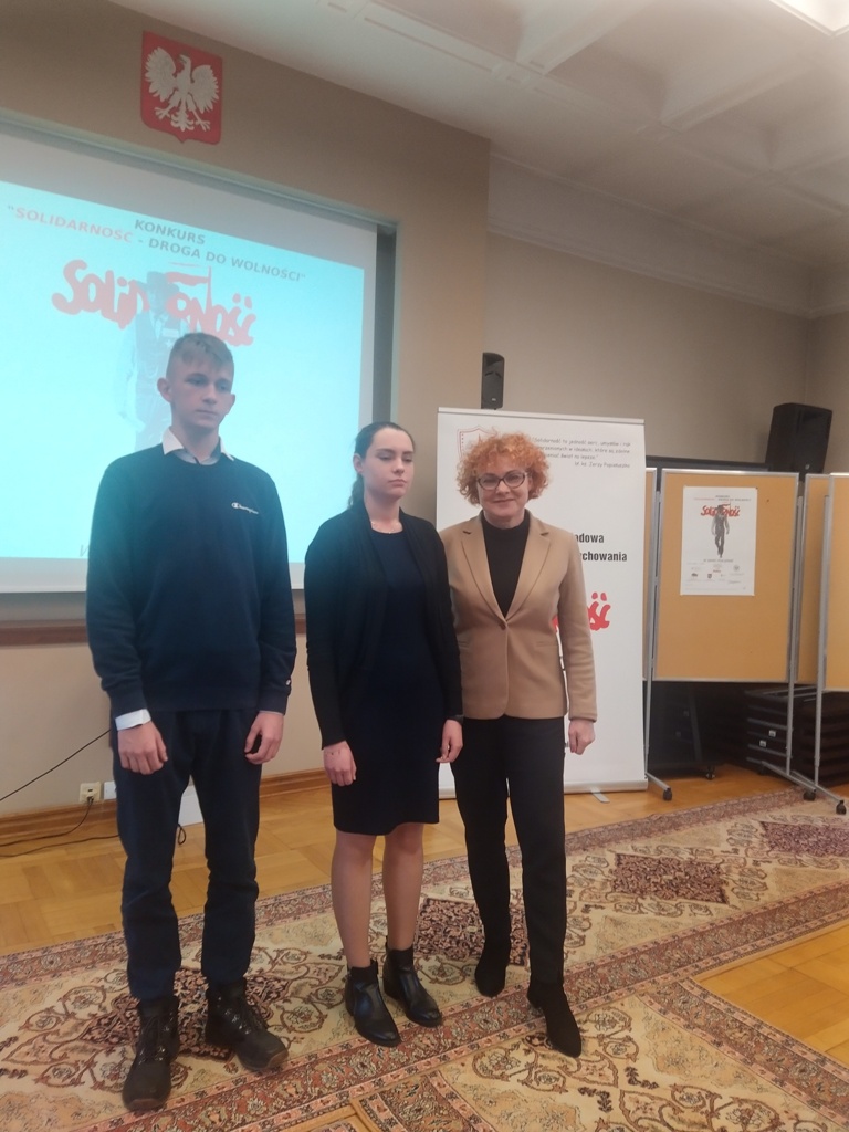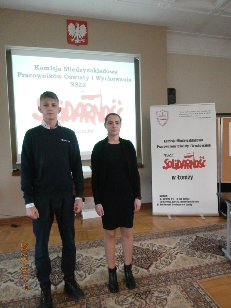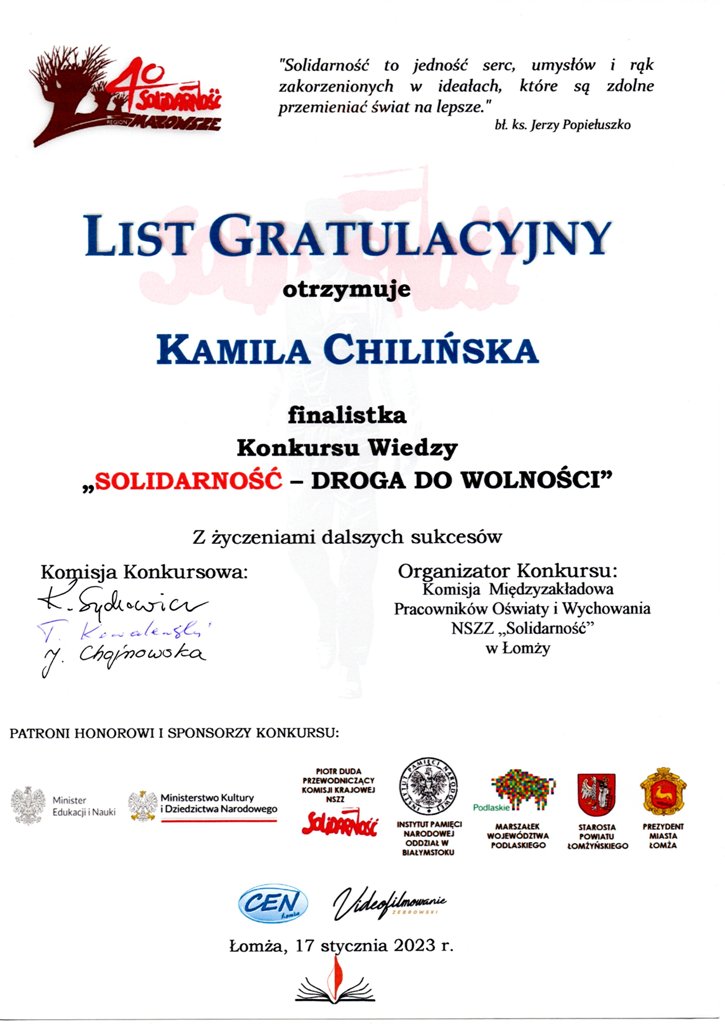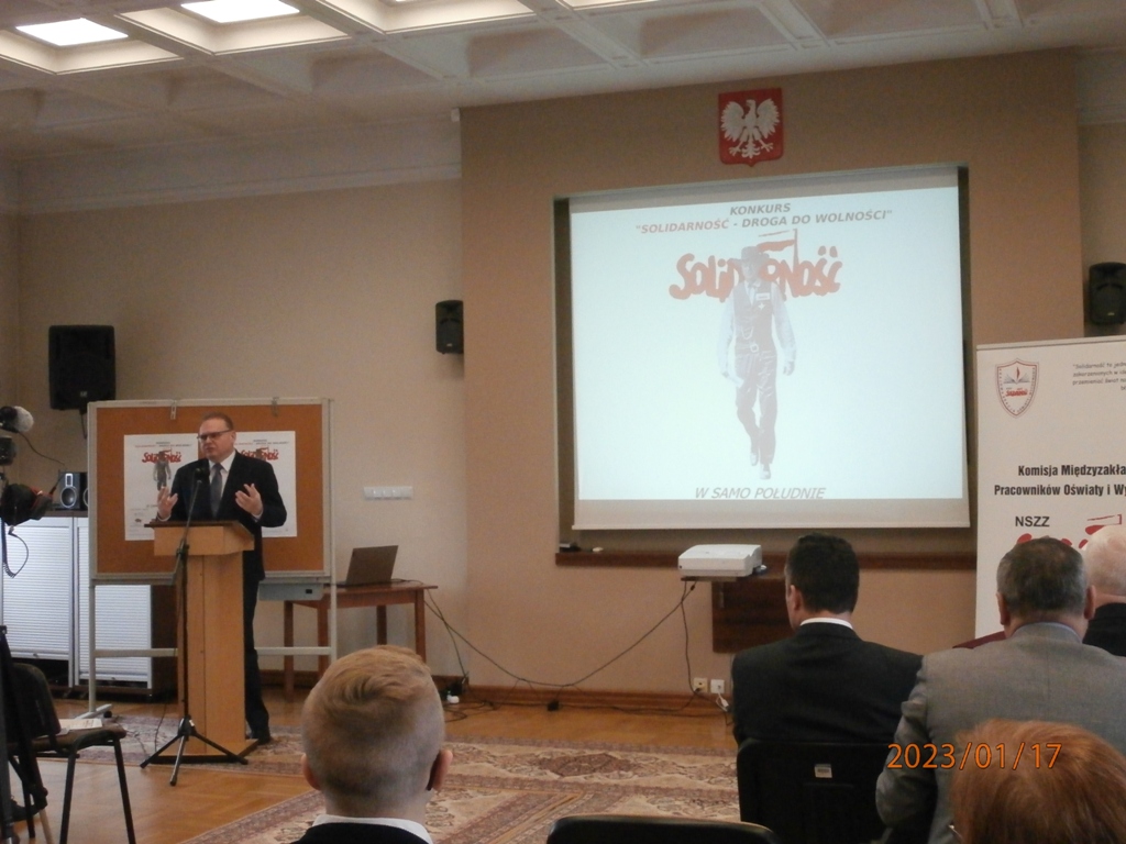17 stycznia 2023r. w Centrum Edukacji Nauczycieli w Łomży odbyło się uroczyste podsumowanie Konkursu wiedzy „Solidarność – droga do wolności”. Konkurs ten po raz trzeci zorganizowała Komisja Międzyzakładowa Pracowników Oświaty i Wychowania NSZZ "Solidarność" w Łomży, którą kieruje przewodnicząca p. Jolanta Chojnowska. Adresowany do uczniów szkół ponadpodstawowych z Łomży oraz powiatu łomżyńskiego, a także pilotażowo do studentów Akademii Nauk Stosowanych w Łomży- odbywał się w dwóch etapach-szkolnym i finałowym. Celem konkursu było ukazanie młodzieży walki o godność człowieka, trudności z jakimi mierzyli się Polacy w 1980 roku oraz przypomnienie wartości i ideałów „Solidarności”.