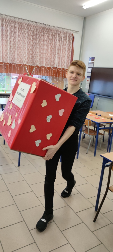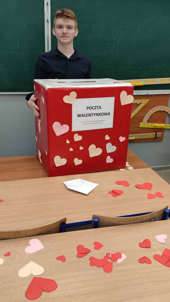 Samorząd Uczniowski zorganizował pocztę walentynkową. Uczniowie, którzy chcieli przekazać życzenia swoim sympatiom, kilka dni wcześniej wrzucali własnoręcznie wykonane kartki walentynkowe do specjalnie przygotowanej skrzynki. Następnie – Walentynkowi Listonosze z klas 1PP oraz 3AP - rozdawali pocztę w czasie zajęć lekcyjnych. Wszyscy odbiorcy byli mile zaskoczeni.