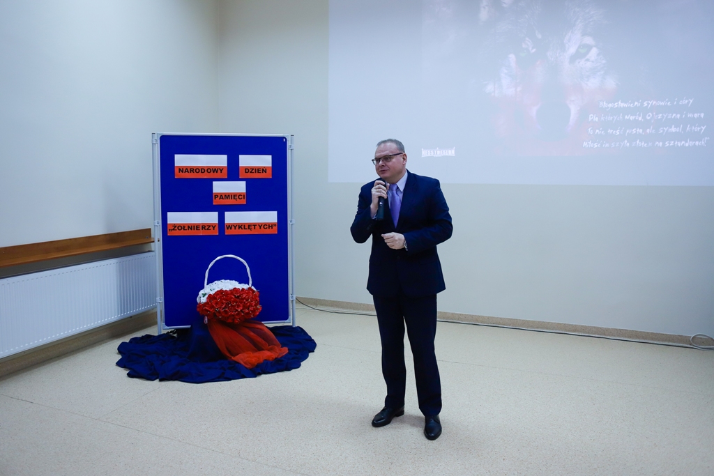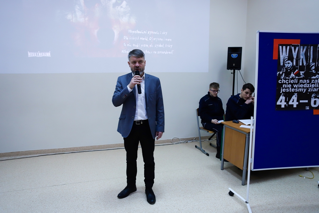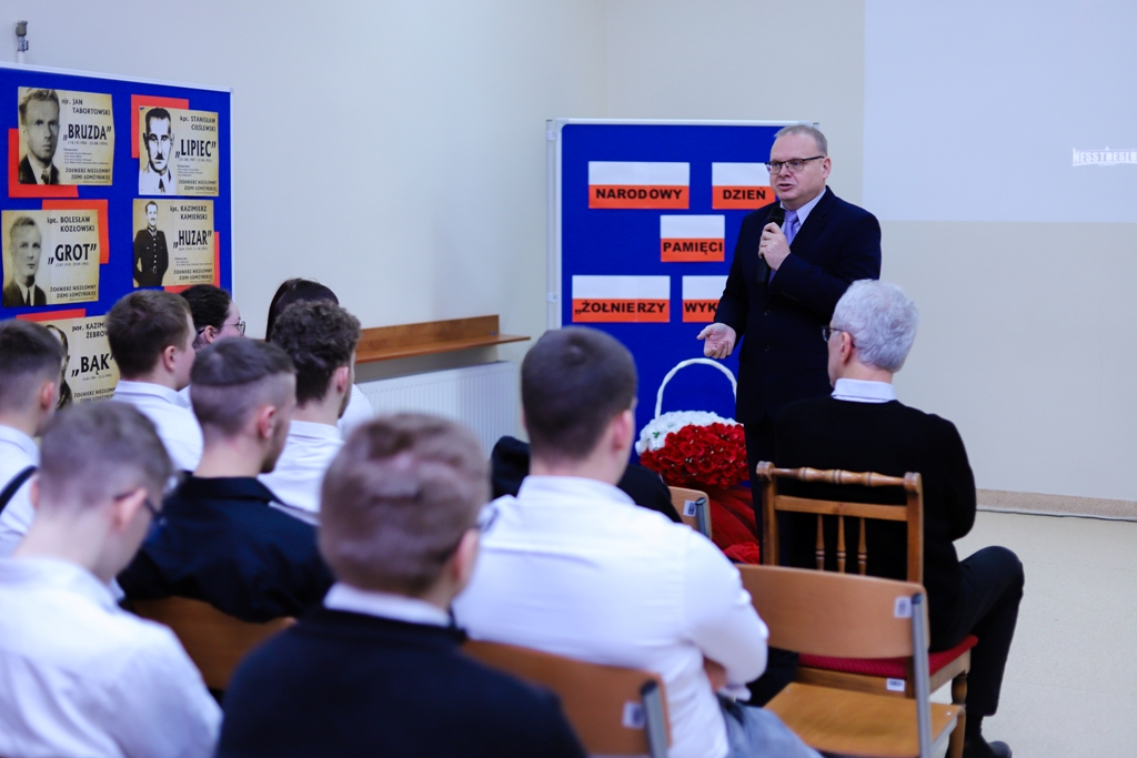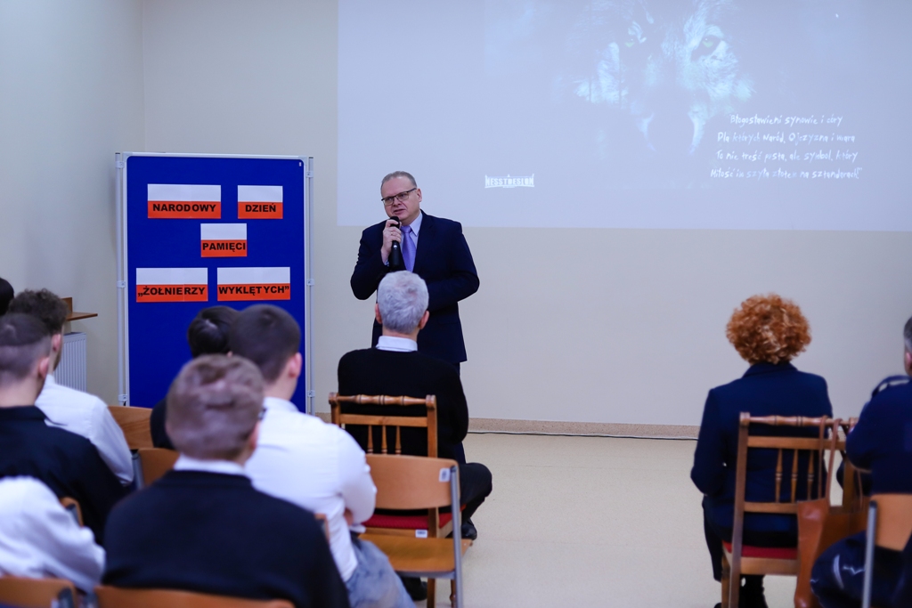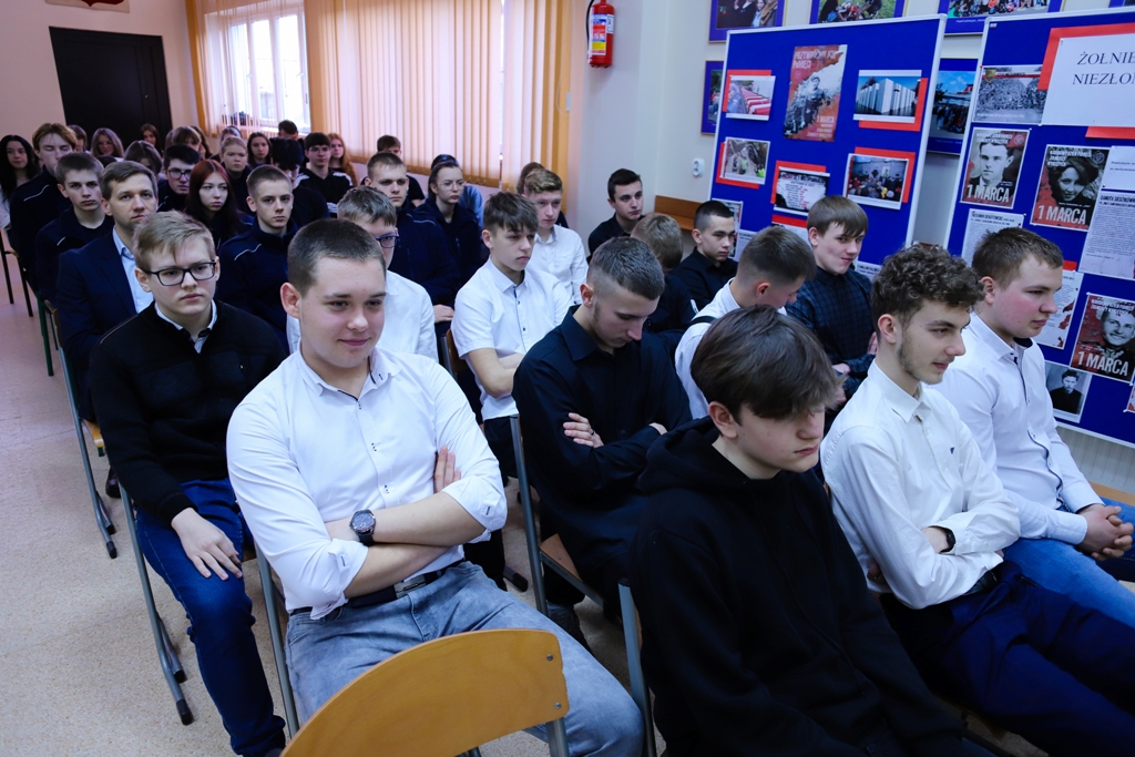 Integralną częścią szkolnych obchodów Narodowego Dnia Pamięci „Żołnierzy Wyklętych” był wykład dr hab. Krzysztofa Sychowicza Naczelnika Oddziałowego Biura Badań Historycznych IPN w Białymstoku. W swoim wystąpieniu przybliżył uczestnikom spotkania sylwetki żołnierzy drugiej konspiracji, podkreślając ich męstwo, niezłomną postawę patriotyczną i przywiązanie do tradycji niepodległościowych. Zaznaczył też , że aresztowani, torturowani i mordowani przez przedstawicieli władz komunistycznych żołnierze podziemia płacili najwyższą cenę za wierność i prawdę, ale celem ich walki była godność i wolność Rzeczypospolitej. Przypomniał tragiczne losy niektórych Żołnierzy Niezłomnych Ziemi Łomżyńskiej: mjr. Jana Tabortowskiego „Bruzdy”, Stanisława Cieślewskiego „Lipca”, por. Stanisława Grabowskiego „Wiarusa”, ,kpt. Bolesława Kozłowskiego „Grota”, por, Hieronima Rogińskiego „Roga”, którzy oddali swoje życie w walce z systemem komunistycznym. W interesujący sposób nakreślił sytuację Niezłomnych i ich -czasem trudne- relacje z miejscową ludnością cywilną. Ukazał też długi proces przywracania ich pamięci do świadomości współczesnego pokolenia, odwołując się do prac ekshumacyjnych na Łączce Cmentarza Powązkowskiego, która kryje do dziś bezimienne groby Żołnierzy Wyklętych.