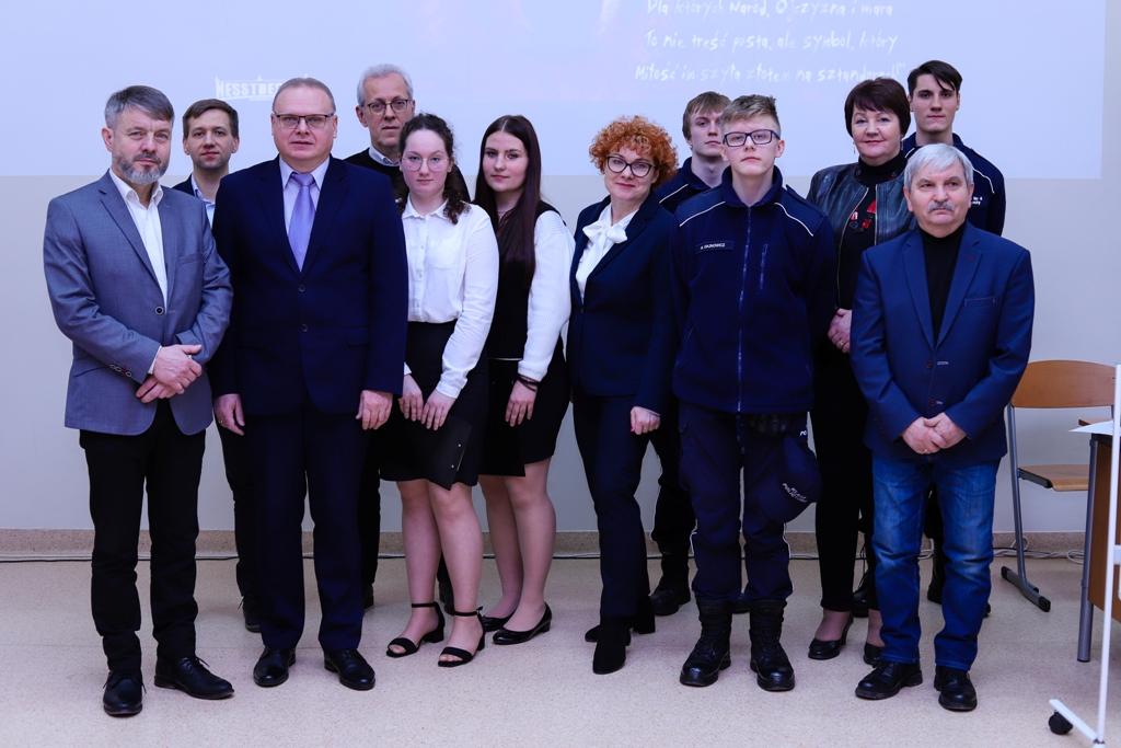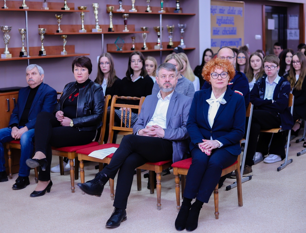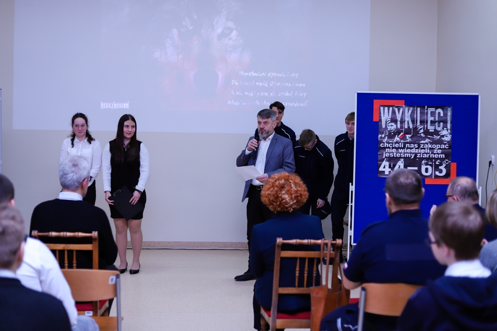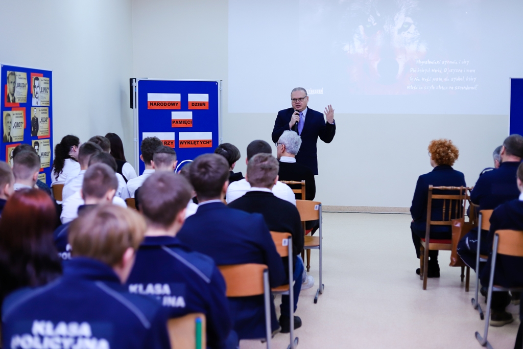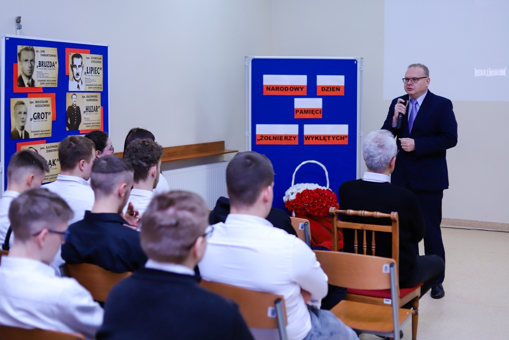 Integralną częścią szkolnych obchodów Narodowego Dnia Pamięci „Żołnierzy Wyklętych” był wykład dr hab. Krzysztofa Sychowicza Naczelnika Oddziałowego Biura Badań Historycznych IPN w Białymstoku. W swoim wystąpieniu przybliżył uczestnikom spotkania sylwetki żołnierzy drugiej konspiracji, podkreślając ich męstwo, niezłomną postawę patriotyczną i przywiązanie do tradycji niepodległościowych. Zaznaczył też , że aresztowani, torturowani i mordowani przez przedstawicieli władz komunistycznych żołnierze podziemia płacili najwyższą cenę za wierność i prawdę, ale celem ich walki była godność i wolność Rzeczypospolitej. Przypomniał tragiczne losy niektórych Żołnierzy Niezłomnych Ziemi Łomżyńskiej: mjr. Jana Tabortowskiego „Bruzdy”, Stanisława Cieślewskiego „Lipca”, por. Stanisława Grabowskiego „Wiarusa”, ,kpt. Bolesława Kozłowskiego „Grota”, por, Hieronima Rogińskiego „Roga”, którzy oddali swoje życie w walce z systemem komunistycznym. W interesujący sposób nakreślił sytuację Niezłomnych i ich -czasem trudne- relacje z miejscową ludnością cywilną. Ukazał też długi proces przywracania ich pamięci do świadomości współczesnego pokolenia, odwołując się do prac ekshumacyjnych na Łączce Cmentarza Powązkowskiego, która kryje do dziś bezimienne groby Żołnierzy Wyklętych.