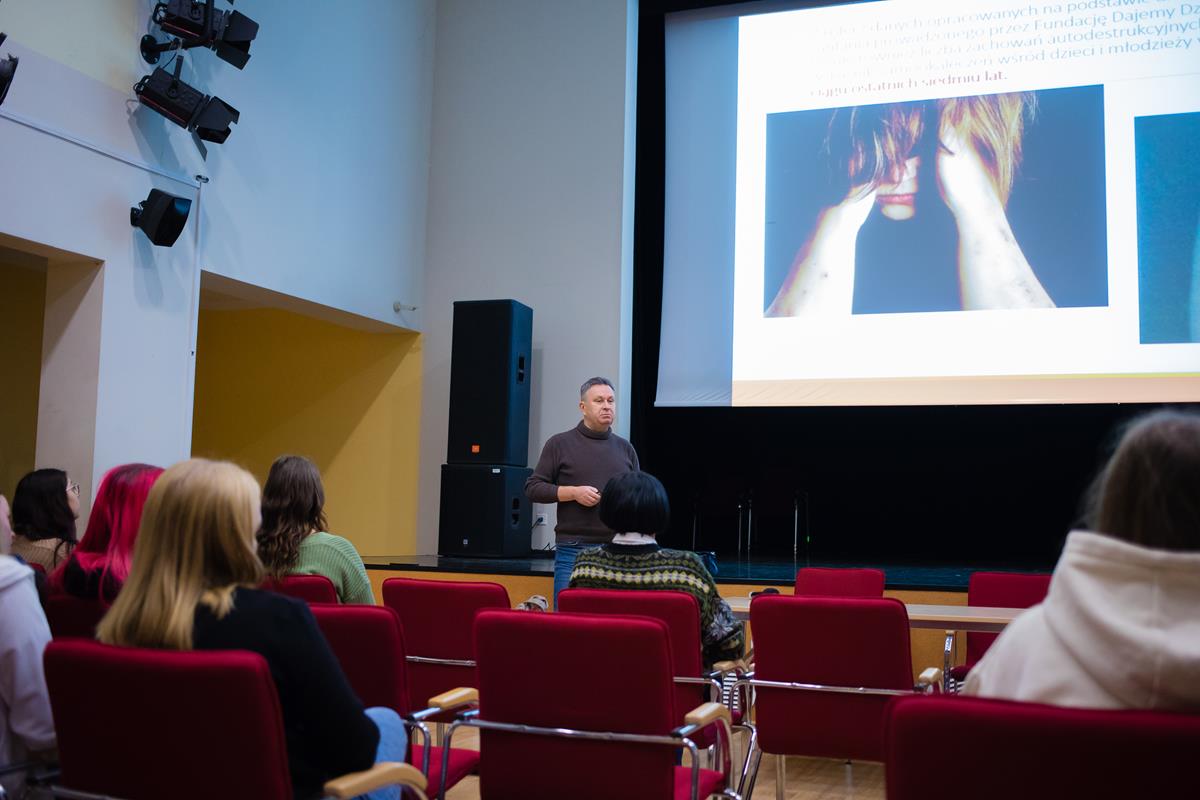 Podczas spotkania przygotowanego profesjonalnie ze strony Dyrekcji i Zespołu Wychowawczego placówki uczniowie poznali jej działalność, nowatorskie programy i projekty oraz kierunki pracy z dziewczętami, które po traumatycznym dzieciństwie „pogubiły się lub miały pecha w życiu”. Pan Dyrektor MOW w swojej prezentacji, wzbogaconej krótkimi filmami-świadectwami przeżyć wychowanek i teledyskami o niezwykle emocjonalnej treści oraz w odpowiadając na pytania uczniów, wskazał demoralizację (wagary, narkotyki, alkohol, agresję) jako główną przyczynę kierowania młodzieży do placówki. Podkreślił, jak ważne dla młodego człowieka jest spotkanie na swojej drodze osób, które go wysłuchają i udzielą potrzebnego wsparcia. Następnie pan Dyrektor przedstawił dzień wychowanek MOW-u oraz bogatą ofertę zajęć dodatkowych, umożliwiających odkrycie przez dziewczęta własnego potencjału. Podkreślił, że życie polega na dokonywaniu wyborów, dlatego każdy młody człowiek powinien umieć dostrzec swoje mocne strony oraz rozwijać pasje i talenty, bo one wzmacniają poczucie własnej wartości. Przestrzegając przed zagrożeniami w sieci i tzw. „wirtualnymi autorytetami” oraz powierzchownym ocenianiem czyjegoś zachowania, skłonił uczniów do refleksji nad własnym postępowaniem.
