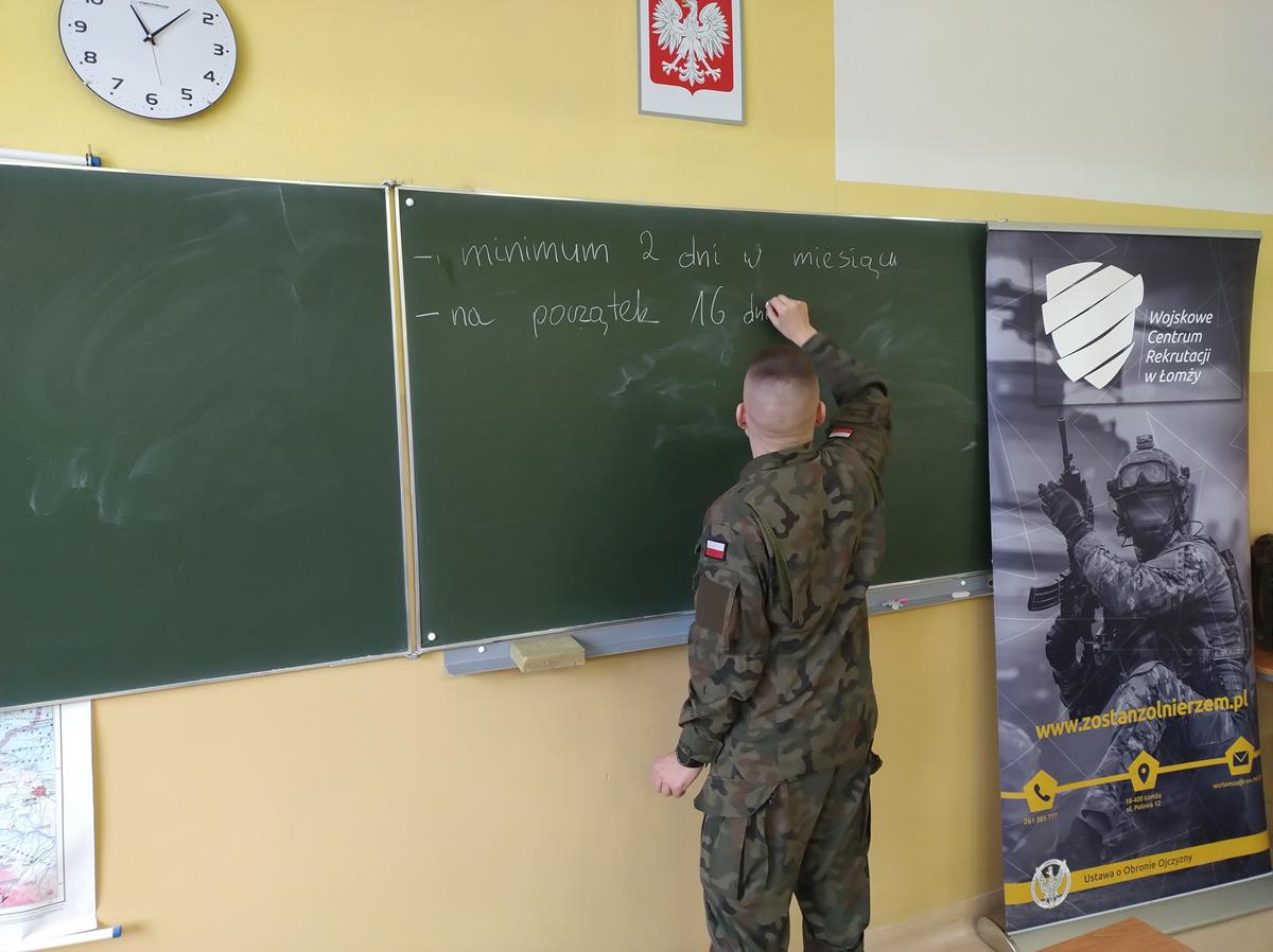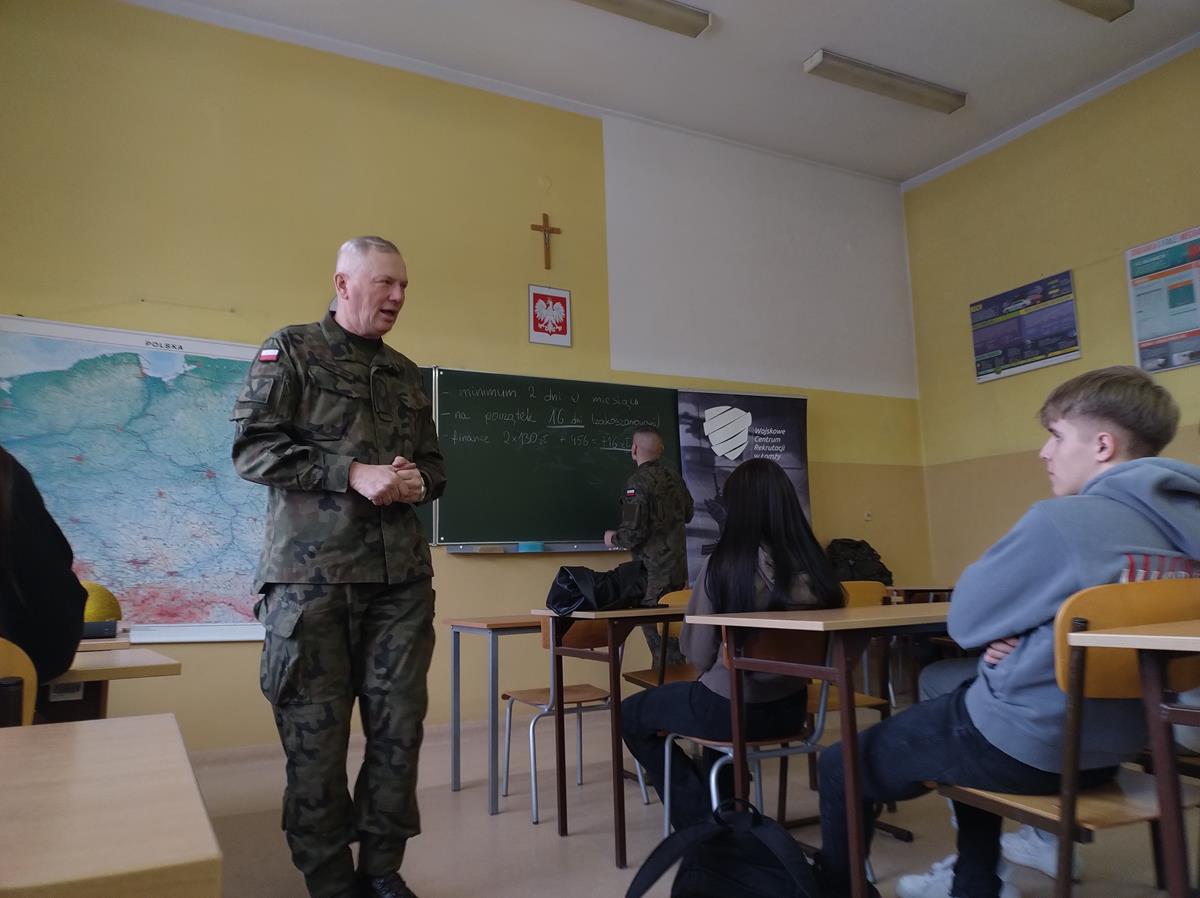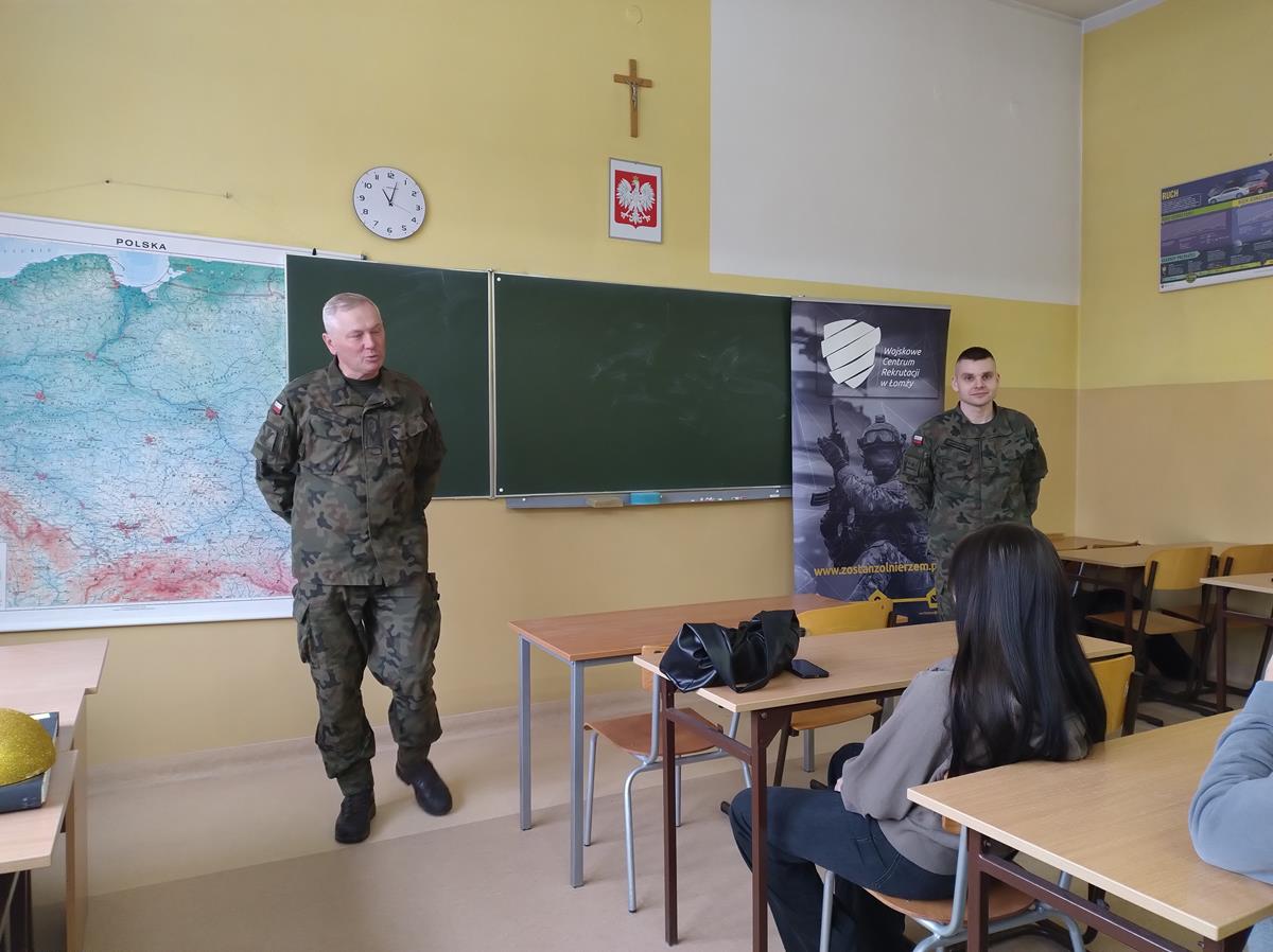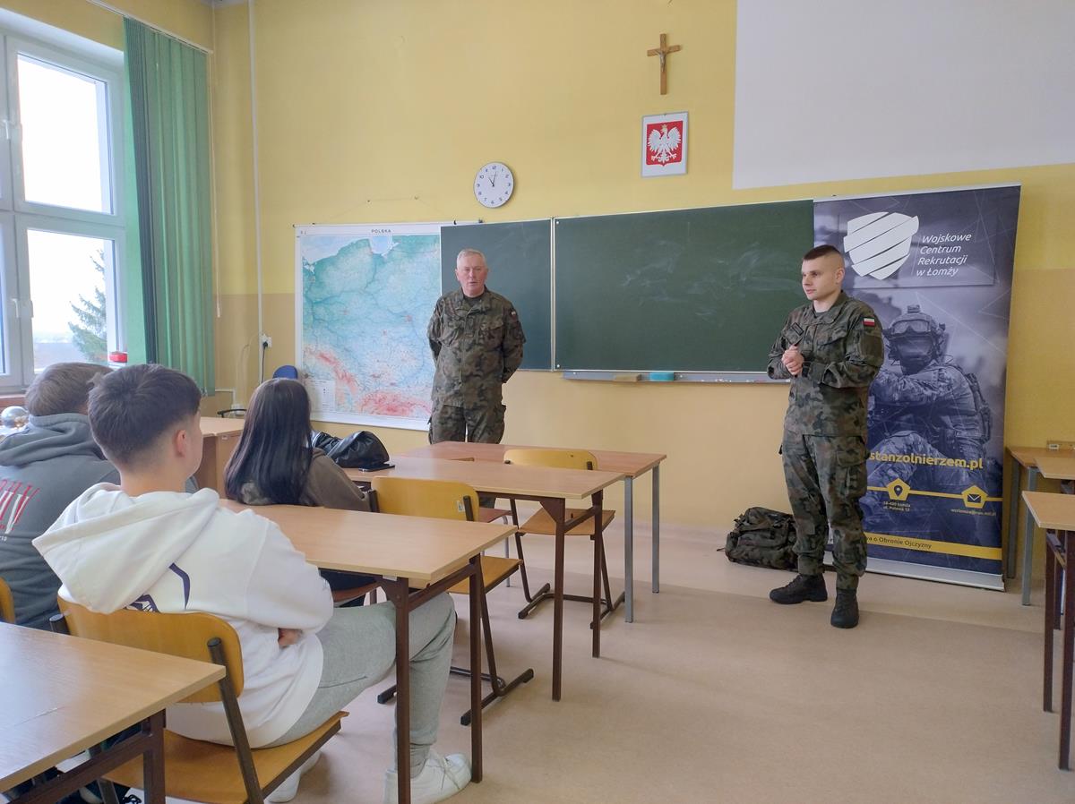 W dniu 12.12.2023 r. przedstawiciele Wojskowego Centrum Rekrutacji - ppor. Marcin Sadziński oraz 1 Podlaskiej Brygady Obrony Terytorialnej - 13 Batalionu Lekkiej Piechoty w Łomży - sierż. Bogdan Wiśniewski, spotkali się z młodzieżą klasy 4AP o profilu policyjnym.