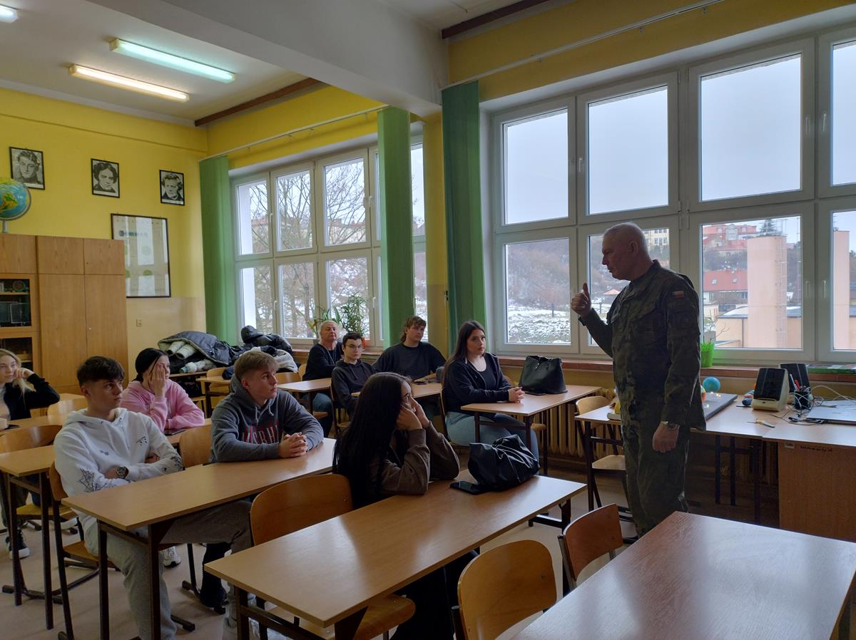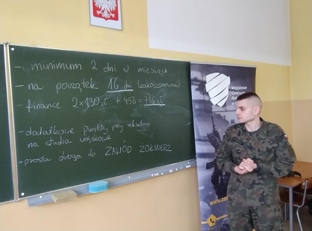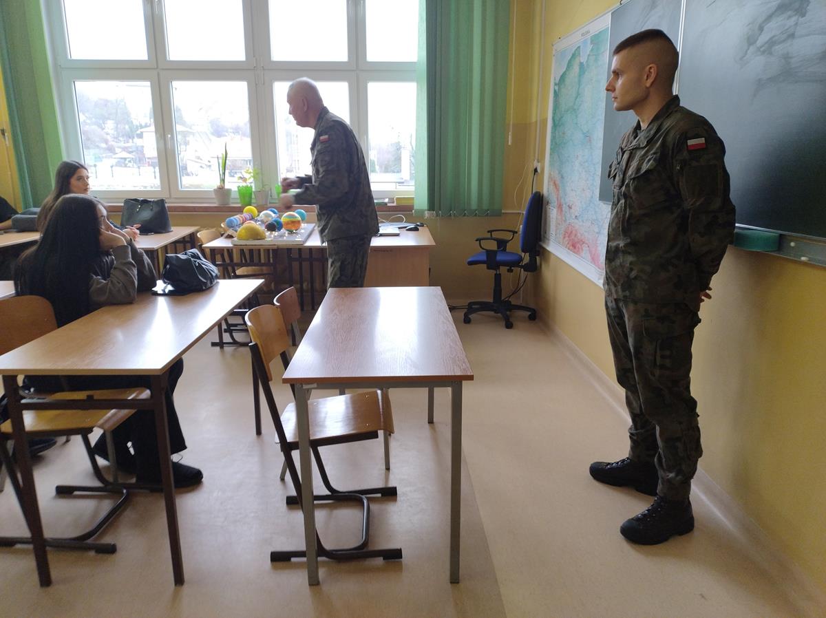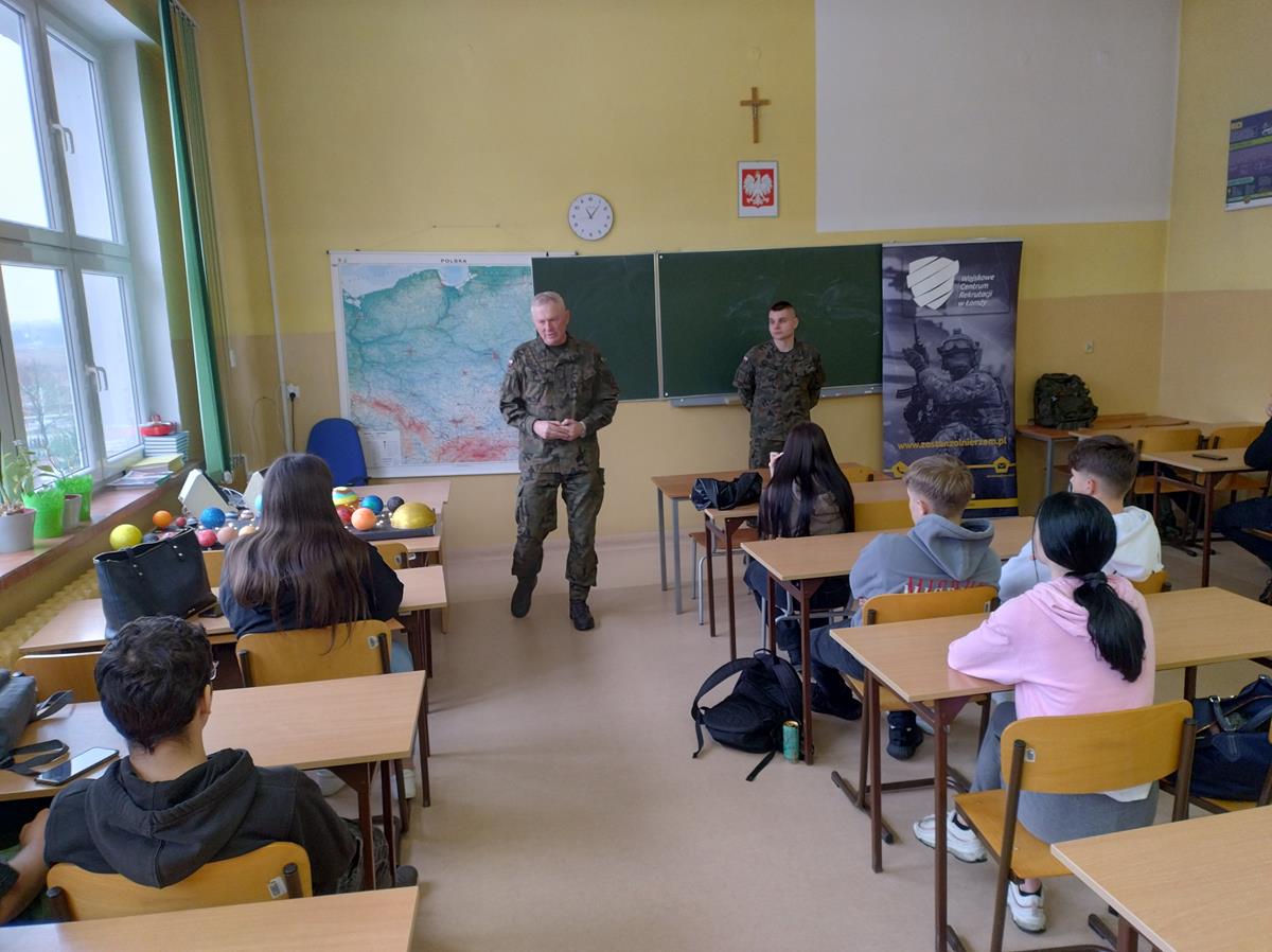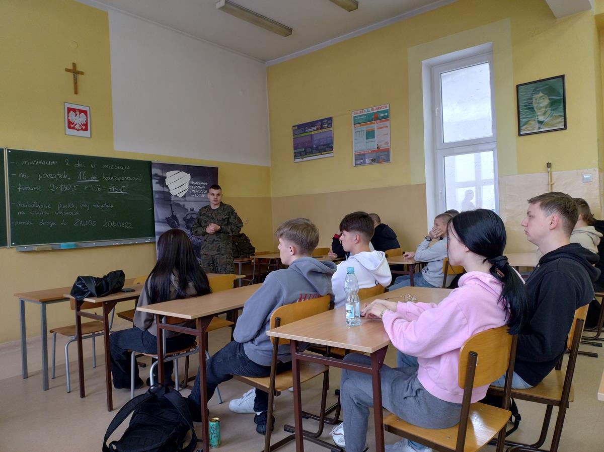 W dniu 12.12.2023 r. przedstawiciele Wojskowego Centrum Rekrutacji - ppor. Marcin Sadziński oraz 1 Podlaskiej Brygady Obrony Terytorialnej - 13 Batalionu Lekkiej Piechoty w Łomży - sierż. Bogdan Wiśniewski, spotkali się z młodzieżą klasy 4AP o profilu policyjnym.