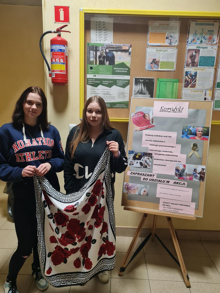 Klasy 2ZZ i 3ZZ Branżowej Szkoły I Stopnia wraz z wychowawcą Elżbietą Bednarczyk i opiekunem Samorządu Uczniowskiego P. Alicją Wirtel rozpoczęły zbiórkę chust i szali na rzecz kobiet chorujących na raka ze Stowarzyszenia „Eurydyki” w Białymstoku.
