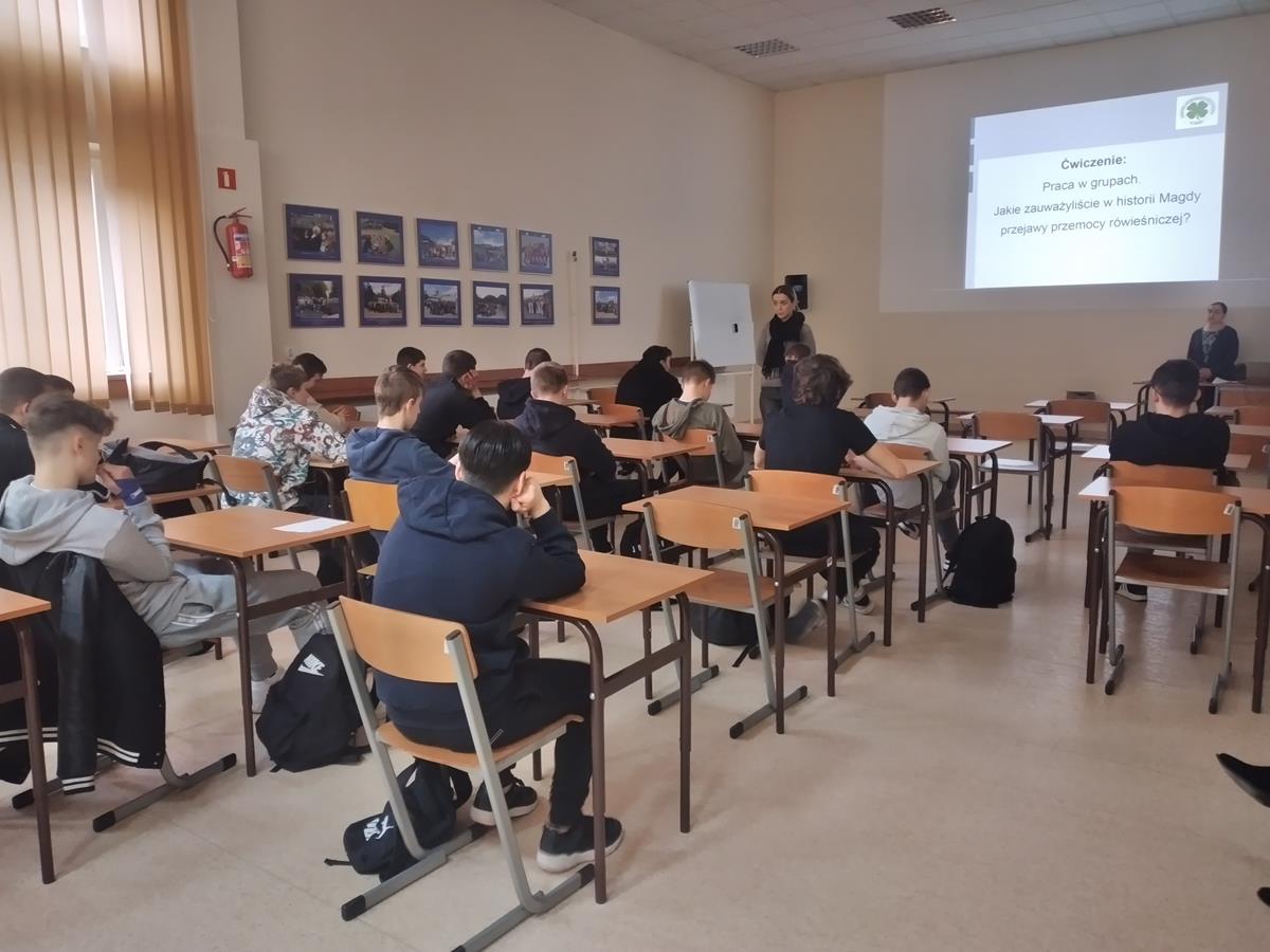 W dniach 20.02.2024 r. i 21.02.2024 r. r. uczniowie z klas 1 AP, 1 PP oraz 1 MZ/MU i 2aTB wzięli udział w warsztatach profilaktycznych „Przemoc rówieśnicza” prowadzonych przez specjalistów z Ośrodka Interwencji Kryzysowej w Łomży. Uczniowie podczas spotkania poszerzyli swoją wiedzę na temat zjawiska przemocy rówieśniczej w świecie realnym i cyberprzestrzeni. Dowiedzieli się jak reagować na przemoc rówieśniczą oraz z jakiej pomocy mogą skorzystać.