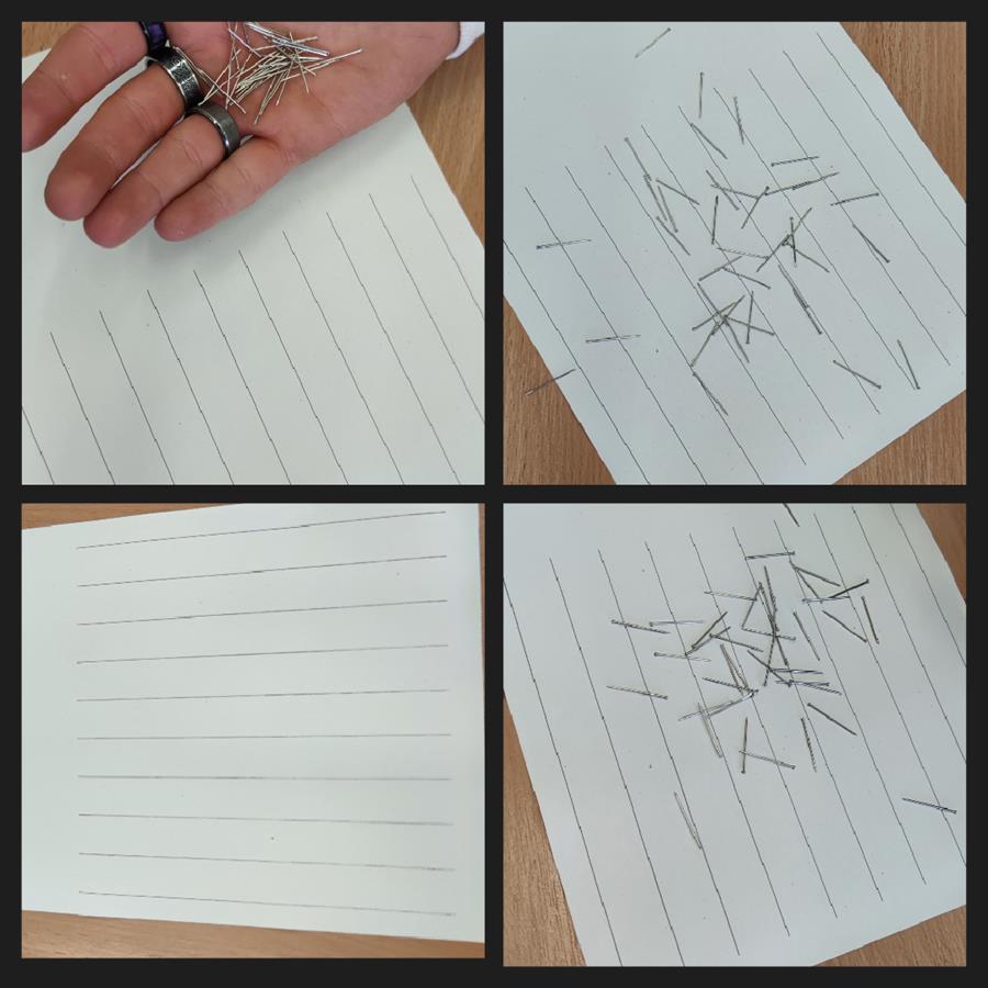 stałą odległość i badamy iloraz upuszczanej na tę planszę pewnej ilość szpilek przez ilość szpilek, które przecięły którąś z linii.