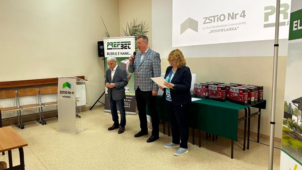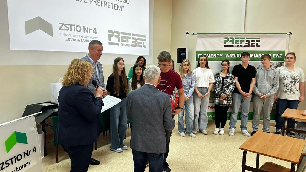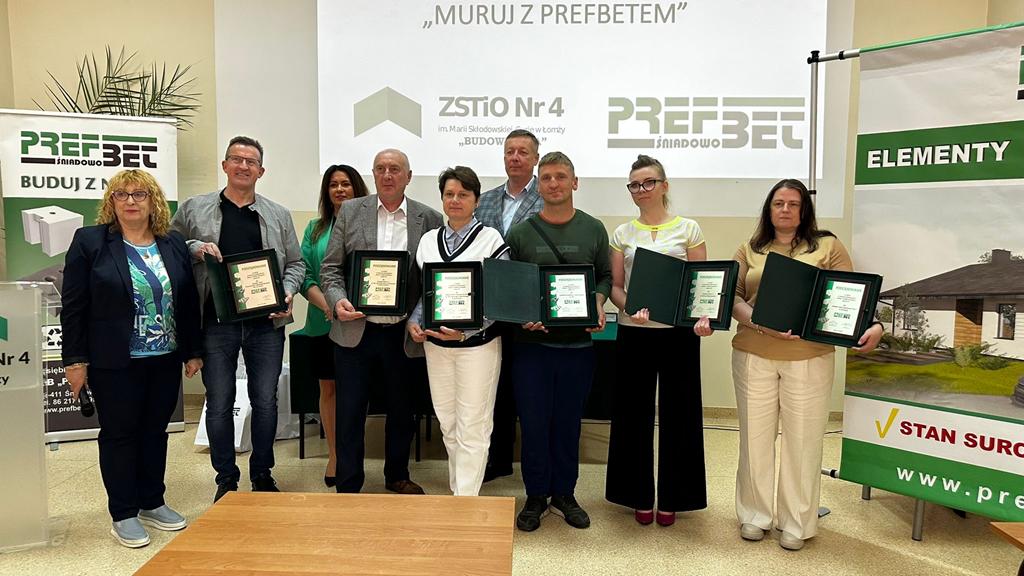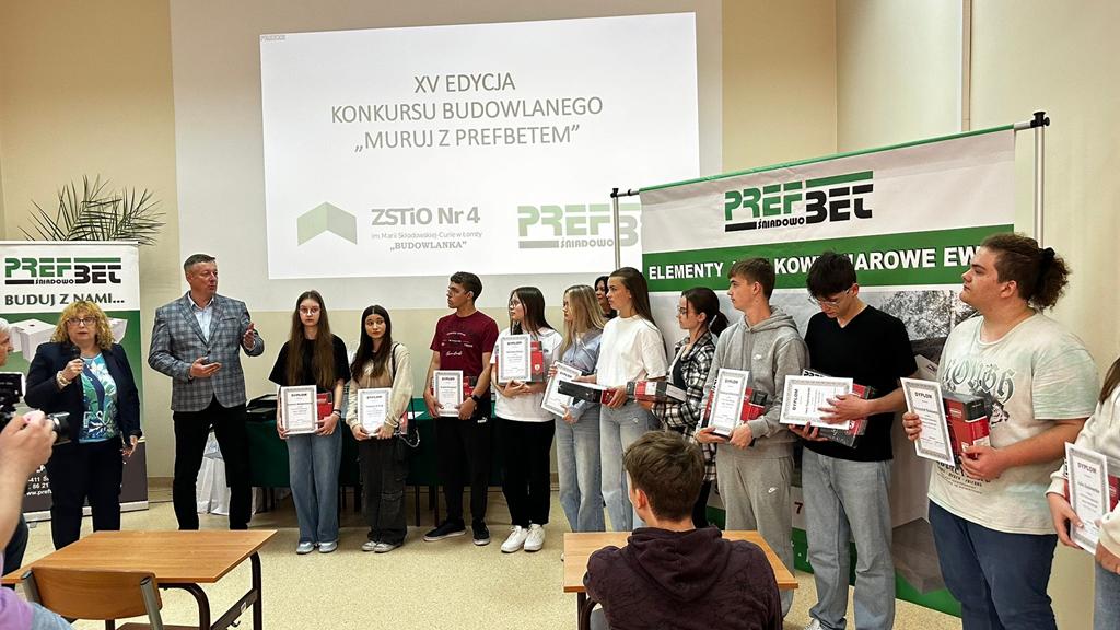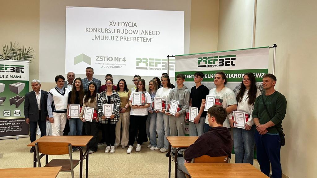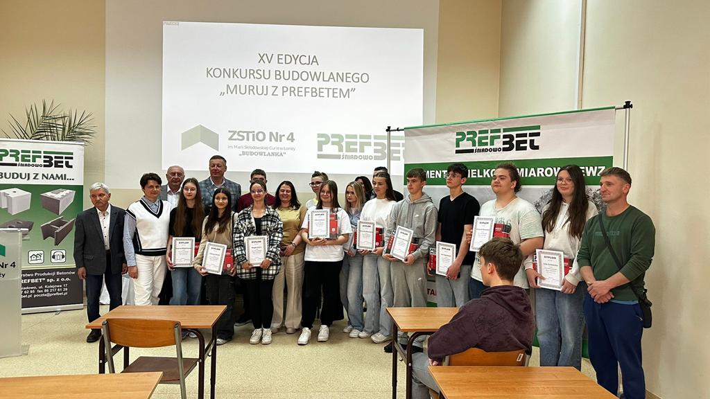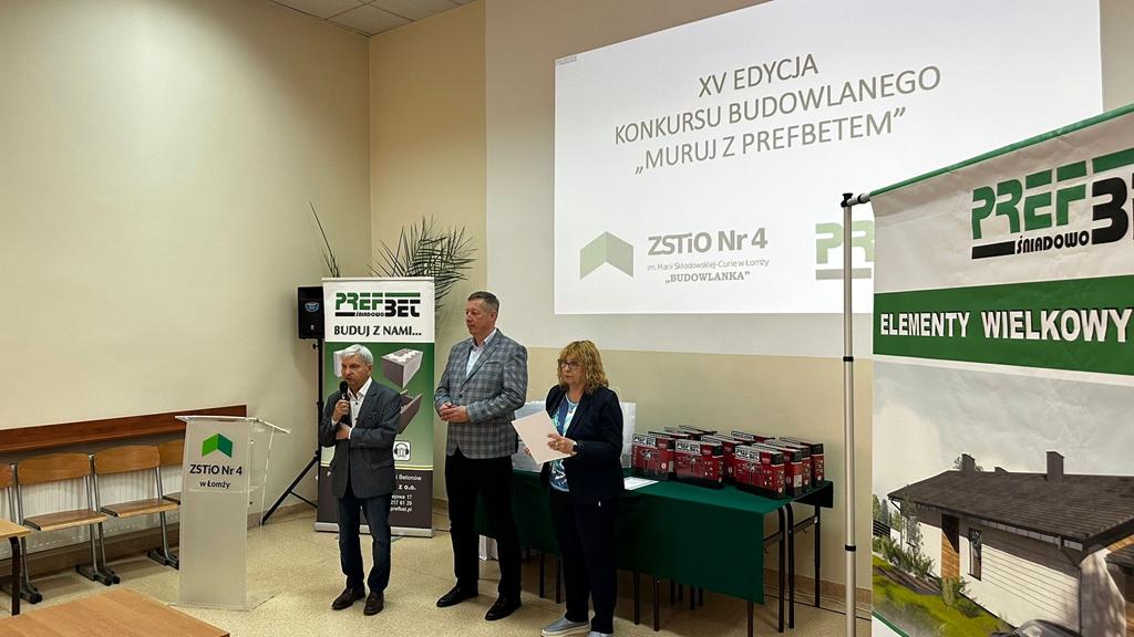 22 maja 2025 roku w Zespole Szkół Technicznych i Ogólnokształcących Nr 4 odbyła się piętnasta jubileuszowa edycja konkursu budowlanego „Muruj z Prefbetem”. Do naszej szkoły przybyli uczniowie z zaprzyjaźnionych szkól budowlanych. Celem konkursu było zapoznanie z technologią murowania ścian z bloczków gazobetonowych i innych elementów konstrukcyjnych produkowanych przez sponsora konkursu firmę PREFBET – ŚNIADOWO. W tym roku w konkursie uczestniczyło sześć szkół: ZSZ Nr 5 w Białymstoku, ZS Nr 1 w Bielsku Podlaskim, ZSZ Nr 2 w Ostrołęce, CKZ w Ełku, ZS nr 1 w Ostrowi Mazowieckiej i ZSTiO Nr 4 w Łomży.
