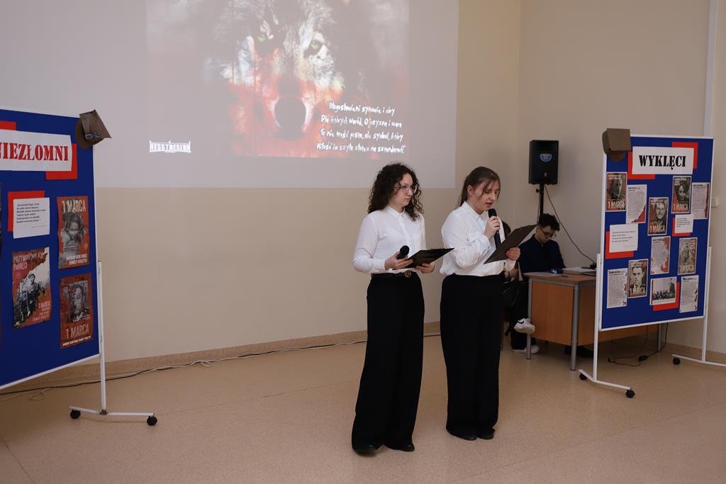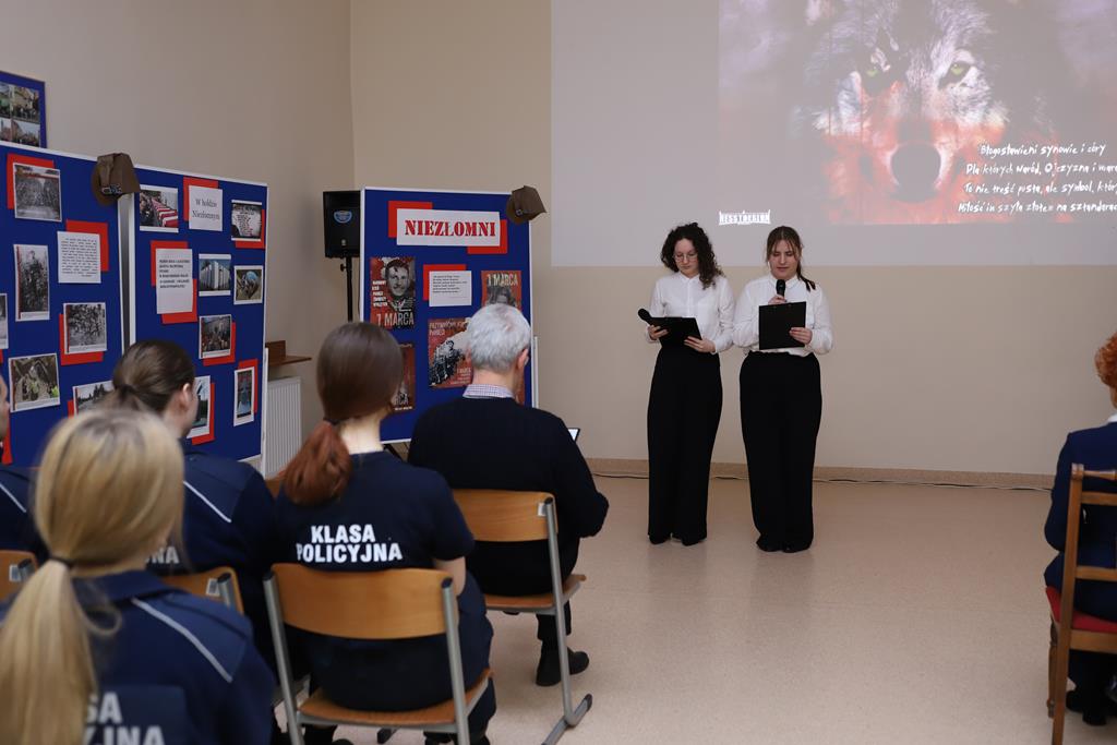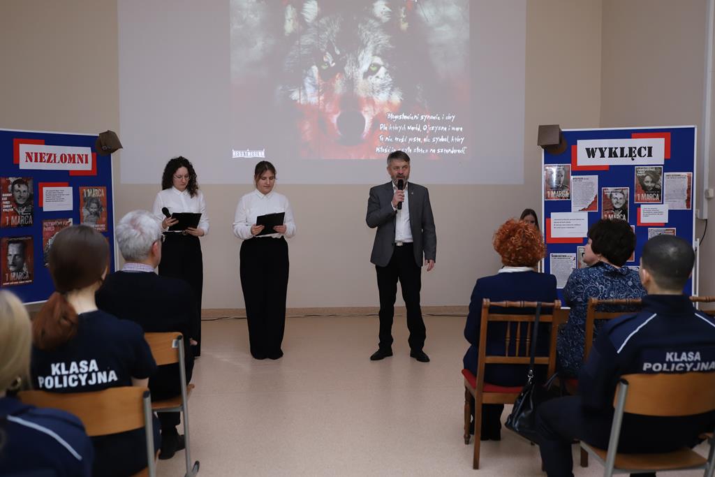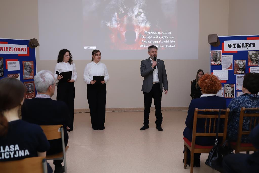 Pan Dyrektor Artur Ciborowski, rozpoczynając uroczystość, podkreślił wieloletnią tradycję obchodów Narodowego Dnia Pamięci Żołnierzy Wyklętych w szkole jako elementu wychowania patriotycznego młodzieży. Następnie uczennice z klasy 3 PP: Zofia Cwalina i Maja Klimaszewska przybliżyły losy Żołnierzy Niezłomnych.