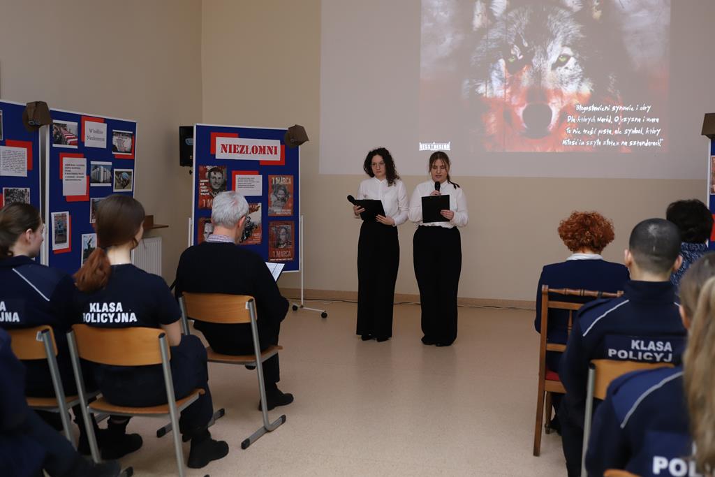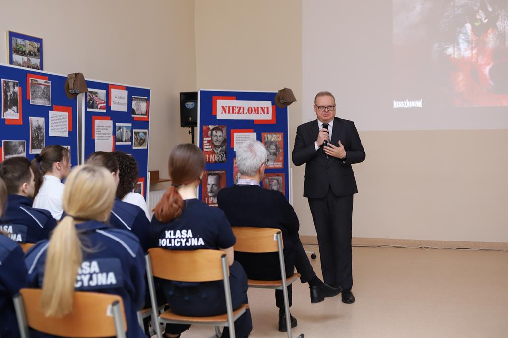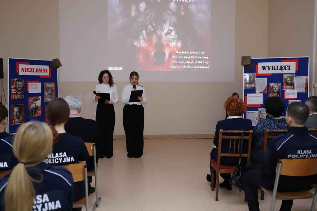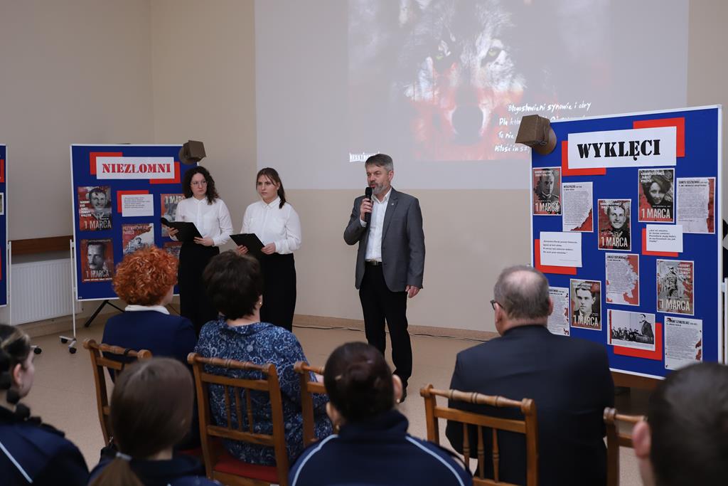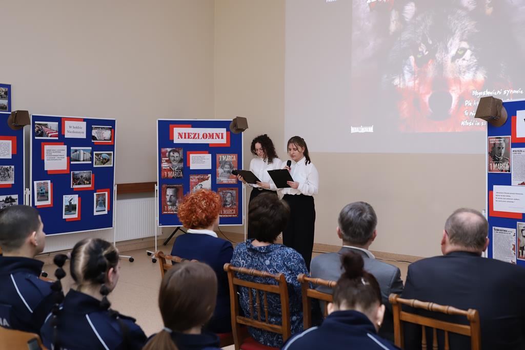 Pan Dyrektor Artur Ciborowski, rozpoczynając uroczystość, podkreślił wieloletnią tradycję obchodów Narodowego Dnia Pamięci Żołnierzy Wyklętych w szkole jako elementu wychowania patriotycznego młodzieży. Następnie uczennice z klasy 3 PP: Zofia Cwalina i Maja Klimaszewska przybliżyły losy Żołnierzy Niezłomnych.