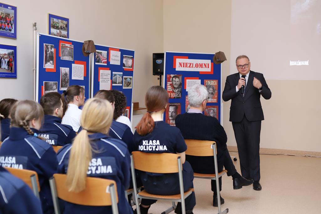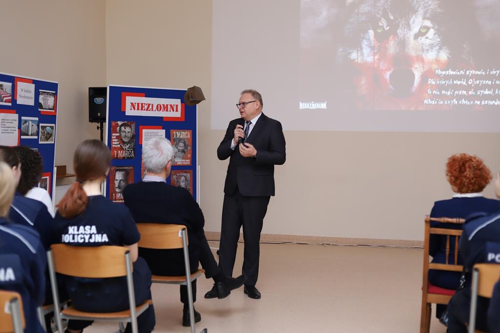 Główną częścią spotkania była prelekcja Naczelnika Oddziałowego Biura Badań Historycznych IPN w Białymstoku - Pana dr. hab. Krzysztofa Sychowicza. Wykład dotyczył dramatycznych losów żołnierzy polskiego podziemia niepodległościowego i ich rodzin w okresie stalinowskim. Prezentując sylwetki Niezłomnych m.in.: kapitana Stanisława Cieślewskiego „Lipca”, majora Jana Tabortowskiego „Bruzdy”, rotmistrza Witolda Pileckiego i Łukasza Cieplińskiego – dowódcy Armii Krajowej i IV Komendy Zrzeszenia Wolność i Niezawisłość zamordowanego 1 marca 1951r. oraz innych, którzy oddali swoje życie w walce z systemem komunistycznym, prelegent podkreślił ich męstwo, niezłomną postawę patriotyczną i wierność polskim wartościom.Zwrócił też uwagę na potrzebę i obowiązek przywracania oraz pielęgnowania pamięci o Niezłomnych przez młode pokolenia bez względu na przekonania polityczne. „Bowiem pomniki można zburzyć , ale pamięci nic nie zniszczy –jest fundamentem tożsamości narodowej.”Do niej też nawiązywały utwory: „Ku pamięci”- łomżyńskiej grupy PsG Klika i „Kto dziś upomni się o pamięć”- zespołu Forteca.