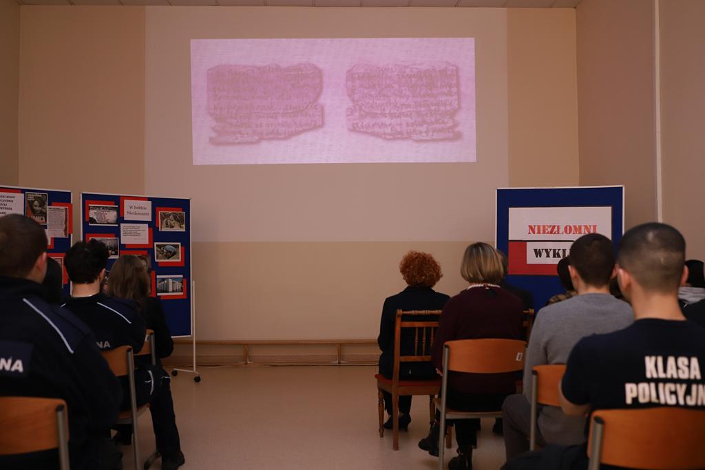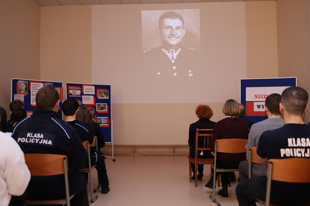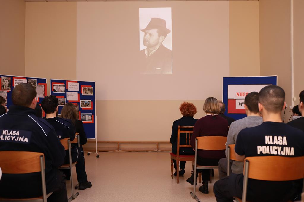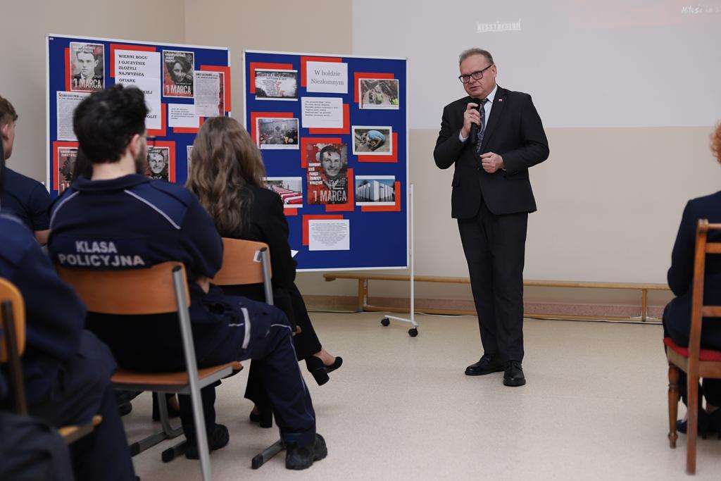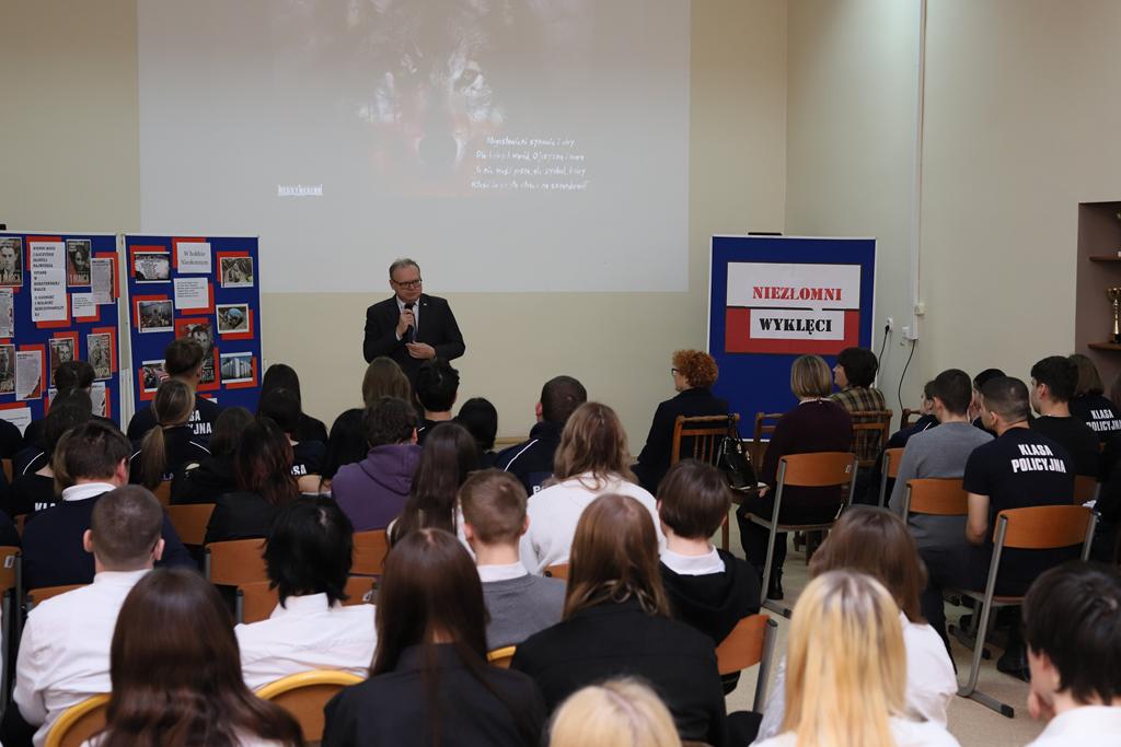 Kluczowym częścią uroczystości była prelekcja pana dr. hab. Krzysztofa Sychowicza Dyrektora Oddziału IPN w Białymstoku . W swoim wykładzie na przykładach podpułkownika Łukasza Cieplińskiego- „Pługa” – dowódcy Armii Krajowej i IV Komendy Zrzeszenia Wolność i Niezawisłość -zamordowanego 1 marca 1951r., rotmistrza Witolda Pileckiego, Danuty Siedzikówny „Inki”, majora Zygmunta Szendzielarza –„Łupaszki” oraz innych, którzy oddali swoje życie w walce z systemem komunistycznym, ukazał dramat żołnierzy polskiego podziemia niepodległościowego, uznawanych przez władze PRL za „bandytów”. Zaprezentował również sylwetki Niezłomnych związanych rejonem łomżyńskim m.in.: kapitana Stanisława Cieślewskiego „Lipca”, majora Jana Tabortowskiego „Bruzdy”, Stanisława Marchewki „Ryby”. W swojej prelekcji wskazał młodzieży ślady Niezłomnych w przestrzeni dzisiejszej Łomży –np. miejsce ich torturowania i kaźni w dawnym Urzędzie Bezpieczeństwa przy ulicy Nowogrodzkiej 5. Skierował też przesłanie do młodzieży- obowiązek trwania w prawdzie i kultywowania pamięci o żołnierzach drugiej konspiracji za świadectwo ich męstwa, niezłomnej postawy patriotycznej i przywiązania do tradycji niepodległościowych, które są istotne dla zachowania tożsamości narodowej. Wzmocnieniem tego przesłania w programie uroczystości były utwory muzyczne : „Ku pamięci”- łomżyńskiej grupy PsG Klika i „Kto dziś upomni się o pamięć”- zespołu Forteca.