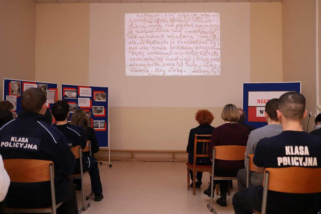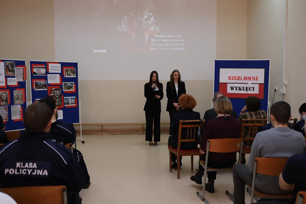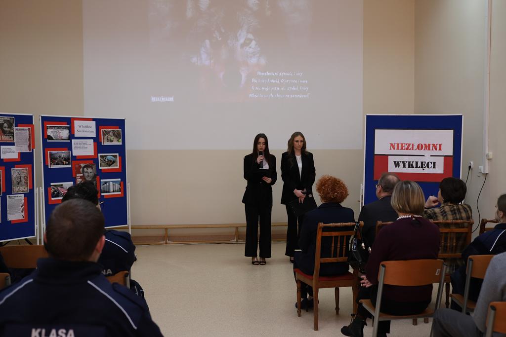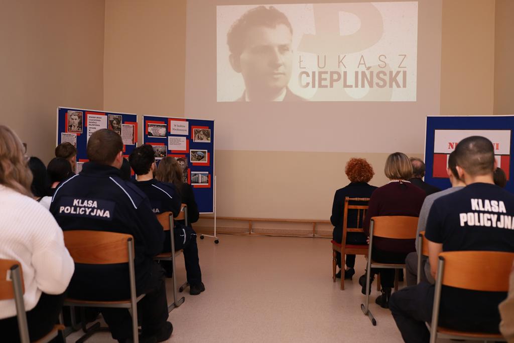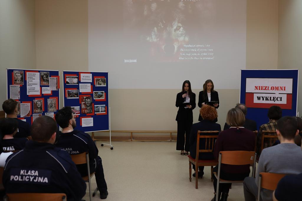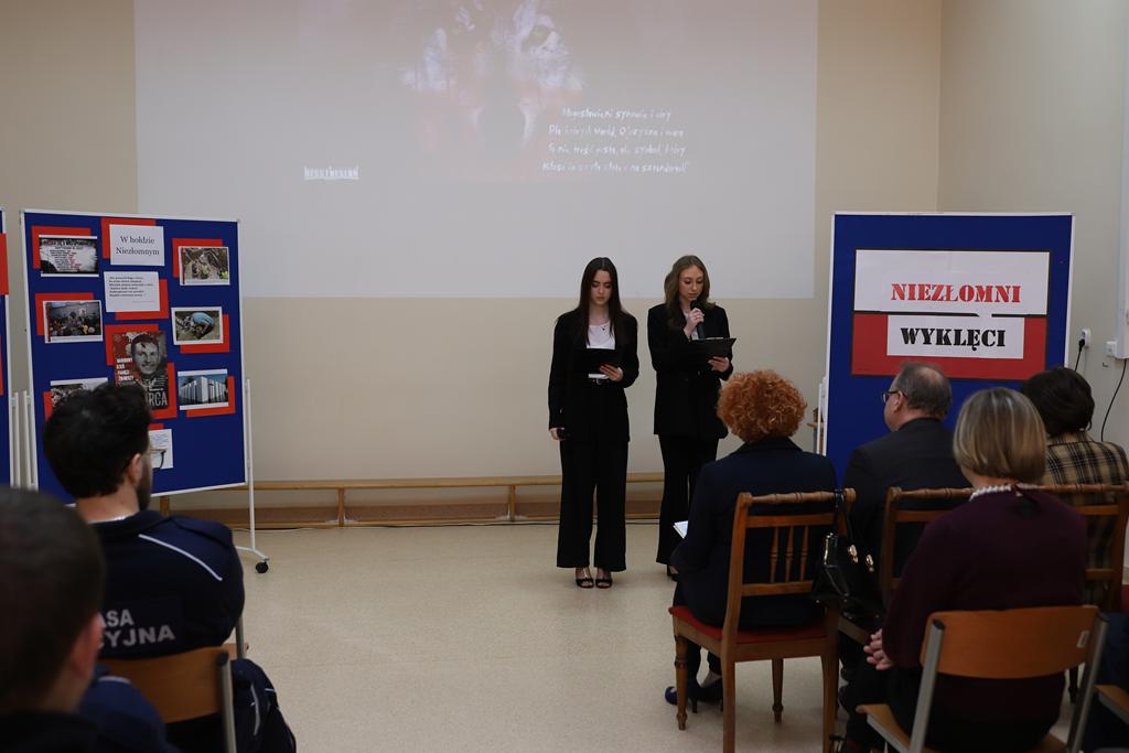 Wzruszające fragmenty „Grypsów z celi śmierci”- zapisków z więzienia podpułkownika Łukasza Cieplińskiego, będących pożegnaniem z bliskimi, a także testamentem dla syna Andrzeja ,wprowadziły w klimat spotkania. Uczennice : Dominika Pogroszewska (2 AP) i Aleksandra Wieczorek (2PP) przybliżyły uczestnikom spotkania historię Żołnierzy Niezłomnych.