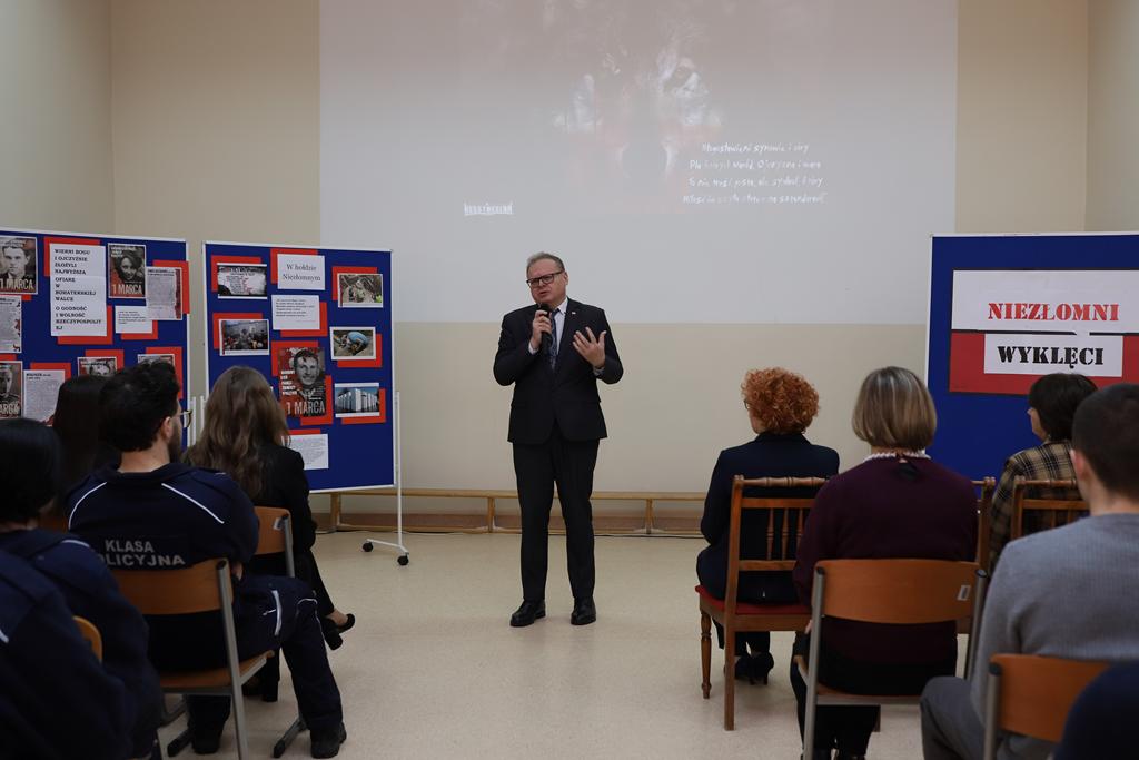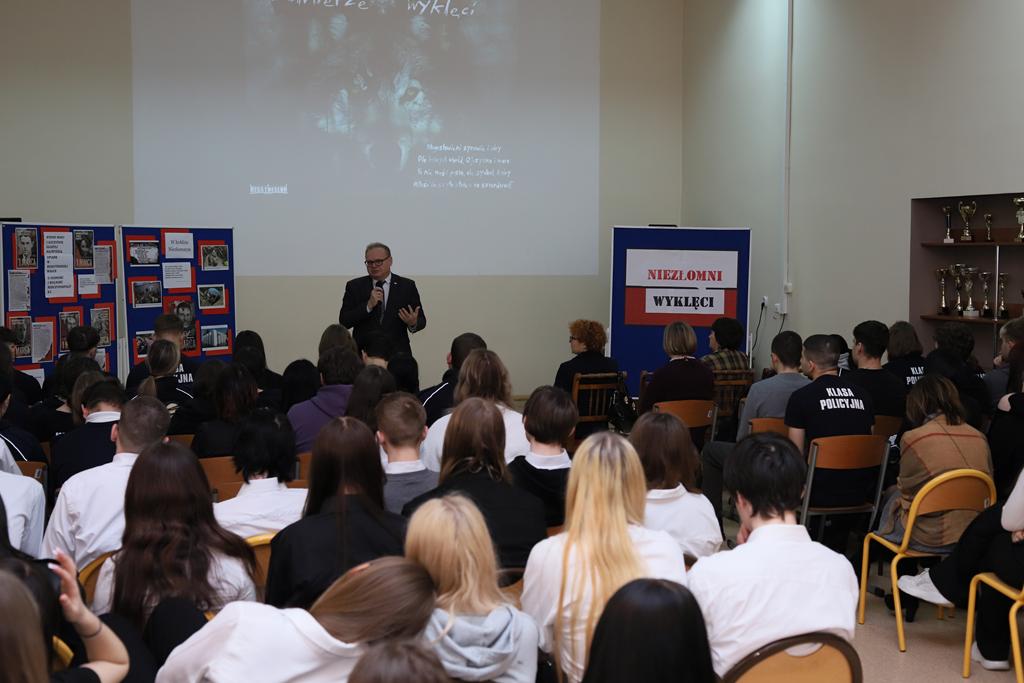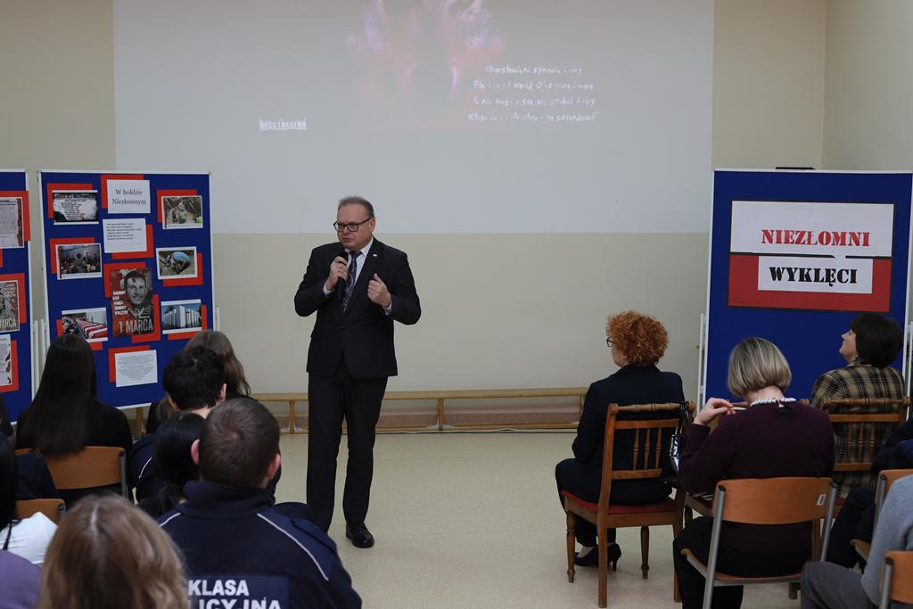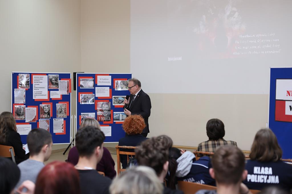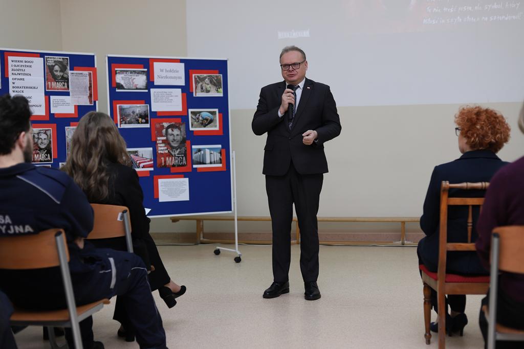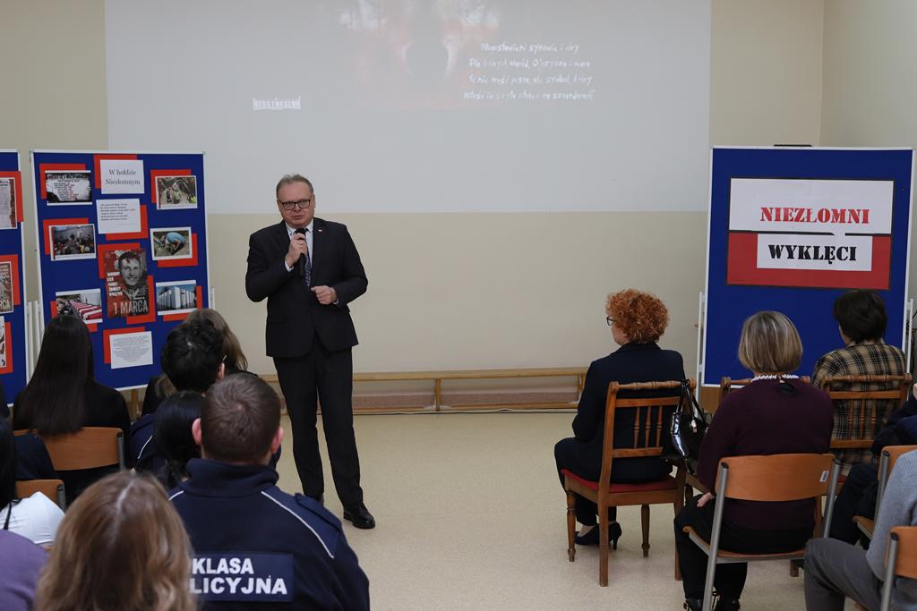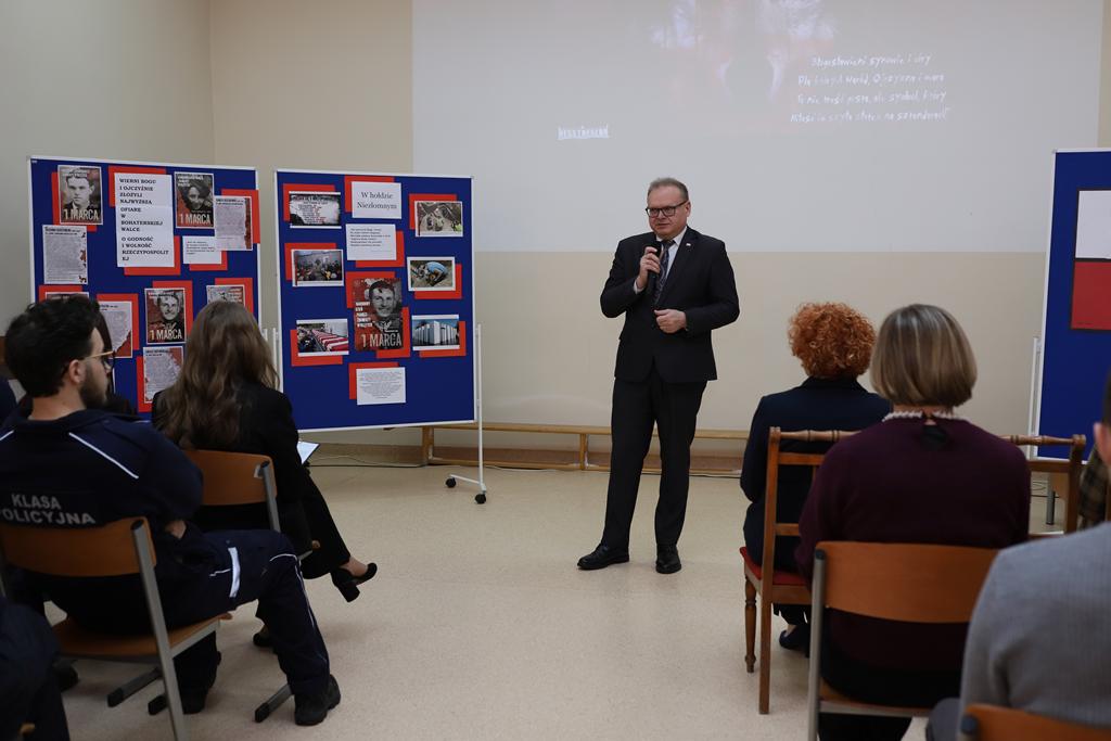 Pani wicedyrektor Maria Gawryś , dziękując panu Dyrektorowi Oddziału IPN w Białymstoku za interesujący wykład i wieloletnią współpracę w organizacji szkolnych obchodów tego narodowego święta , podkreśliła wagę faktu , że dziś młodzi ludzie mogą uczyć się o Żołnierzach Niezłomnych, bo w czasach jej edukacji szkolnej było to niemożliwe.