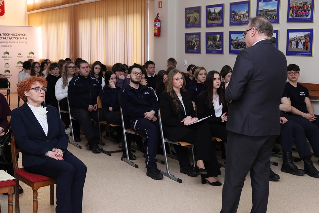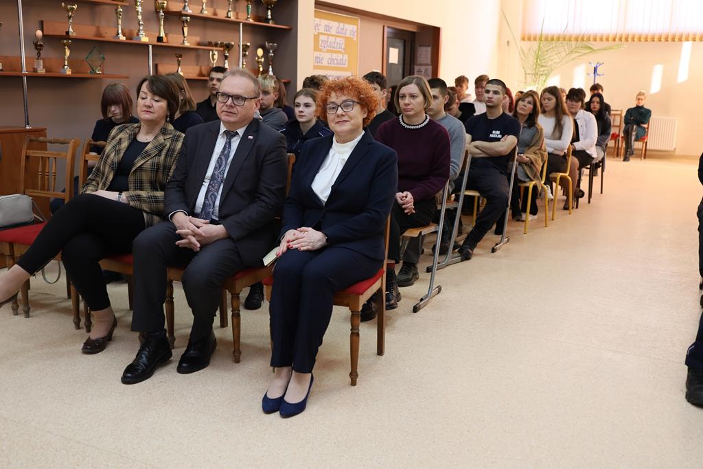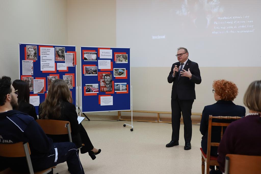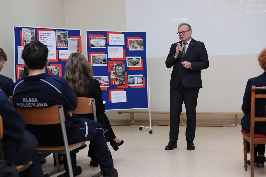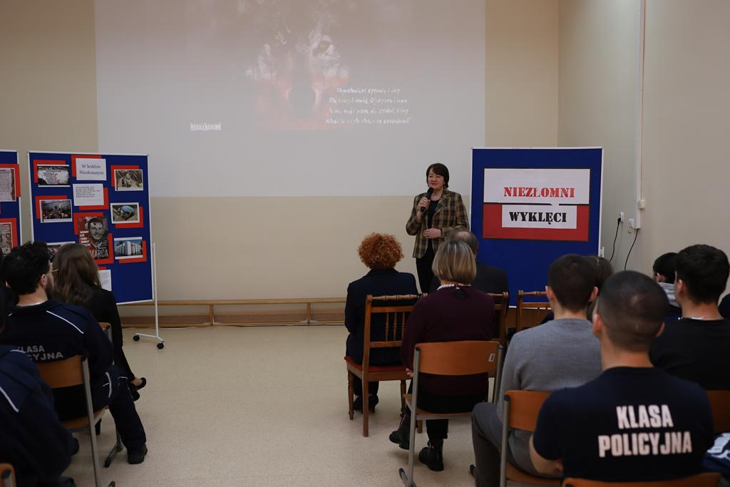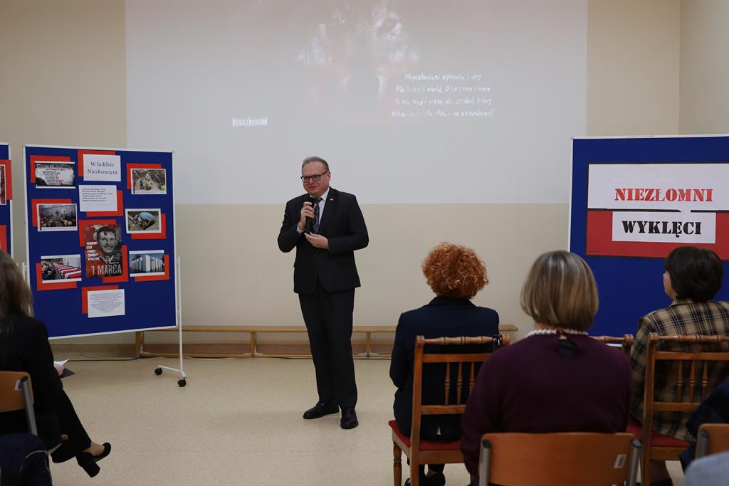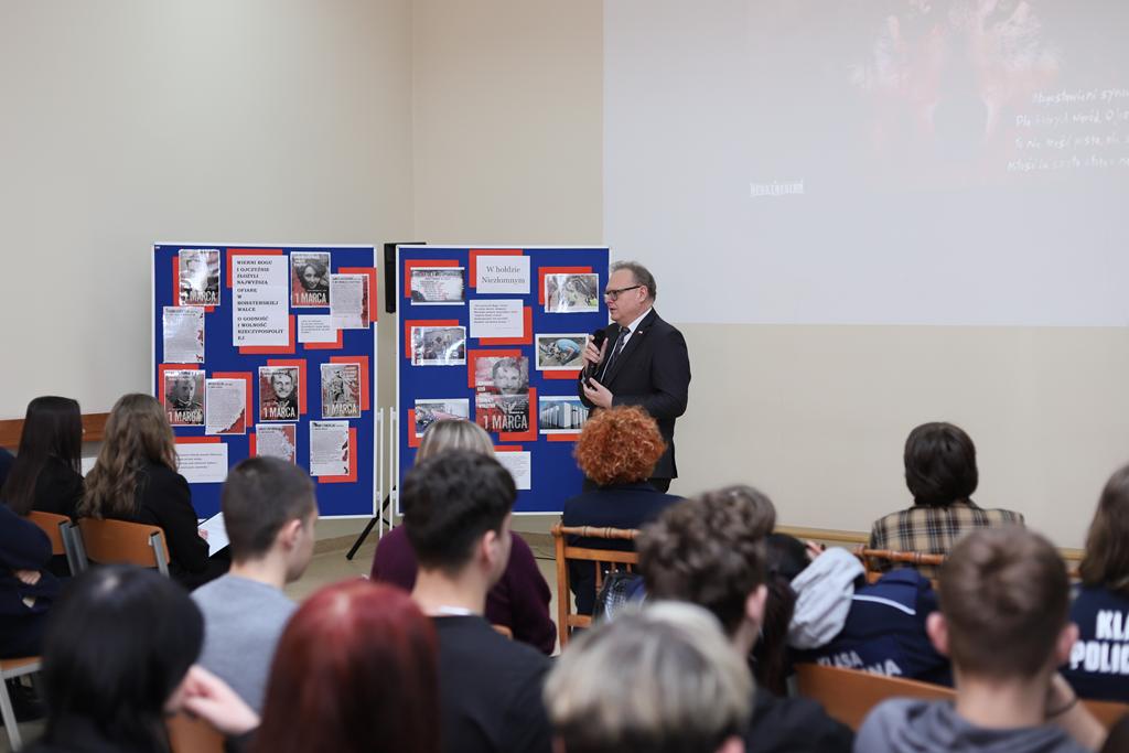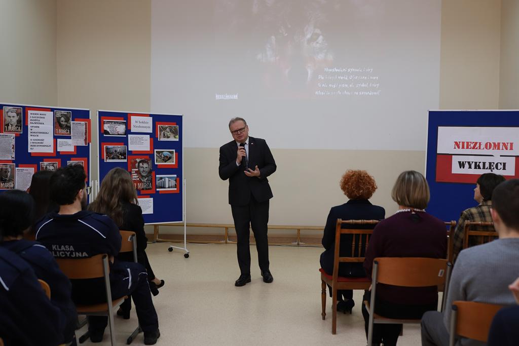 Pani wicedyrektor Maria Gawryś , dziękując panu Dyrektorowi Oddziału IPN w Białymstoku za interesujący wykład i wieloletnią współpracę w organizacji szkolnych obchodów tego narodowego święta , podkreśliła wagę faktu , że dziś młodzi ludzie mogą uczyć się o Żołnierzach Niezłomnych, bo w czasach jej edukacji szkolnej było to niemożliwe.