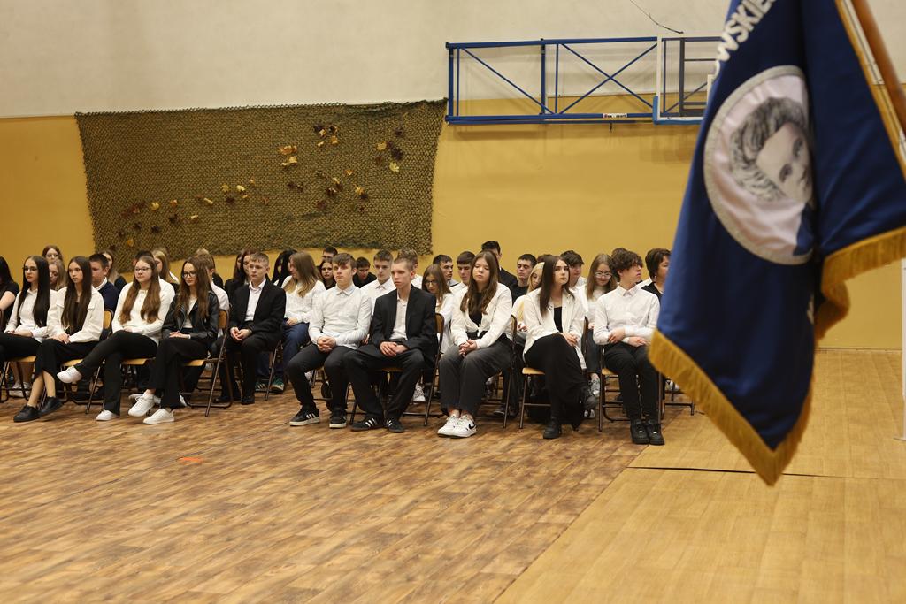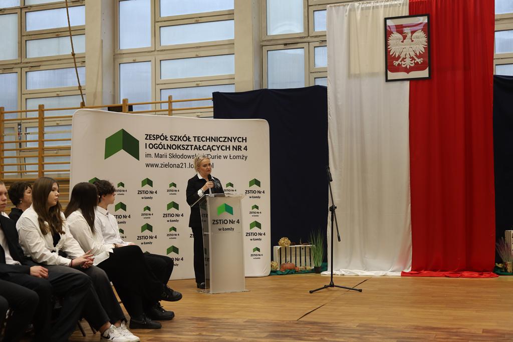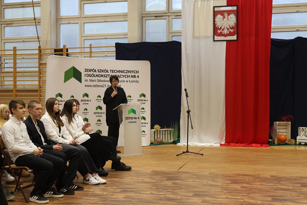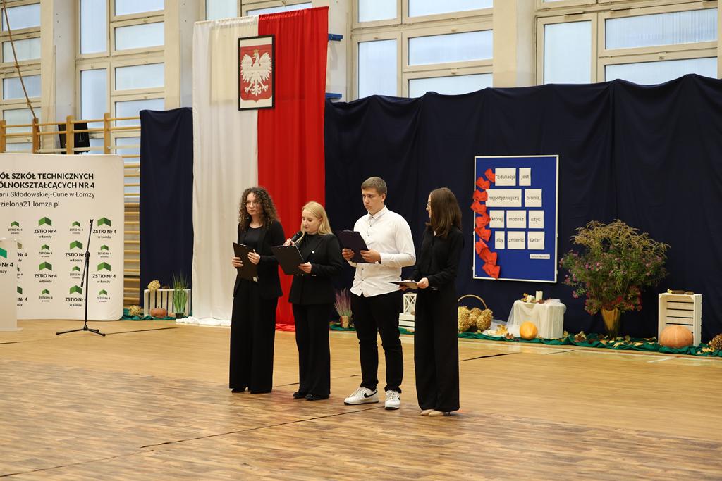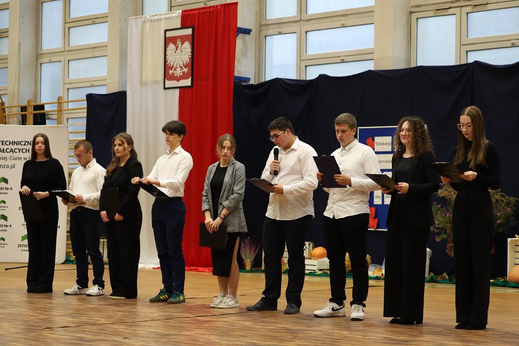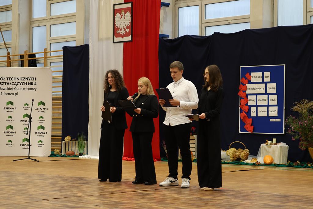 W dniu 24.10.2025 r. w Hali Sportowej ZSTiO Nr 4 w Łomży odbyła się podwójna uroczystość z okazji Ślubowania uczniów klas pierwszych oraz Dnia Edukacji Narodowej, popularnie zwanej Dniem Nauczyciela. Na spotkanie przybyli uczniowie, nauczyciele, rodzice oraz zaproszeni goście – młodszy inspektor Pan Piotr Klej oraz młodszy aspirant Pan Marcin Lipiński z Komendy Miejskiej Policji w Łomży, Pani Anna Dziemiańczuk, Komendant Ochotniczego Hufca Pracy w Łomży oraz Gwardian Klasztoru Zakonu Braci Mniejszych Kapucynów w Łomży i jednocześnie proboszcz naszej parafii, ojciec Michał Kulczycki.