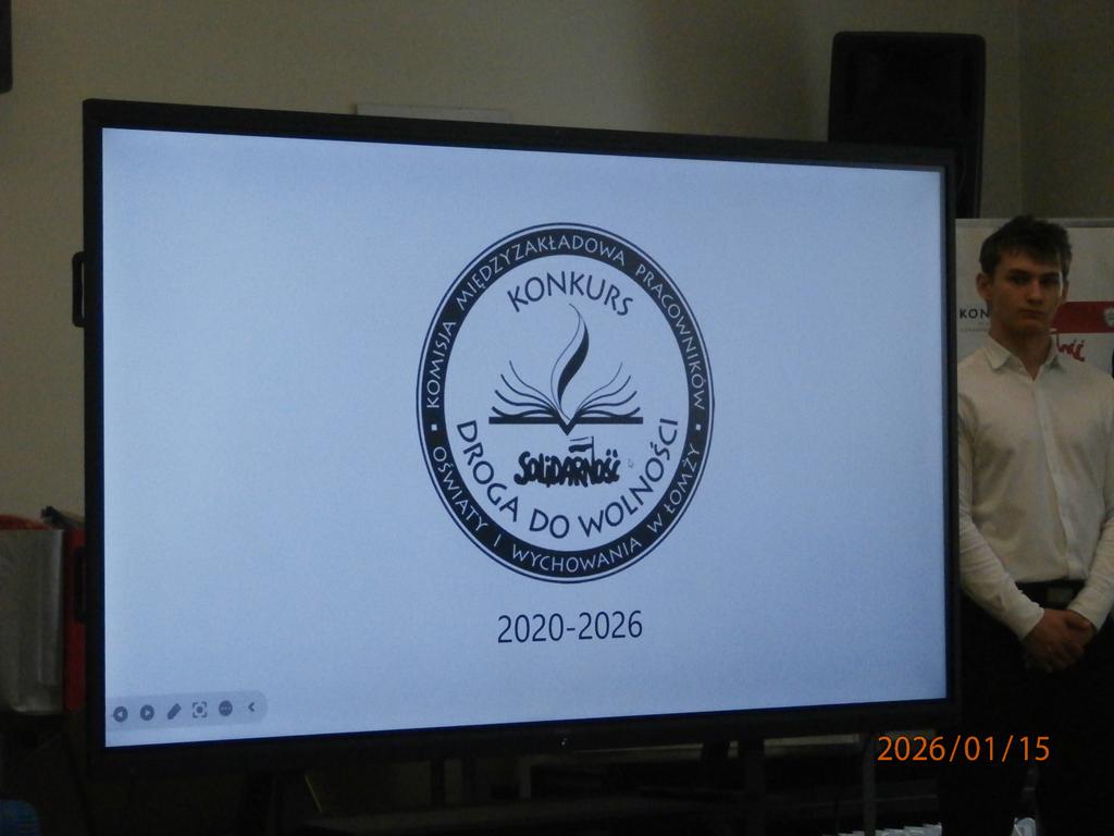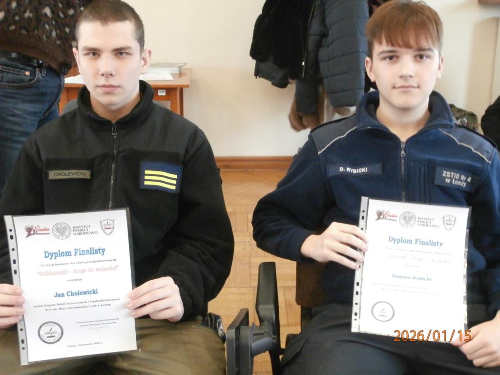 15 stycznia 2026r.w Centrum Edukacji Nauczycieli w Łomży odbyła się gala rozdania nagród i dyplomów laureatom i finalistom VI edycji Konkursu wiedzy „Solidarność-droga do wolności”. Wśród finalistów znaleźli się uczniowie naszej szkoły: Kamil Pianka z klasy 4PP i Damian Rybicki z klasy 4AP przygotowani przez panią Elżbietę Wiśniewską oraz Jan Cholewicki z klasy 3AW, który pracował pod kierunkiem pana Zenona Borawskiego.