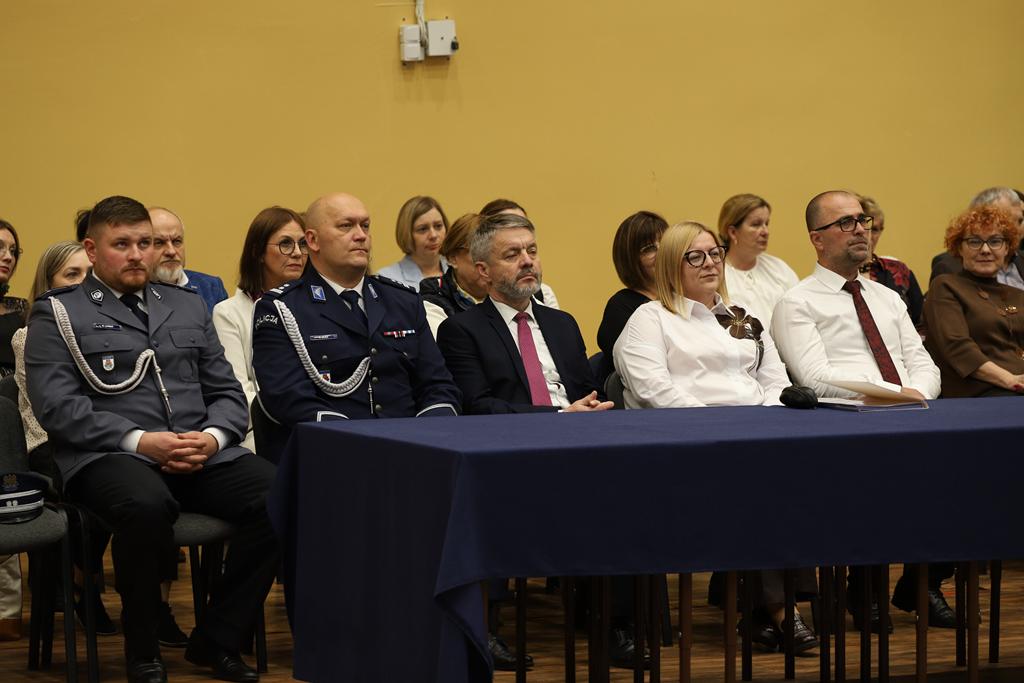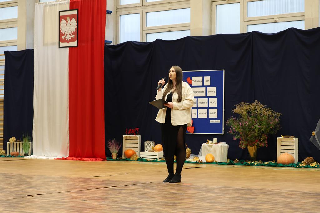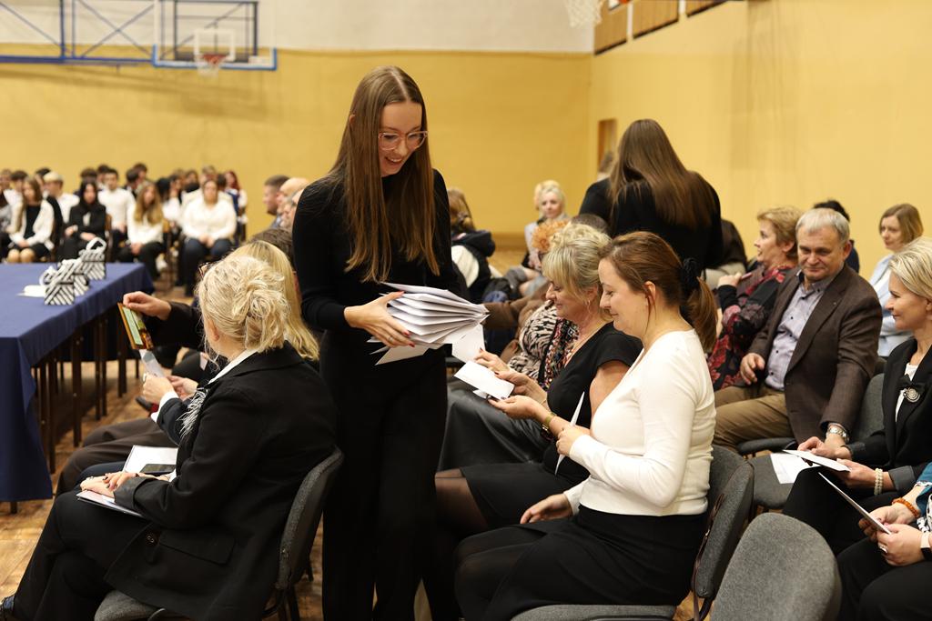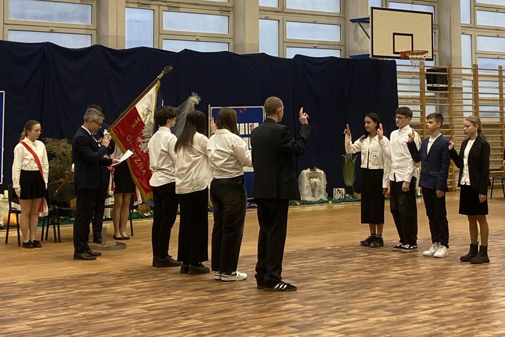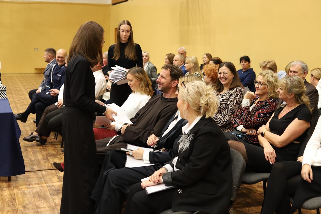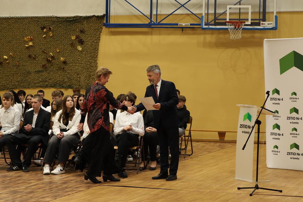 W dniu 24.10.2025 r. w Hali Sportowej ZSTiO Nr 4 w Łomży odbyła się podwójna uroczystość z okazji Ślubowania uczniów klas pierwszych oraz Dnia Edukacji Narodowej, popularnie zwanej Dniem Nauczyciela. Na spotkanie przybyli uczniowie, nauczyciele, rodzice oraz zaproszeni goście – młodszy inspektor Pan Piotr Klej oraz młodszy aspirant Pan Marcin Lipiński z Komendy Miejskiej Policji w Łomży, Pani Anna Dziemiańczuk, Komendant Ochotniczego Hufca Pracy w Łomży oraz Gwardian Klasztoru Zakonu Braci Mniejszych Kapucynów w Łomży i jednocześnie proboszcz naszej parafii, ojciec Michał Kulczycki.