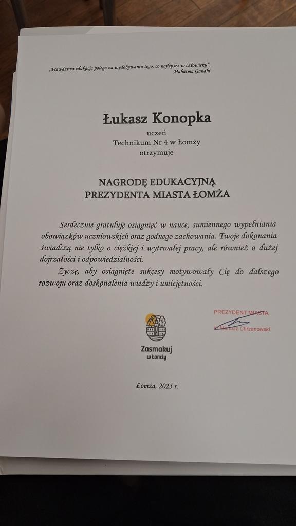 W dniu 30.10. w sali gimnastycznej Szkoły Podstawowej nr 1 w Łomży odbyło się wręczenie nagród edukacyjnych Prezydenta Łomży. Nagrodę otrzymała Dominika Pogroszewska z klasy 2 AP IV LO oraz Łukasz Konopka absolwent Technikum nr 4 w zawodzie technik budownictwa.