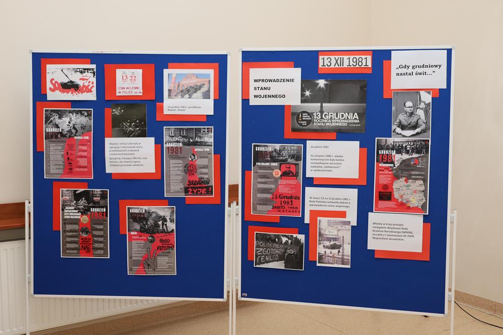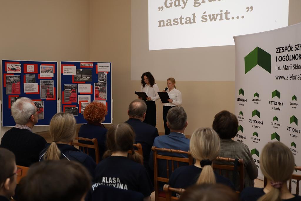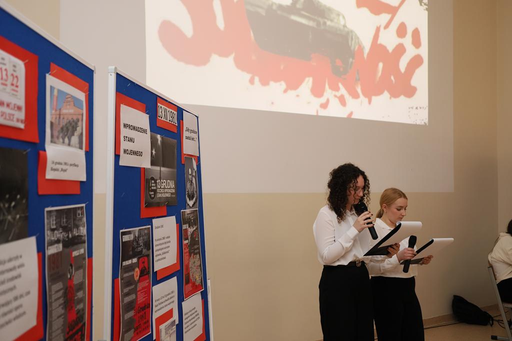 Utwór Przemysława Gintrowskiego „A my nie chcemy…” wprowadził wszystkich w klimat tamtych dramatycznych czasów. Uczennice - Zosia Cwalina i Natalia Mierzejewski z kl. 4PP - prowadzące program historyczno-muzyczny nakreśliły okoliczności wprowadzenia, represje i terror władz komunistycznych, opór opozycji i społeczeństwa polskiego w okresie stanu wojennego, trwającego od 13 grudnia 1981r. do 22 lipca 1983r. Narrację wzbogacały utwory muzyczne Jacka Kaczmarskiego ”Obława” oraz Przemysława Gintrowskiego, Jacka Kaczmarskiego i Zbigniewa Łapińskiego - „Modlitwa wschodzie słońca” z videoklipami obrazującymi tragizm wydarzeń, które wtedy miały miejsce w Polsce.