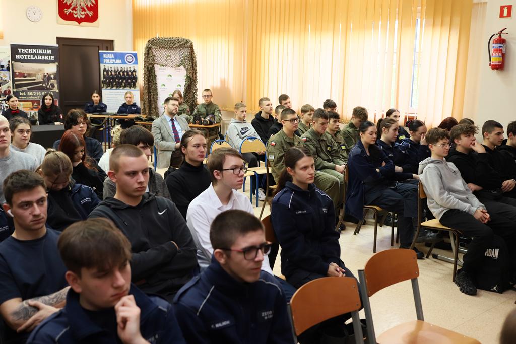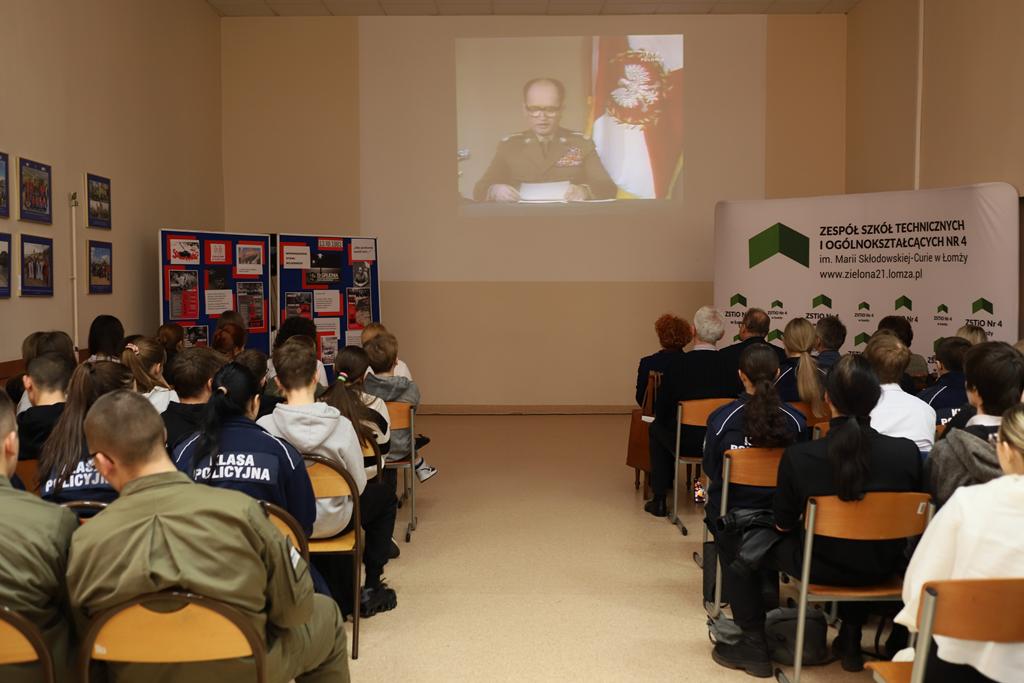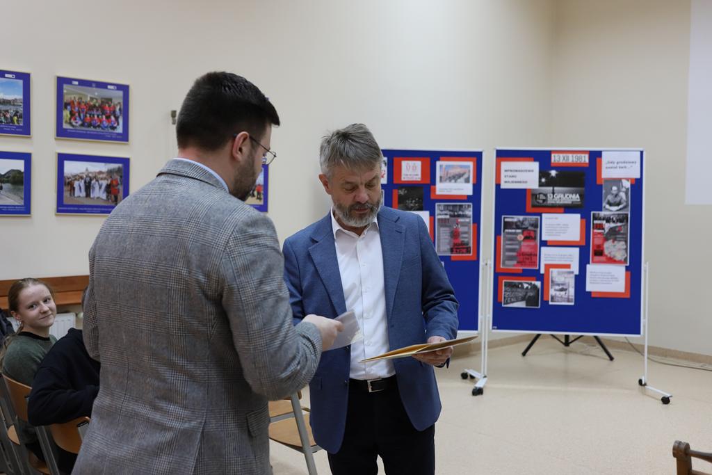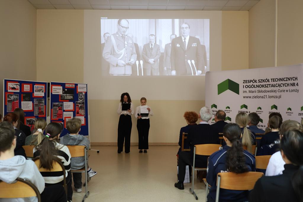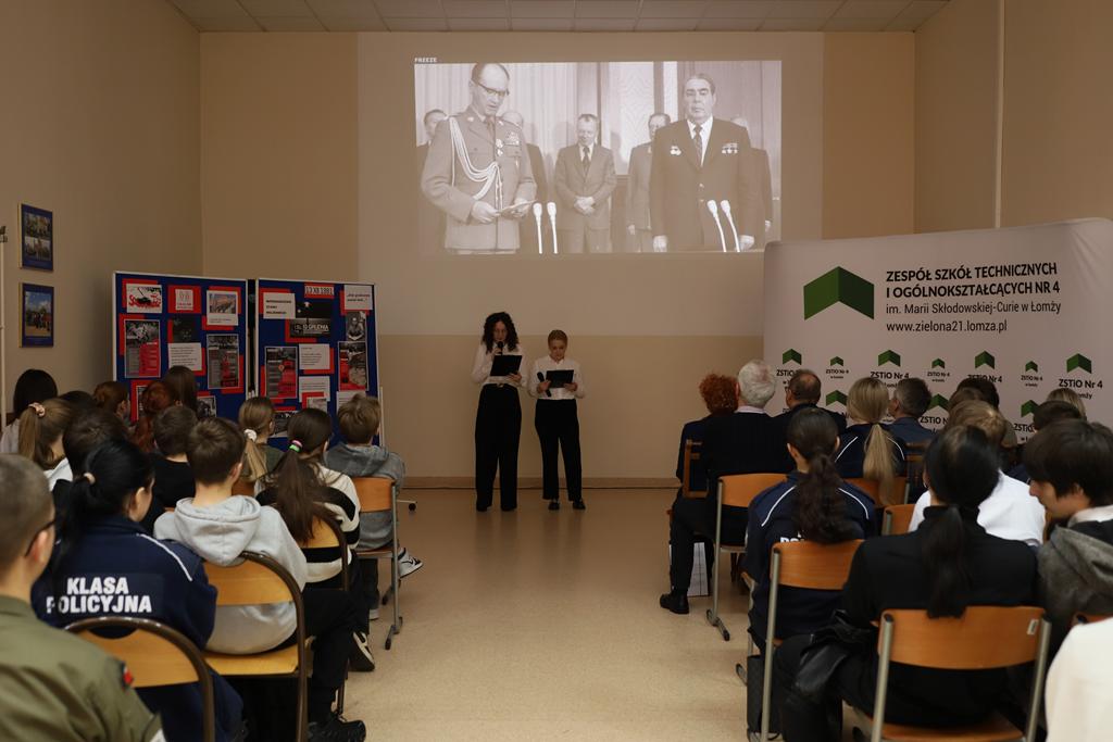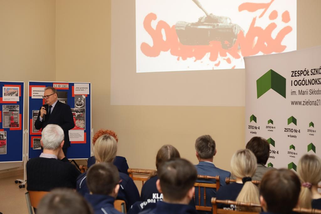 Kluczowym punktem uroczystości był wykład pana doktora habilitowanego Krzysztofa Sychowicza Dyrektora Oddziału Instytutu Pamięci Narodowej w Białymstoku. Prelegent bardzo sugestywnie przybliżył przyczyny wprowadzenia, realia i tragiczne skutki decyzji władz komunistycznych z 13 grudnia 1981 r w aspekcie ogólnopolskim i regionalnym. Podzielił się też osobistymi refleksjami i przeżyciami związanymi z 13 grudnia 1981r. Na przykładach rodzin aresztowanych i internowanych członków łomżyńskiej Solidarności podkreślił dramat tych osób i ich bliskich w okresie stanu wojennego. Prelekcja była inspirująca dla młodzieży. Uświadomiła jej jak trudno jest walczyć o wartości, mając przed sobą wybór „ prawda albo przetrwanie”.