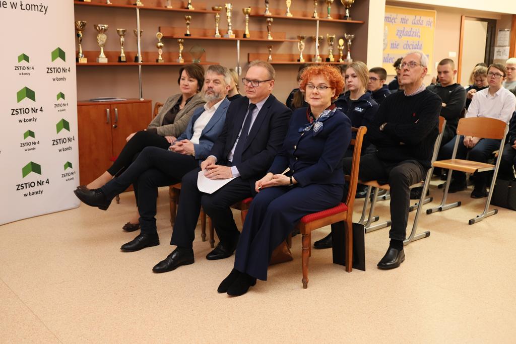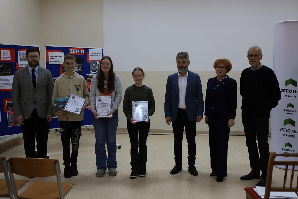 Następnie ósmoklasiści ze Szkoły Podstawowej Nr 9 w Łomży wraz z opiekunem wzięli udział w warsztatach historycznych z wykorzystaniem przygotowanej prezentacji i mapy myśli „Stan wojenny”. Uczestniczyli także w promocji kierunków kształcenia w naszym zespole. Na zakończenie troje ósmoklasistów otrzymało wyróżnienia i nagrody za najlepiej wykonane prace na warsztatach historycznych, a ich opiekun podziękowanie.