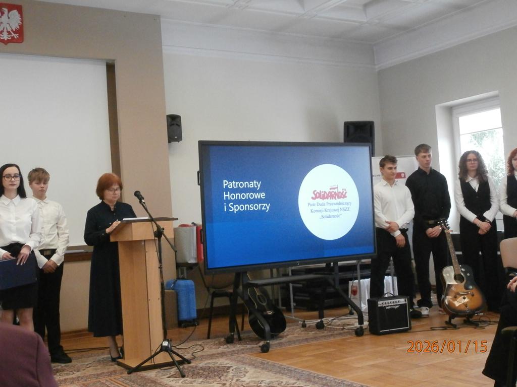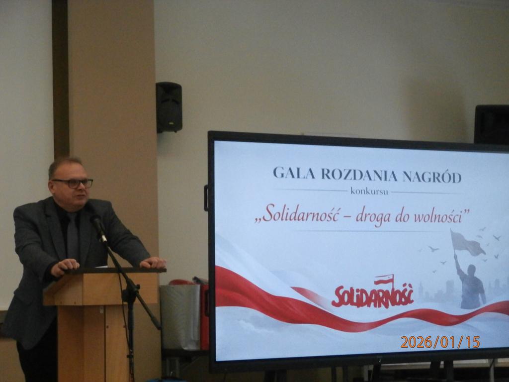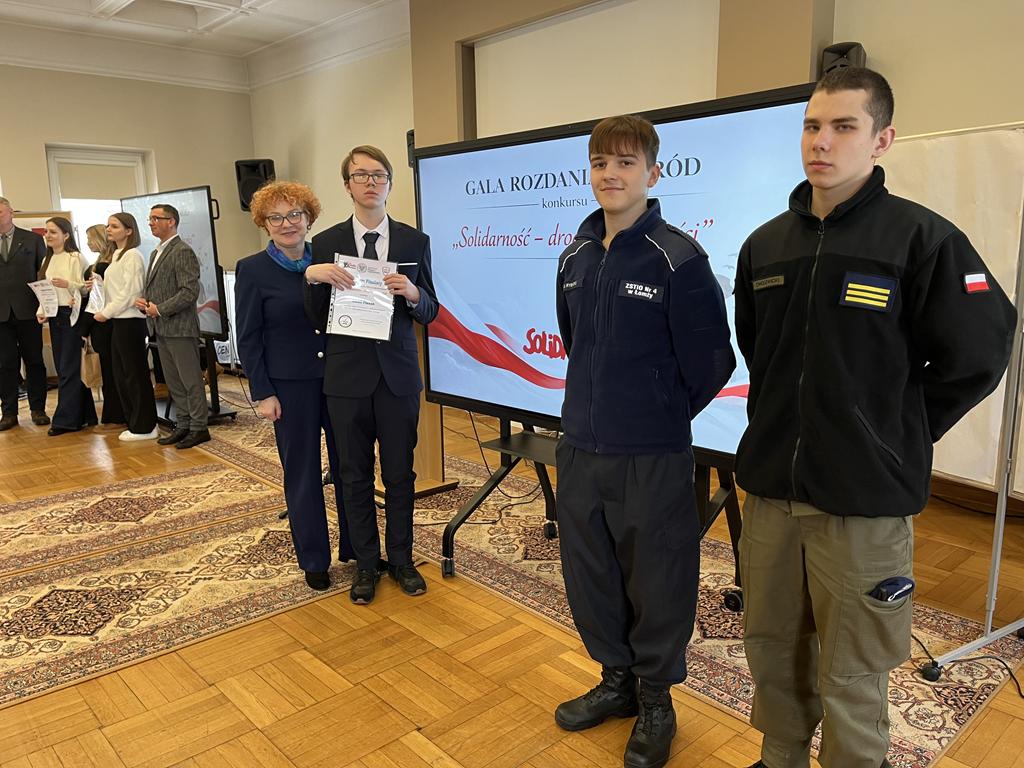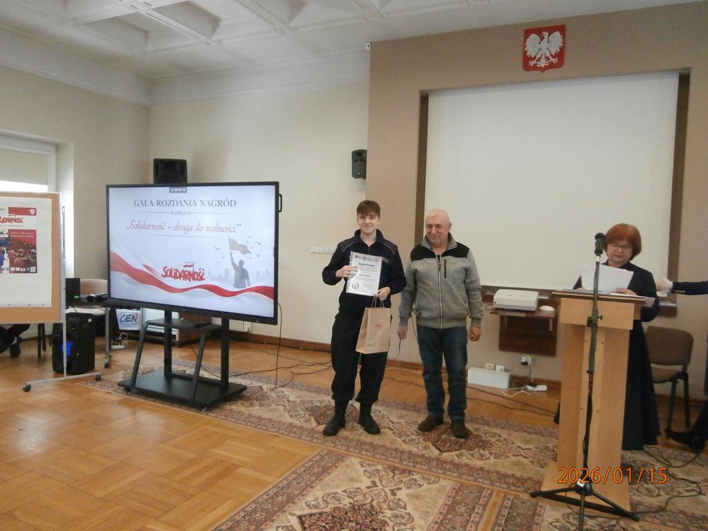15 stycznia 2026r.w Centrum Edukacji Nauczycieli w Łomży odbyła się gala rozdania nagród i dyplomów laureatom i finalistom VI edycji Konkursu wiedzy „Solidarność-droga do wolności”. Wśród finalistów znaleźli się uczniowie naszej szkoły: Kamil Pianka z klasy 4PP i Damian Rybicki z klasy 4AP przygotowani przez panią Elżbietę Wiśniewską oraz Jan Cholewicki z klasy 3AW, który pracował pod kierunkiem pana Zenona Borawskiego.